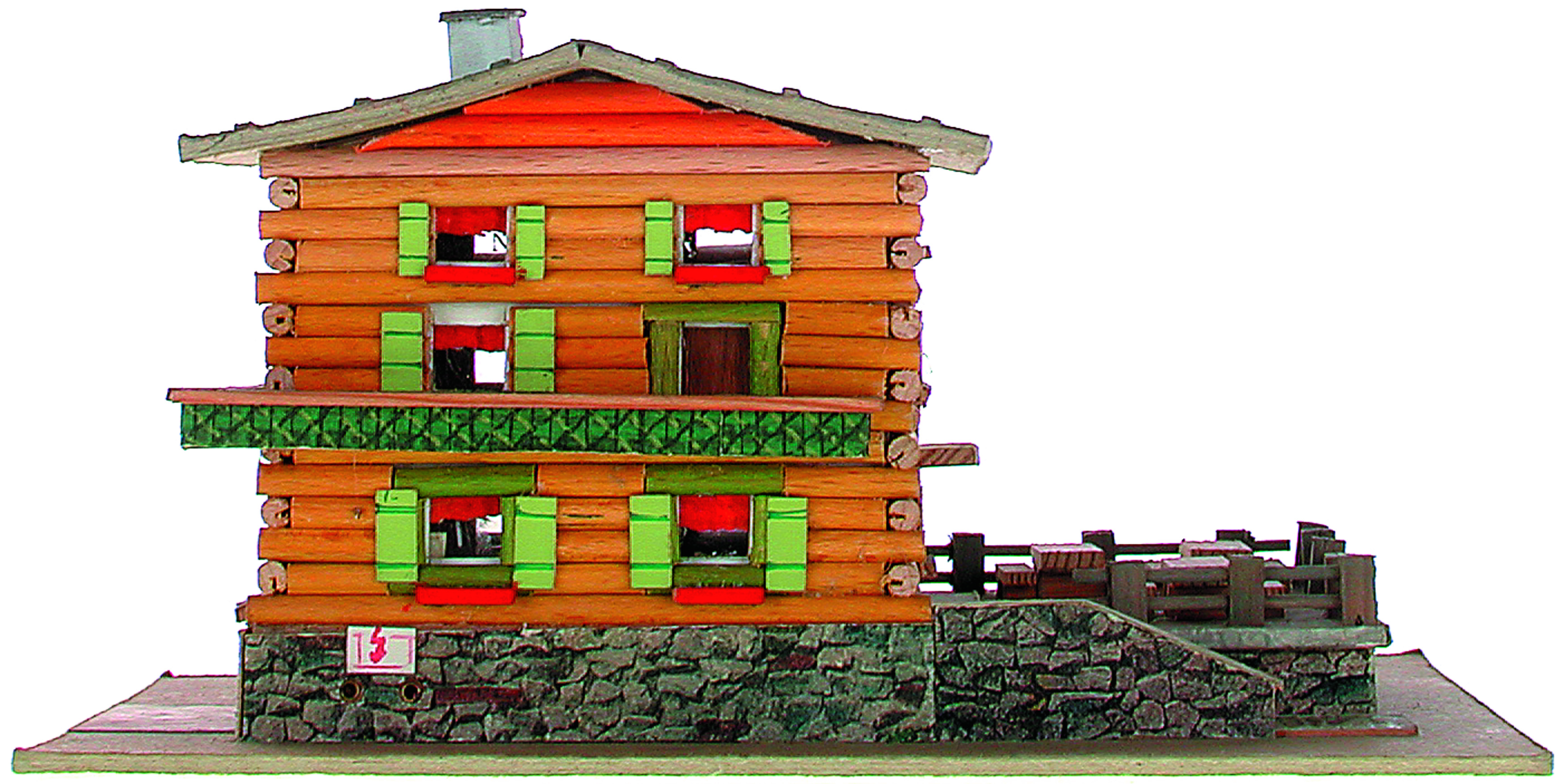Anmerkung der Redaktion: Nicht von jedem Haus sind alle einzelnen verwendeten Materialien dokumentiert. Tatsächlich verbaute der Bastler auch Zigarettenschachteln, Spinnenpapier, Pappmaschee, Tapetenreste, Bunt- und Silberpapiere, Stoffe, Synthetikfasern, d-c-fix-Folien, Schriftproben, Zeitungsschnipsel und ausgewertete Illustrierte, Kartonagen, Holzabfälle aller Art, Uhu, Holzleim und Tapetenkleister.