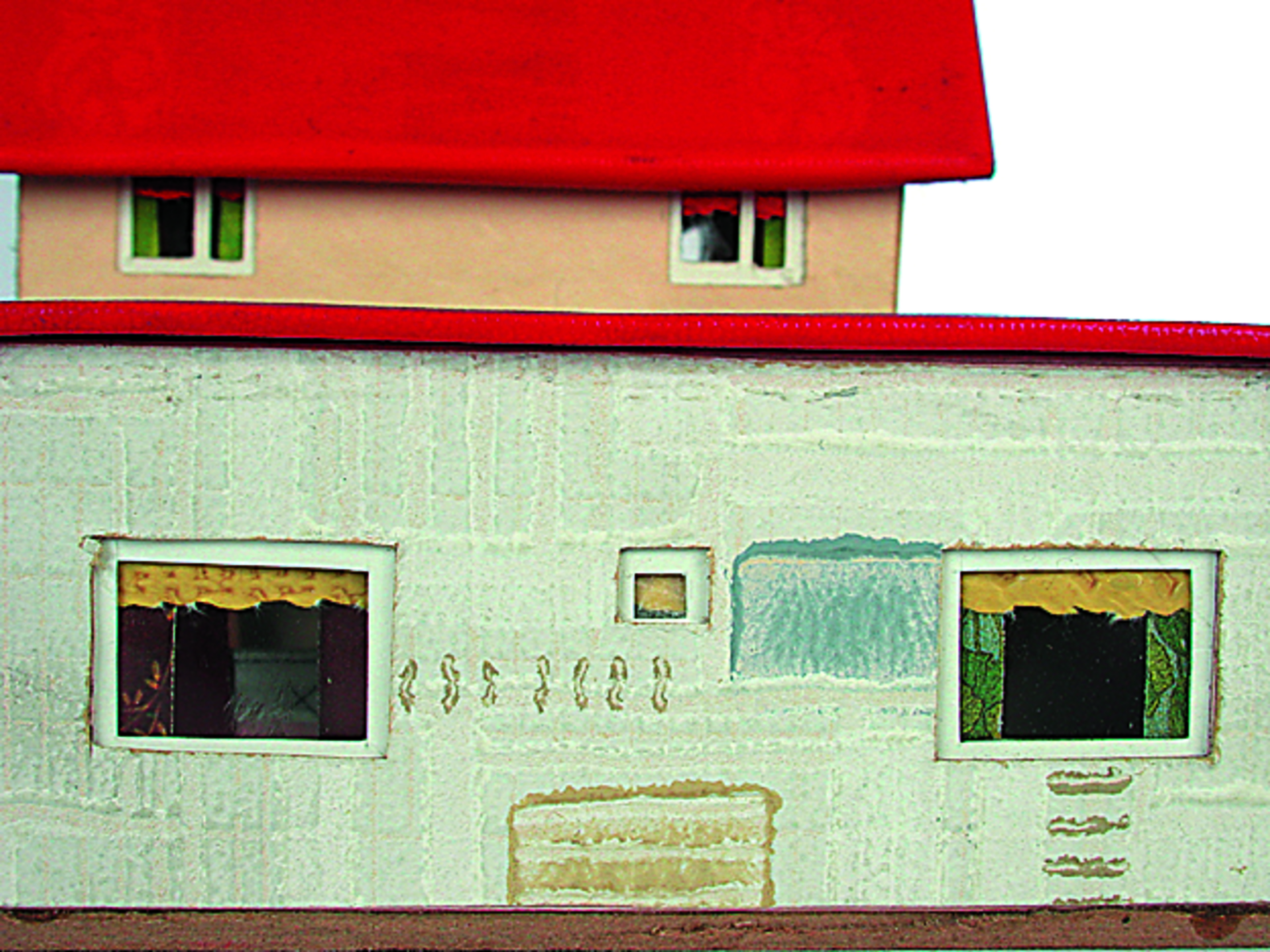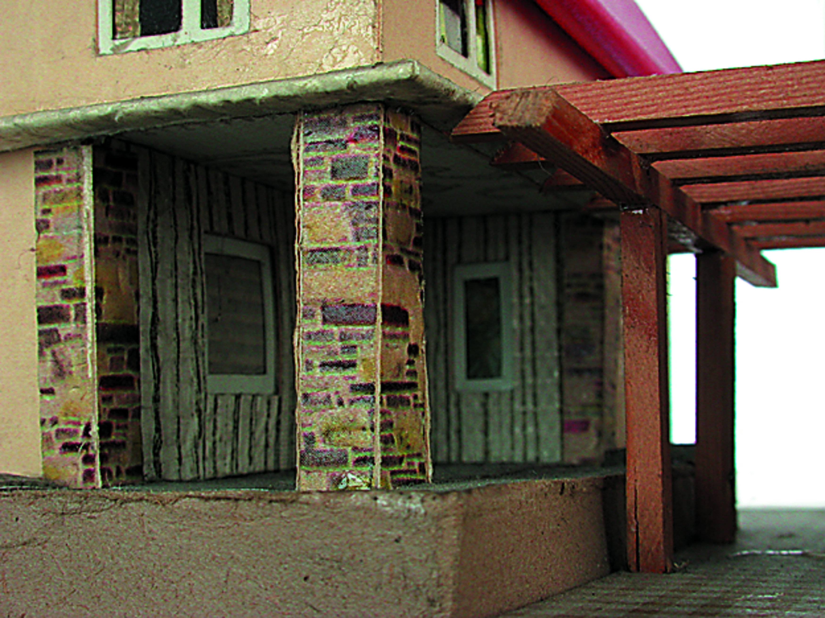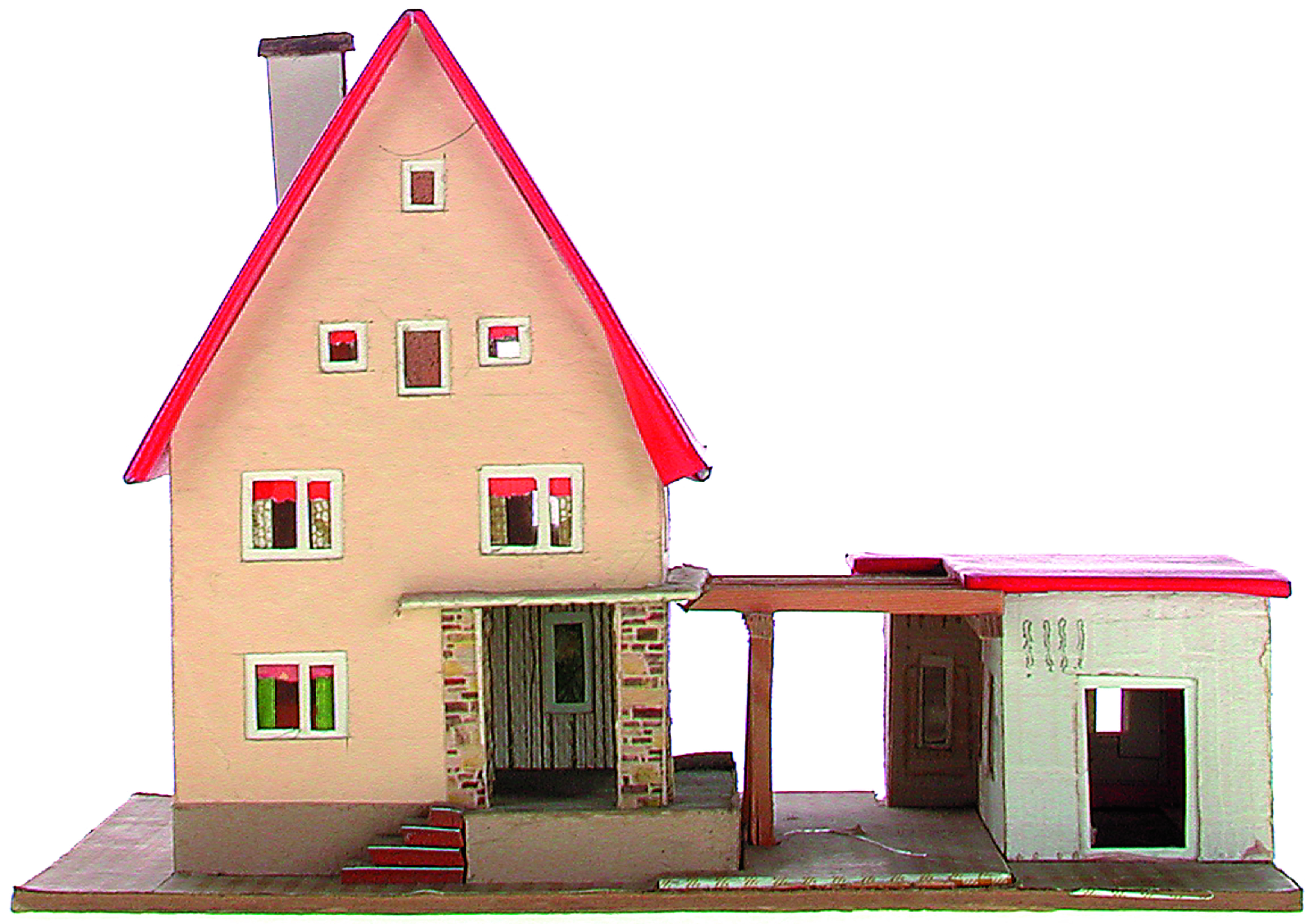 Anmerkung der Redaktion: Nicht von jedem Haus sind alle einzelnen verwendeten Materialien dokumentiert. Tatsächlich verbaute der Bastler auch Zigarettenschachteln, Spinnenpapier, Pappmaschee, Tapetenreste, Bunt- und Silberpapiere, Stoffe, Synthetikfasern, d-c-fix-Folien, Schriftproben, Zeitungsschnipsel und ausgewertete Illustrierte, Kartonagen, Holzabfälle aller Art, Uhu, Holzleim und Tapetenkleister.