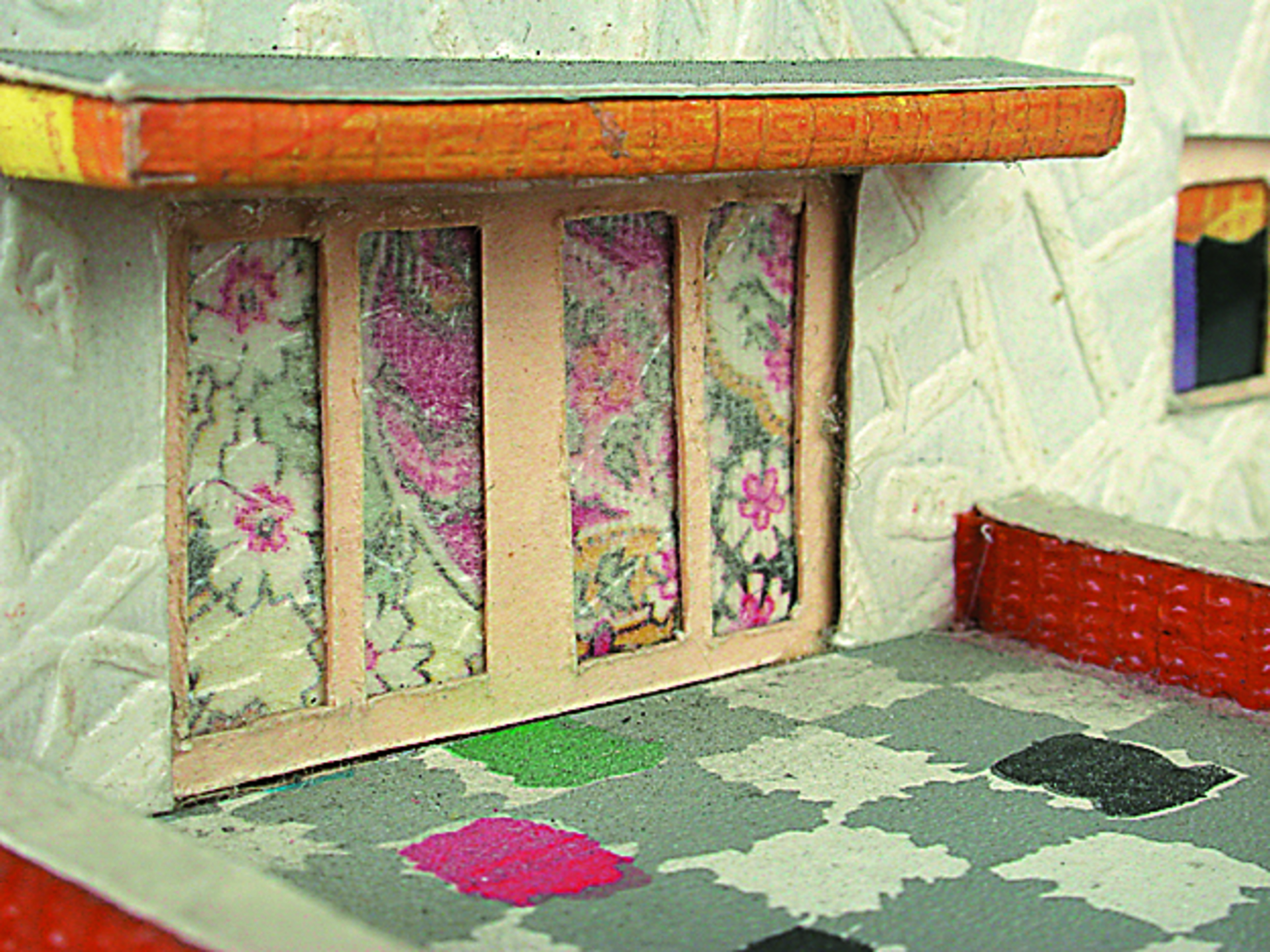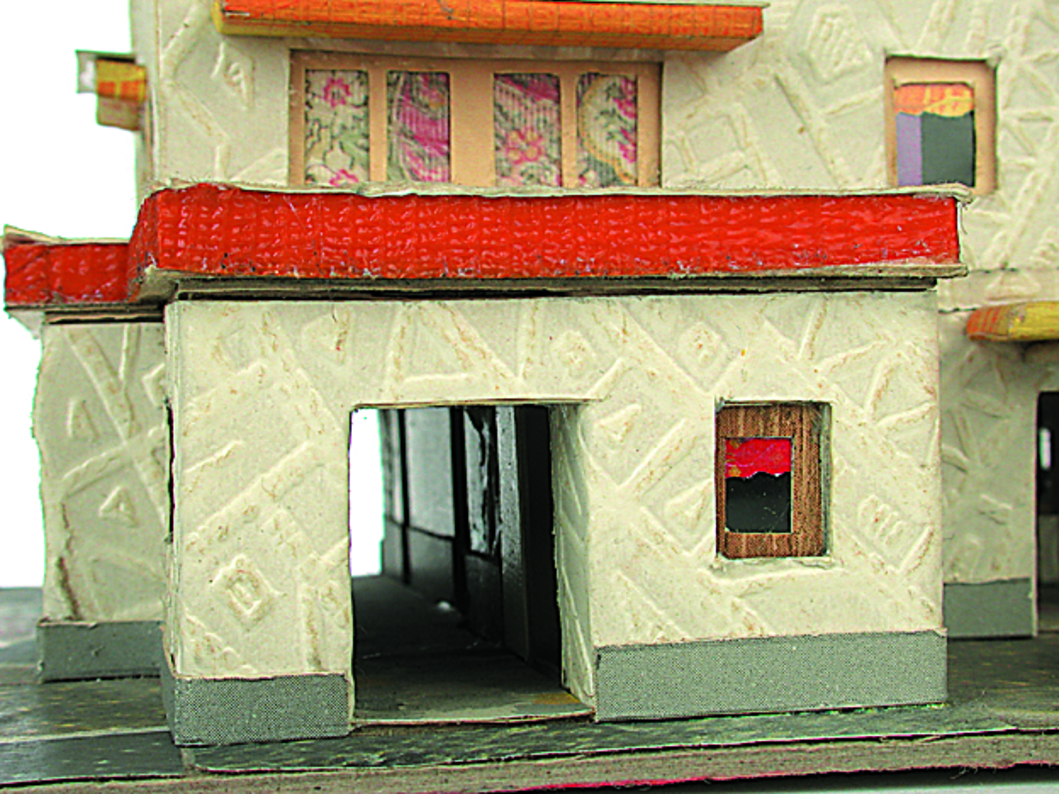 Anmerkung der Redaktion: Nicht von jedem Haus sind alle einzelnen verwendeten Materialien dokumentiert. Tatsächlich verbaute der Bastler auch Zigarettenschachteln, Spinnenpapier, Pappmaschee, Tapetenreste, Bunt- und Silberpapiere, Stoffe, Synthetikfasern, d-c-fix-Folien, Schriftproben, Zeitungsschnipsel und ausgewertete Illustrierte, Kartonagen, Holzabfälle aller Art, Uhu, Holzleim und Tapetenkleister.
