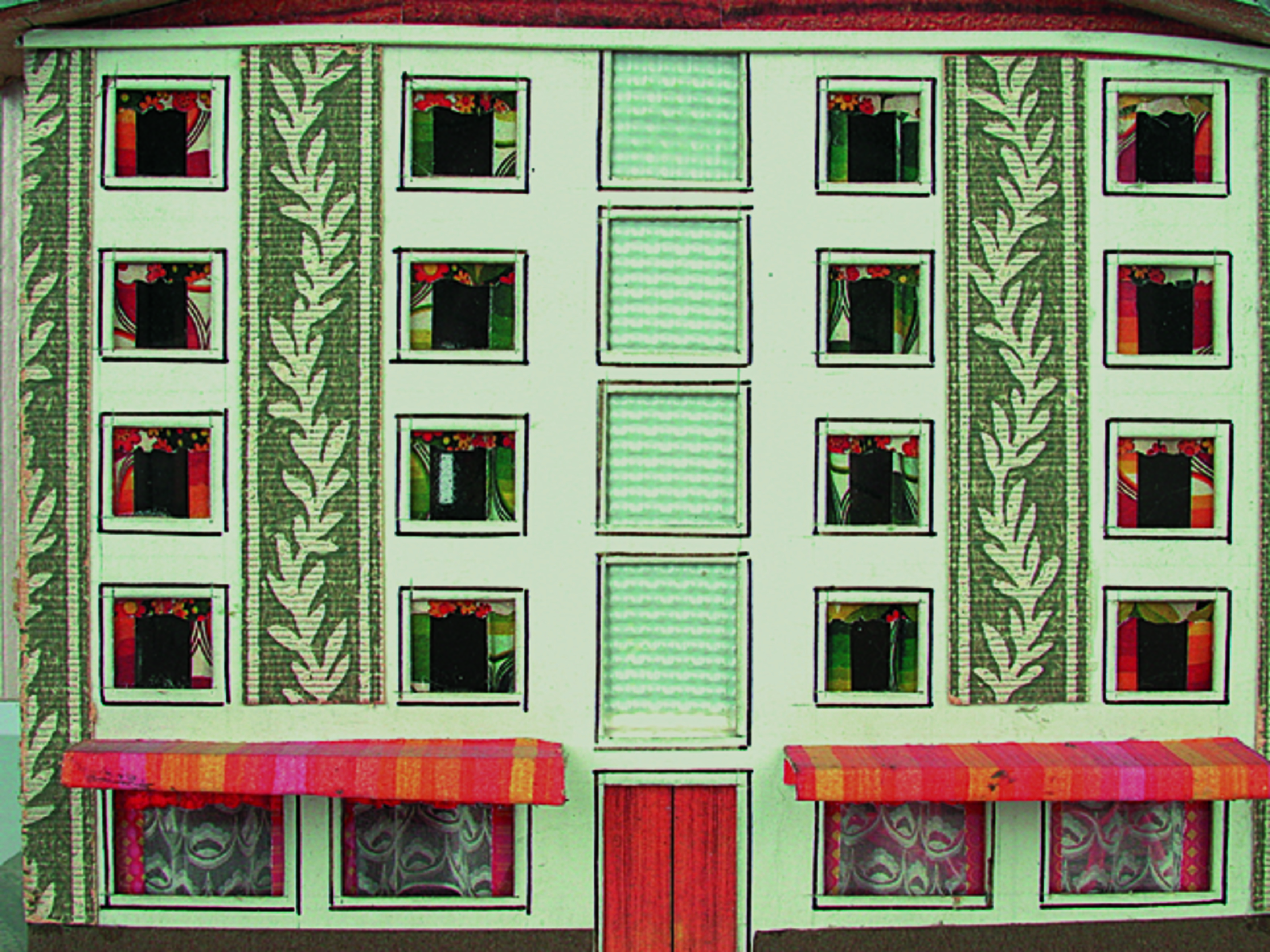 Anmerkung der Redaktion: Nicht von jedem Haus sind alle einzelnen verwendeten Materialien dokumentiert. Tatsächlich verbaute der Bastler auch Zigarettenschachteln, Spinnenpapier, Pappmaschee, Tapetenreste, Bunt- und Silberpapiere, Stoffe, Synthetikfasern, d-c-fix-Folien, Schriftproben, Zeitungsschnipsel und ausgewertete Illustrierte, Kartonagen, Holzabfälle aller Art, Uhu, Holzleim und Tapetenkleister.