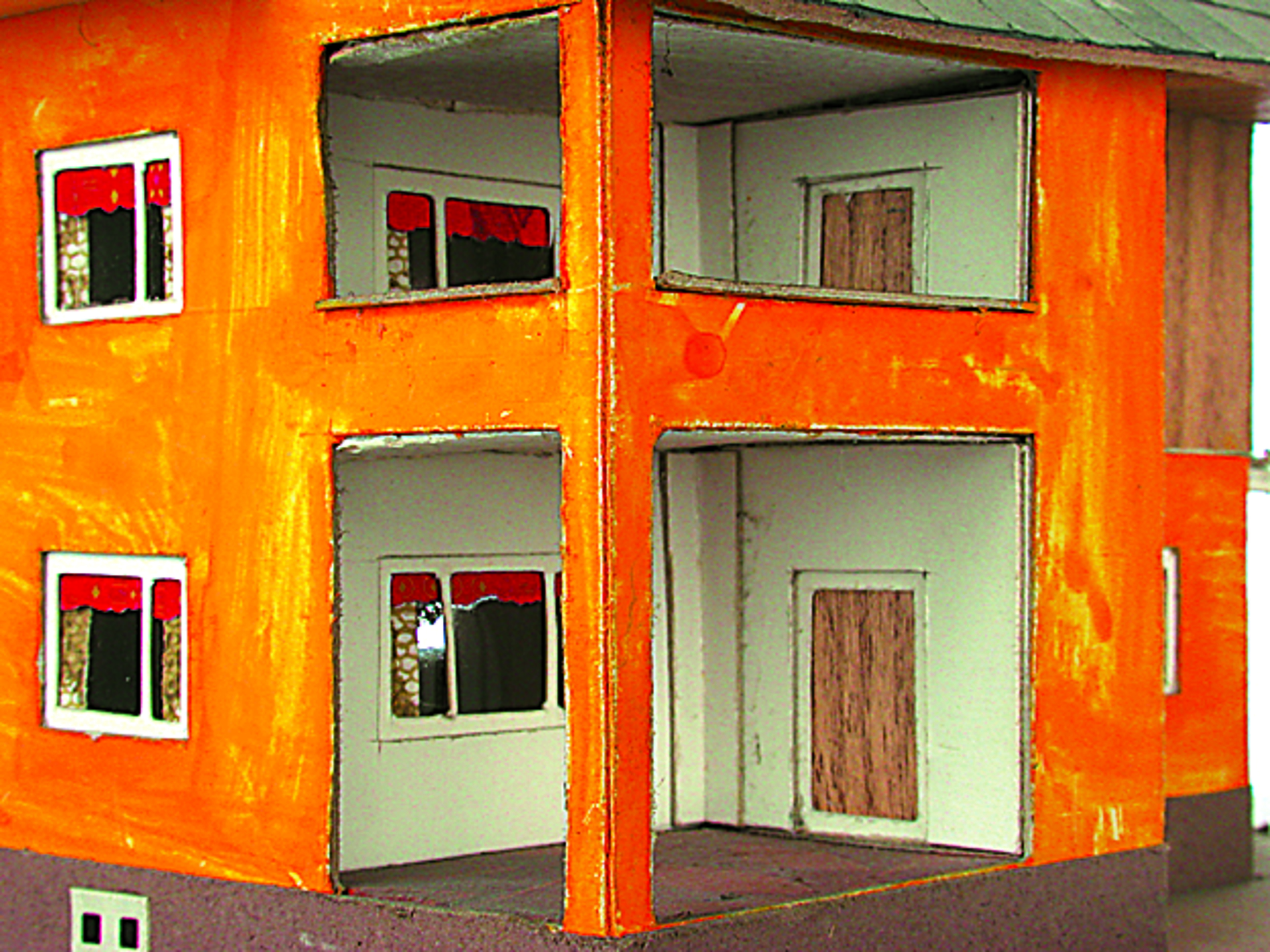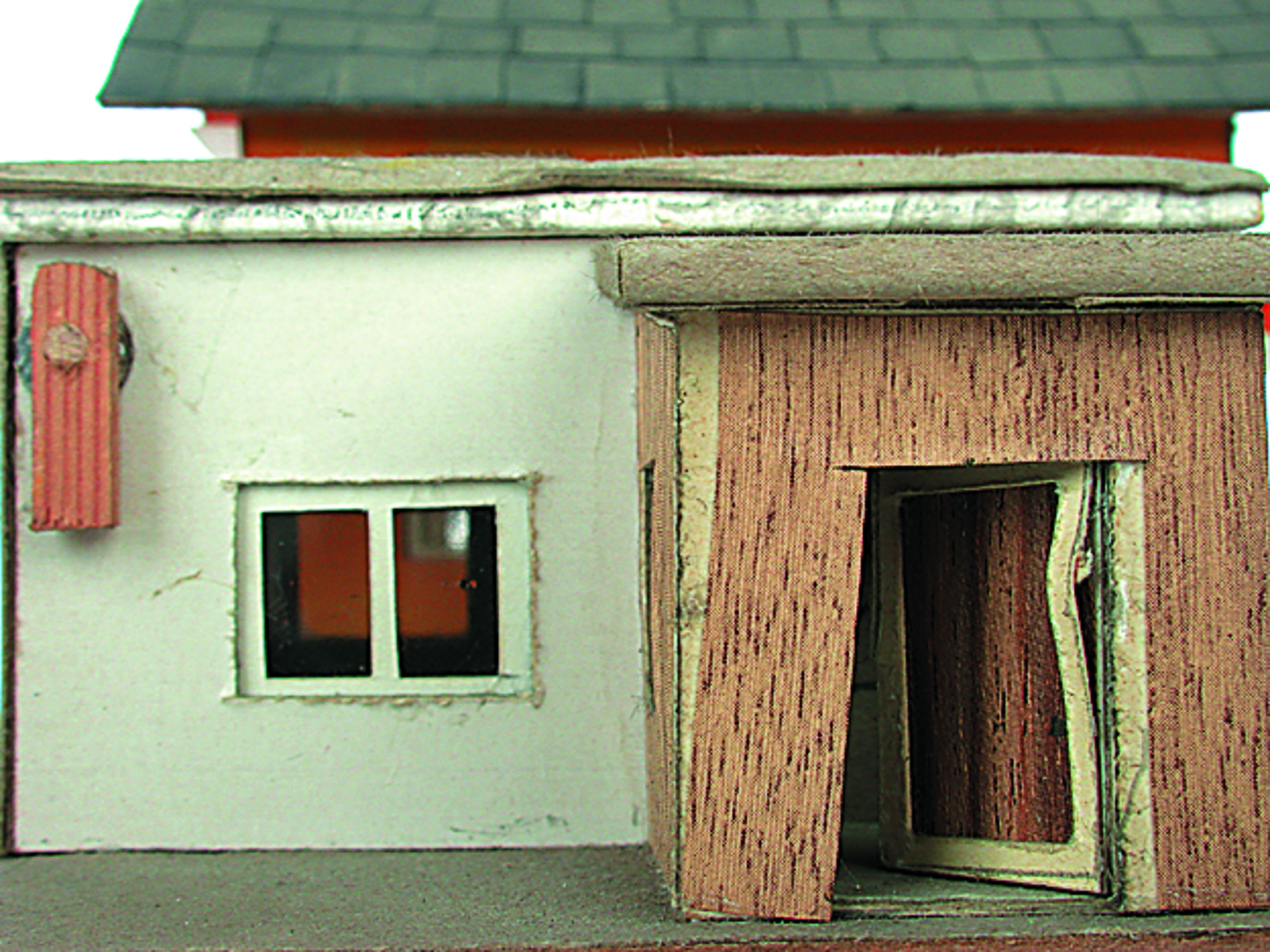 Anmerkung der Redaktion: Nicht von jedem Haus sind alle einzelnen verwendeten Materialien dokumentiert. Tatsächlich verbaute der Bastler auch Zigarettenschachteln, Spinnenpapier, Pappmaschee, Tapetenreste, Bunt- und Silberpapiere, Stoffe, Synthetikfasern, d-c-fix-Folien, Schriftproben, Zeitungsschnipsel und ausgewertete Illustrierte, Kartonagen, Holzabfälle aller Art, Uhu, Holzleim und Tapetenkleister.