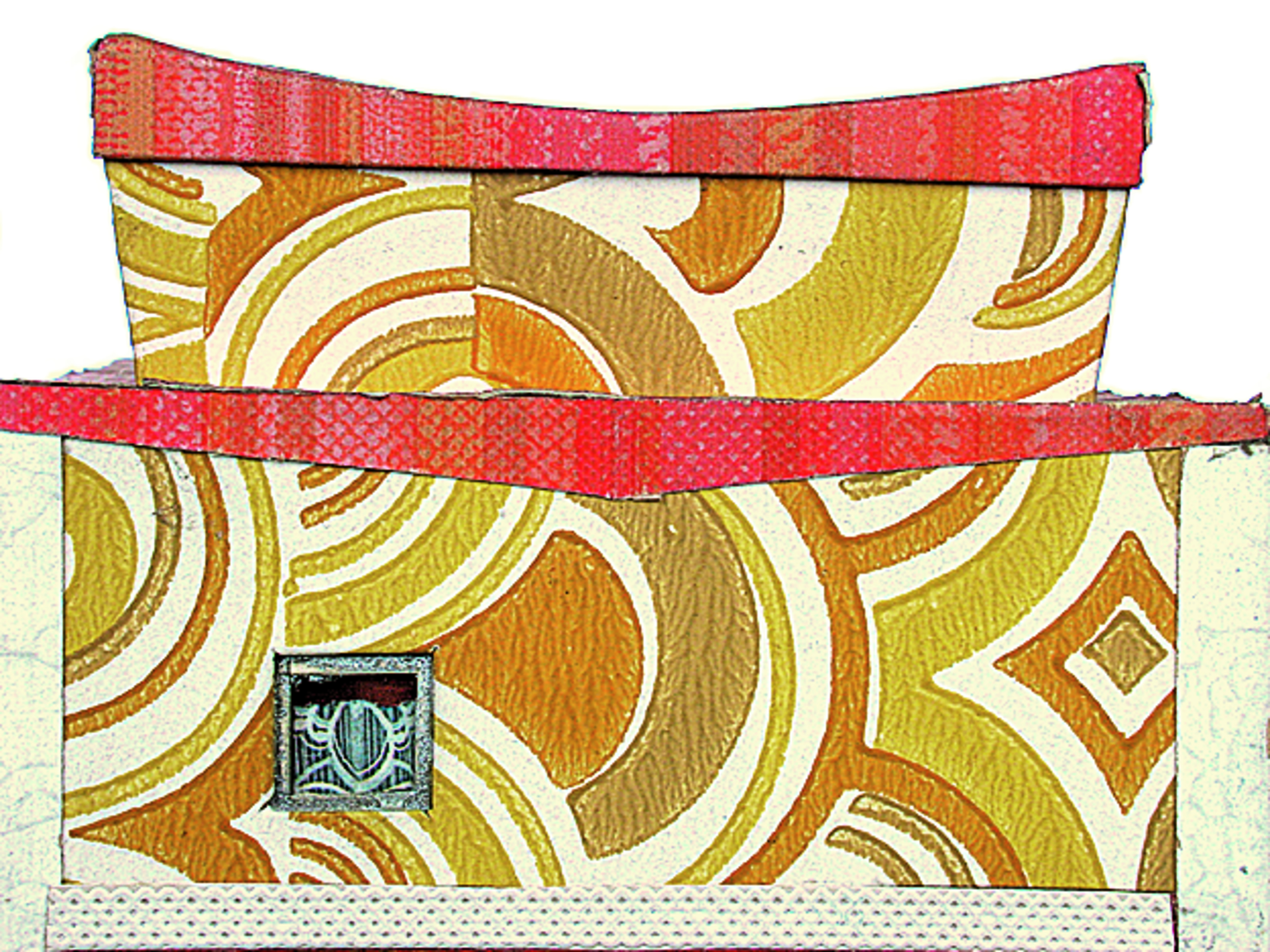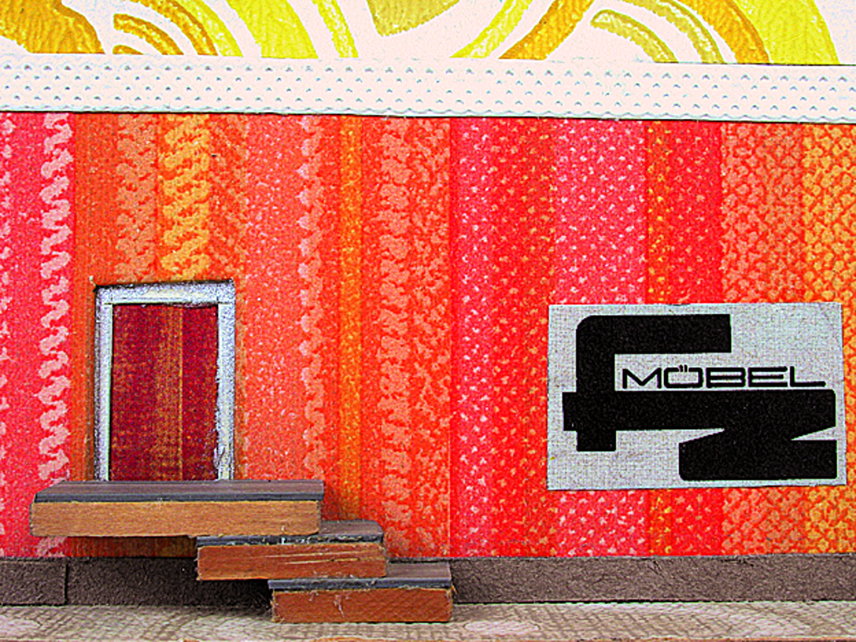 Anmerkung der Redaktion: Nicht von jedem Haus sind alle einzelnen verwendeten Materialien dokumentiert. Tatsächlich verbaute der Bastler auch Zigarettenschachteln, Spinnenpapier, Pappmaschee, Tapetenreste, Bunt- und Silberpapiere, Stoffe, Synthetikfasern, d-c-fix-Folien, Schriftproben, Zeitungsschnipsel und ausgewertete Illustrierte, Kartonagen, Holzabfälle aller Art, Uhu, Holzleim und Tapetenkleister.