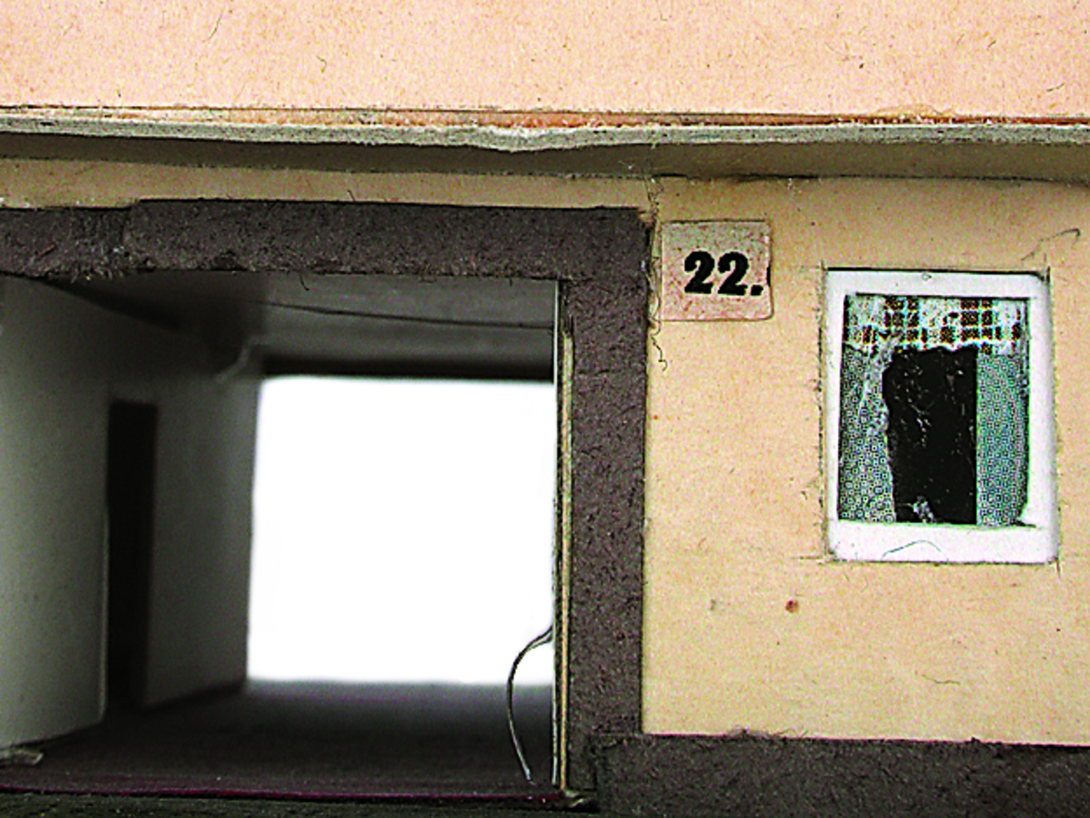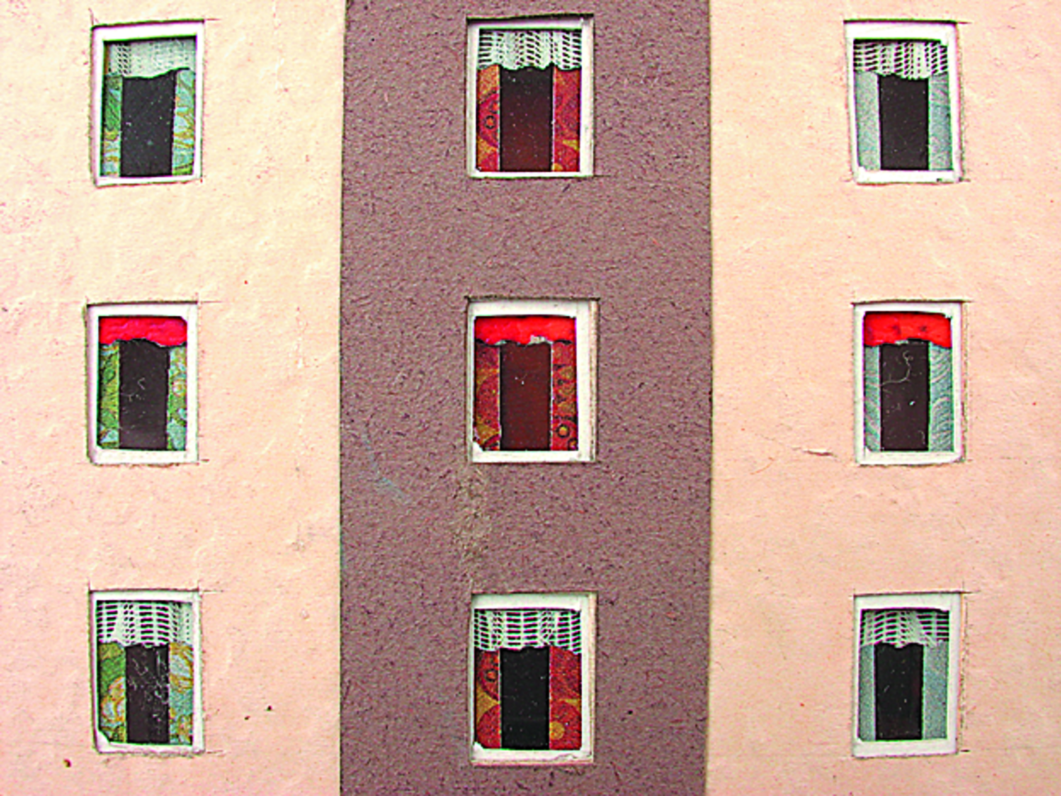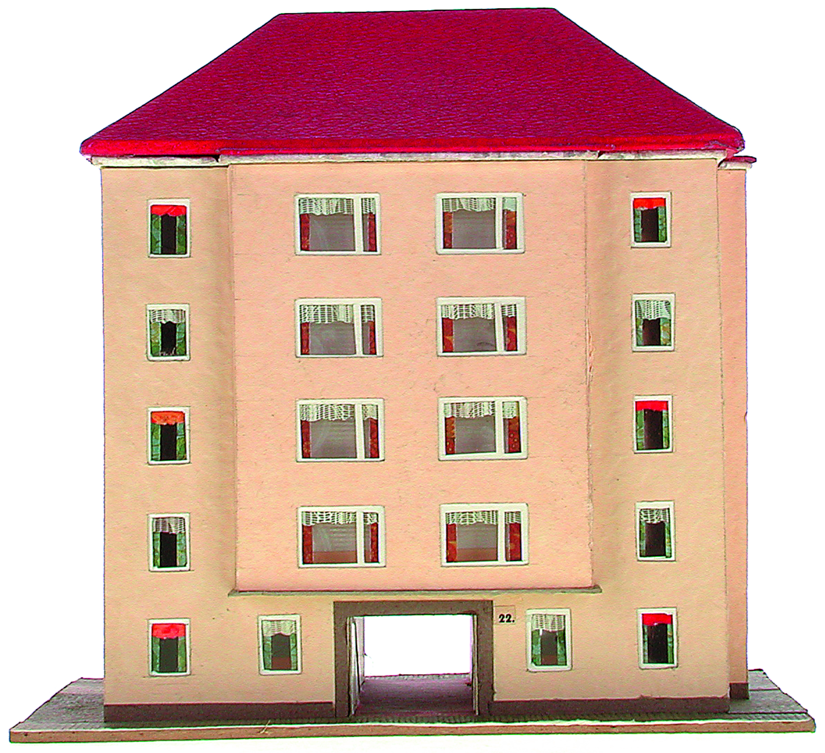 Anmerkung der Redaktion: Nicht von jedem Haus sind alle einzelnen verwendeten Materialien dokumentiert. Tatsächlich verbaute der Bastler auch Zigarettenschachteln, Spinnenpapier, Pappmaschee, Tapetenreste, Bunt- und Silberpapiere, Stoffe, Synthetikfasern, d-c-fix-Folien, Schriftproben, Zeitungsschnipsel und ausgewertete Illustrierte, Kartonagen, Holzabfälle aller Art, Uhu, Holzleim und Tapetenkleister.