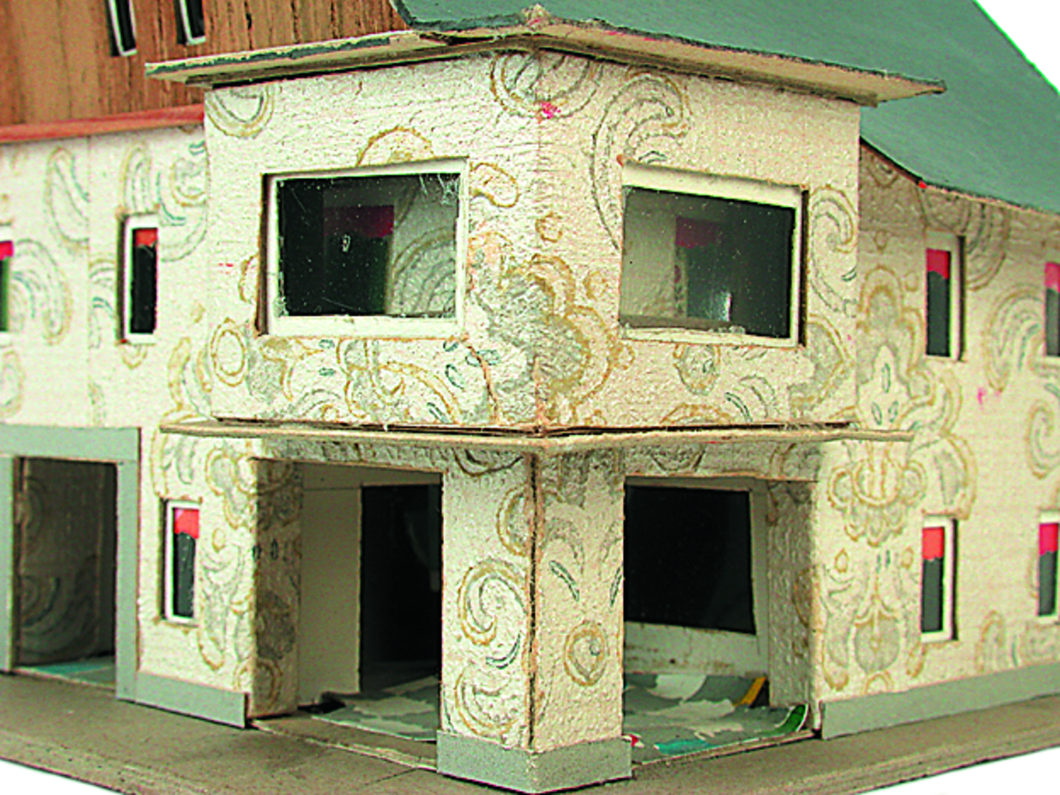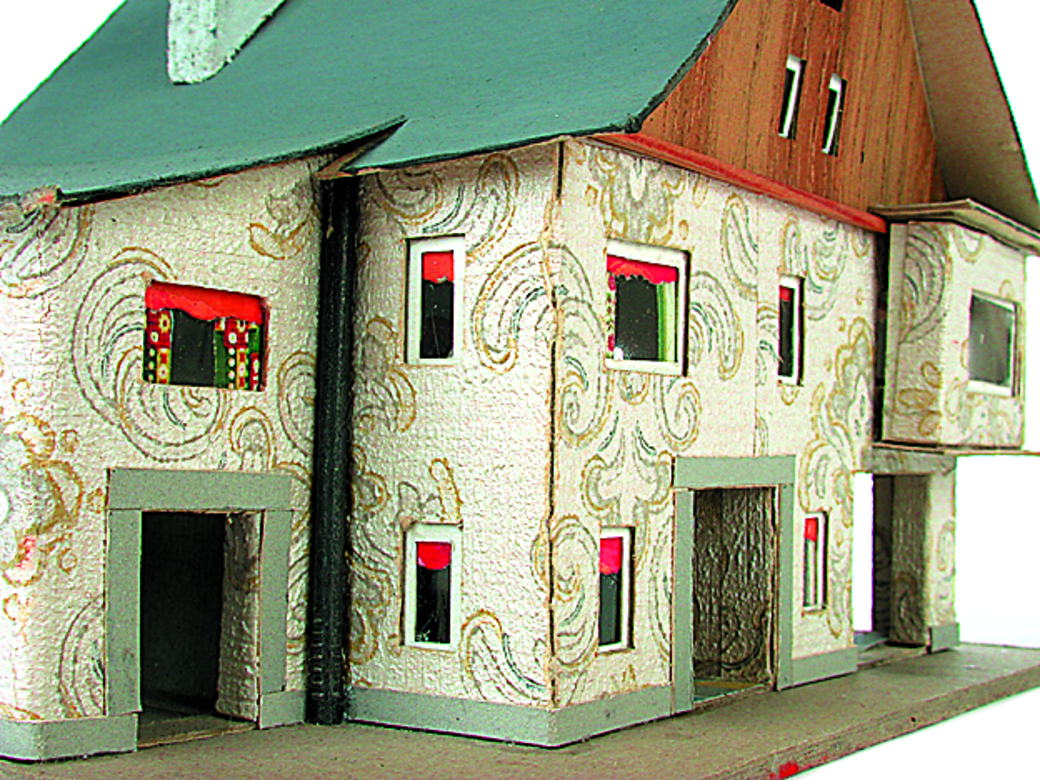Anmerkung der Redaktion: Nicht von jedem Haus sind alle einzelnen verwendeten Materialien dokumentiert. Tatsächlich verbaute der Bastler auch Zigarettenschachteln, Spinnenpapier, Pappmaschee, Tapetenreste, Bunt- und Silberpapiere, Stoffe, Synthetikfasern, d-c-fix-Folien, Schriftproben, Zeitungsschnipsel und ausgewertete Illustrierte, Kartonagen, Holzabfälle aller Art, Uhu, Holzleim und Tapetenkleister.