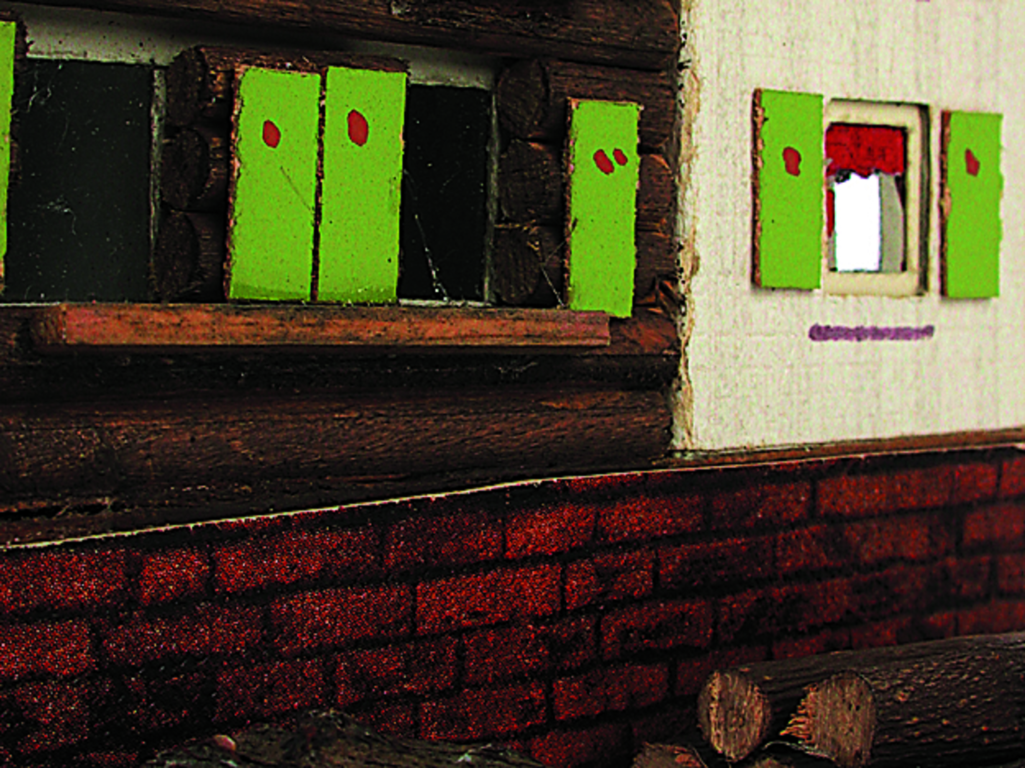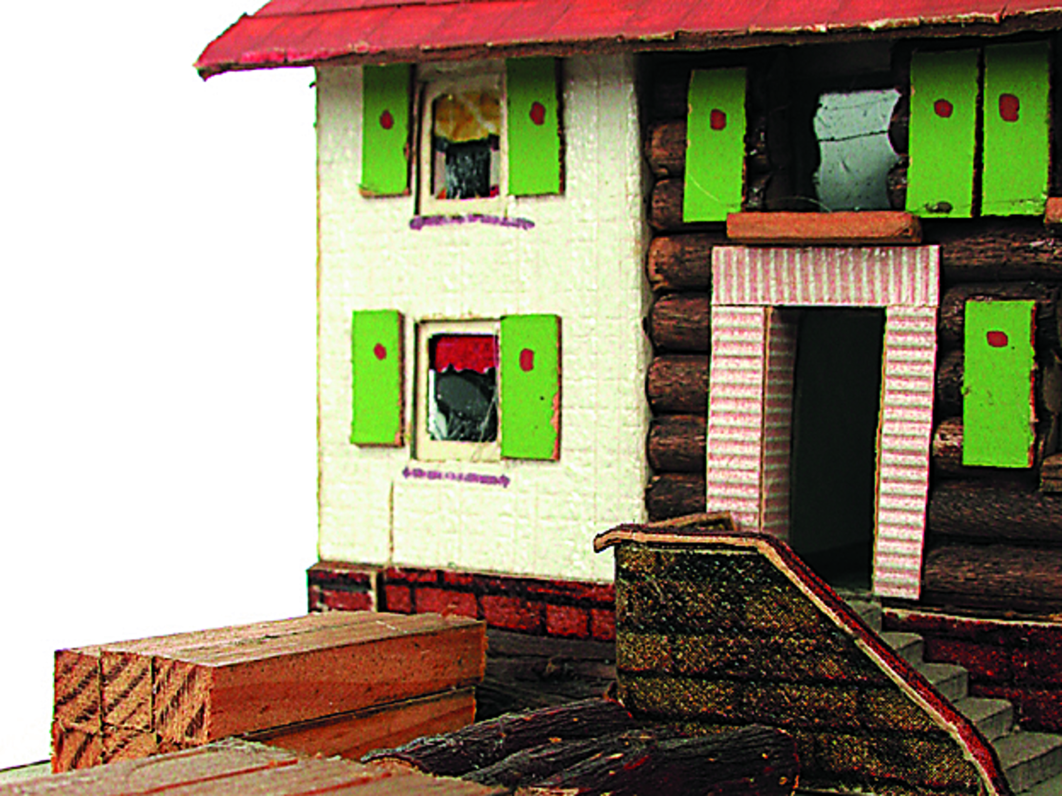 Anmerkung der Redaktion: Nicht von jedem Haus sind alle einzelnen verwendeten Materialien dokumentiert. Tatsächlich verbaute der Bastler auch Zigarettenschachteln, Spinnenpapier, Pappmaschee, Tapetenreste, Bunt- und Silberpapiere, Stoffe, Synthetikfasern, d-c-fix-Folien, Schriftproben, Zeitungsschnipsel und ausgewertete Illustrierte, Kartonagen, Holzabfälle aller Art, Uhu, Holzleim und Tapetenkleister.