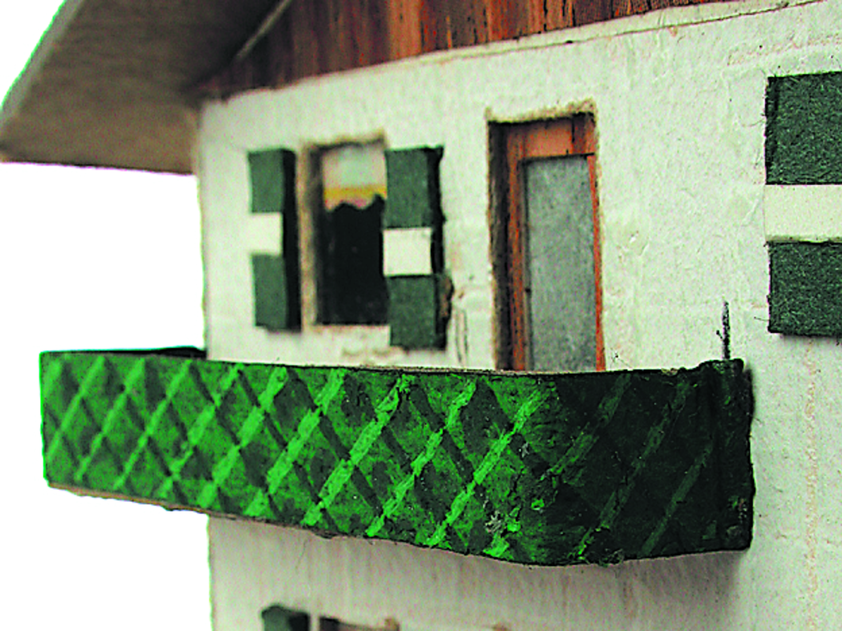 Anmerkung der Redaktion: Nicht von jedem Haus sind alle einzelnen verwendeten Materialien dokumentiert. Tatsächlich verbaute der Bastler auch Zigarettenschachteln, Spinnenpapier, Pappmaschee, Tapetenreste, Bunt- und Silberpapiere, Stoffe, Synthetikfasern, d-c-fix-Folien, Schriftproben, Zeitungsschnipsel und ausgewertete Illustrierte, Kartonagen, Holzabfälle aller Art, Uhu, Holzleim und Tapetenkleister.