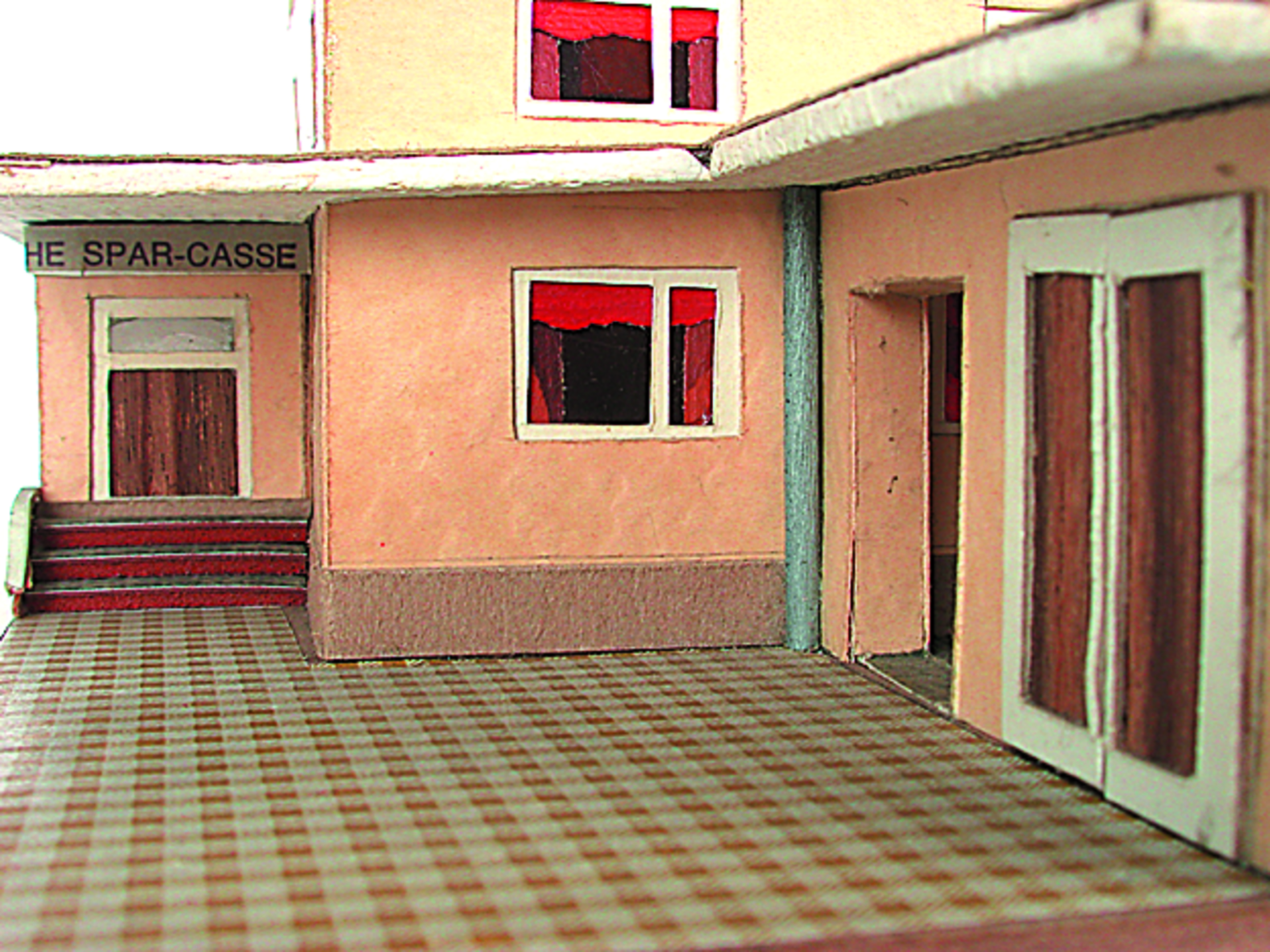 Anmerkung der Redaktion: Nicht von jedem Haus sind alle einzelnen verwendeten Materialien dokumentiert. Tatsächlich verbaute der Bastler auch Zigarettenschachteln, Spinnenpapier, Pappmaschee, Tapetenreste, Bunt- und Silberpapiere, Stoffe, Synthetikfasern, d-c-fix-Folien, Schriftproben, Zeitungsschnipsel und ausgewertete Illustrierte, Kartonagen, Holzabfälle aller Art, Uhu, Holzleim und Tapetenkleister.