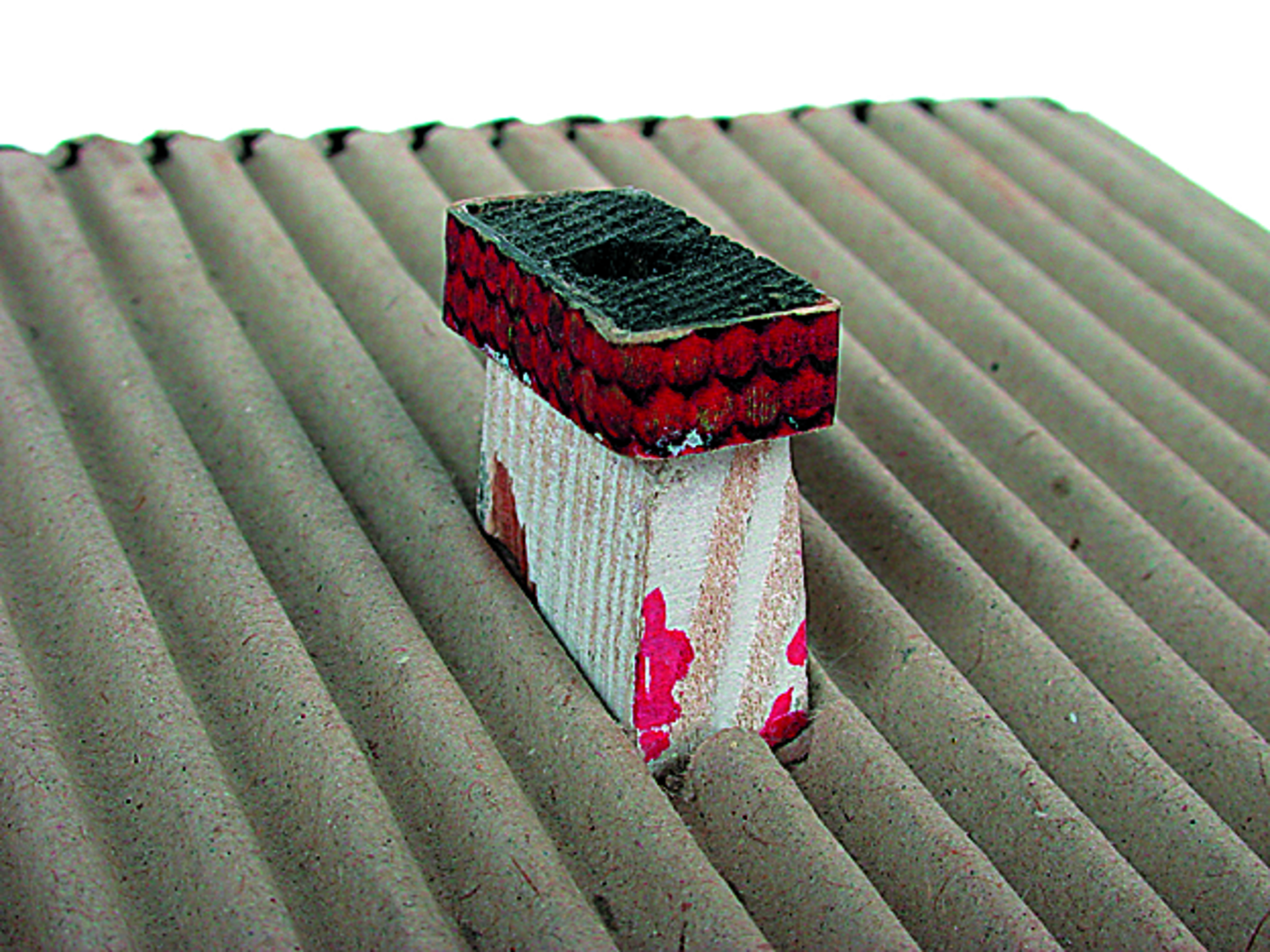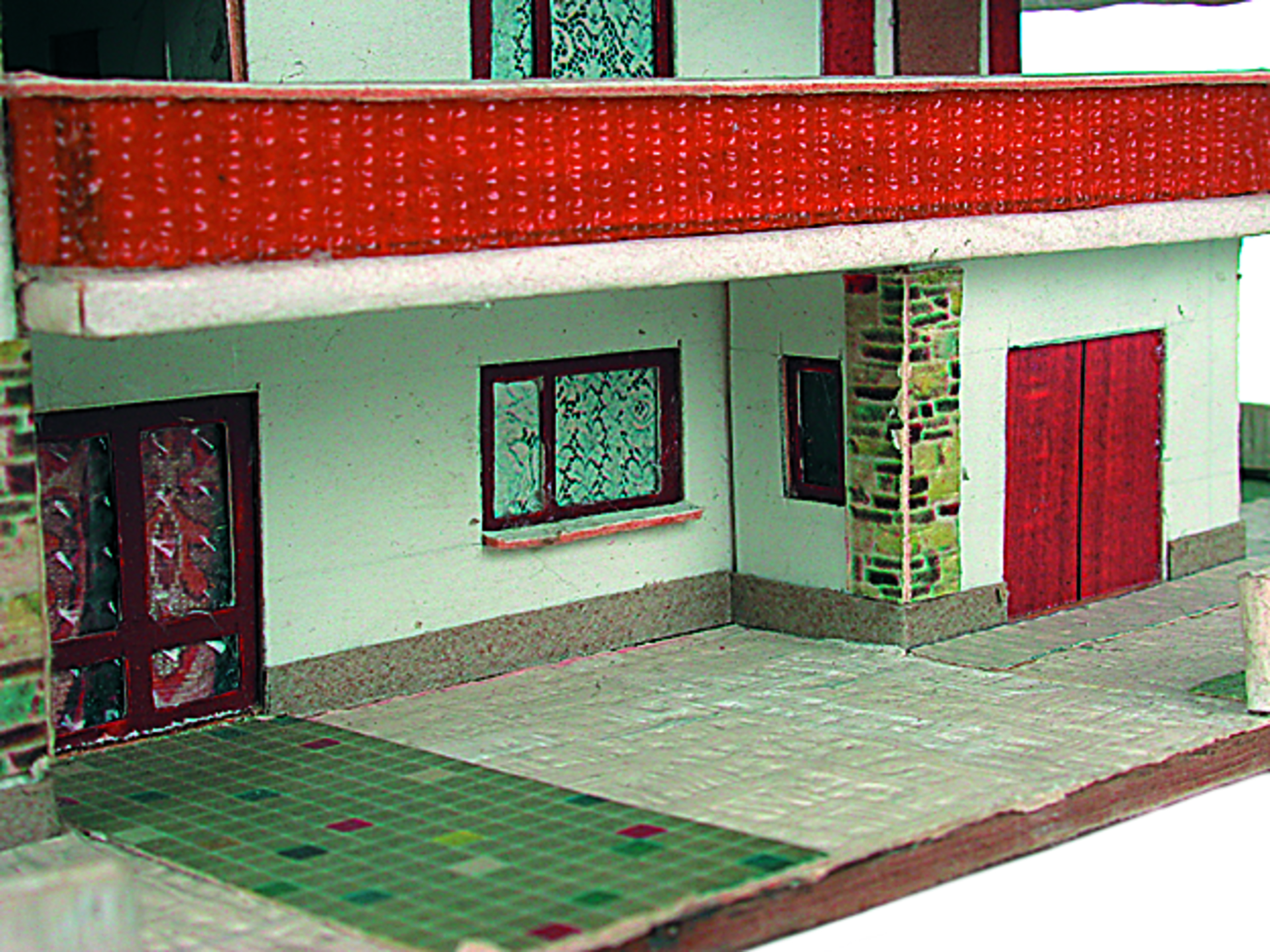 Anmerkung der Redaktion: Nicht von jedem Haus sind alle einzelnen verwendeten Materialien dokumentiert. Tatsächlich verbaute der Bastler auch Zigarettenschachteln, Spinnenpapier, Pappmaschee, Tapetenreste, Bunt- und Silberpapiere, Stoffe, Synthetikfasern, d-c-fix-Folien, Schriftproben, Zeitungsschnipsel und ausgewertete Illustrierte, Kartonagen, Holzabfälle aller Art, Uhu, Holzleim und Tapetenkleister.