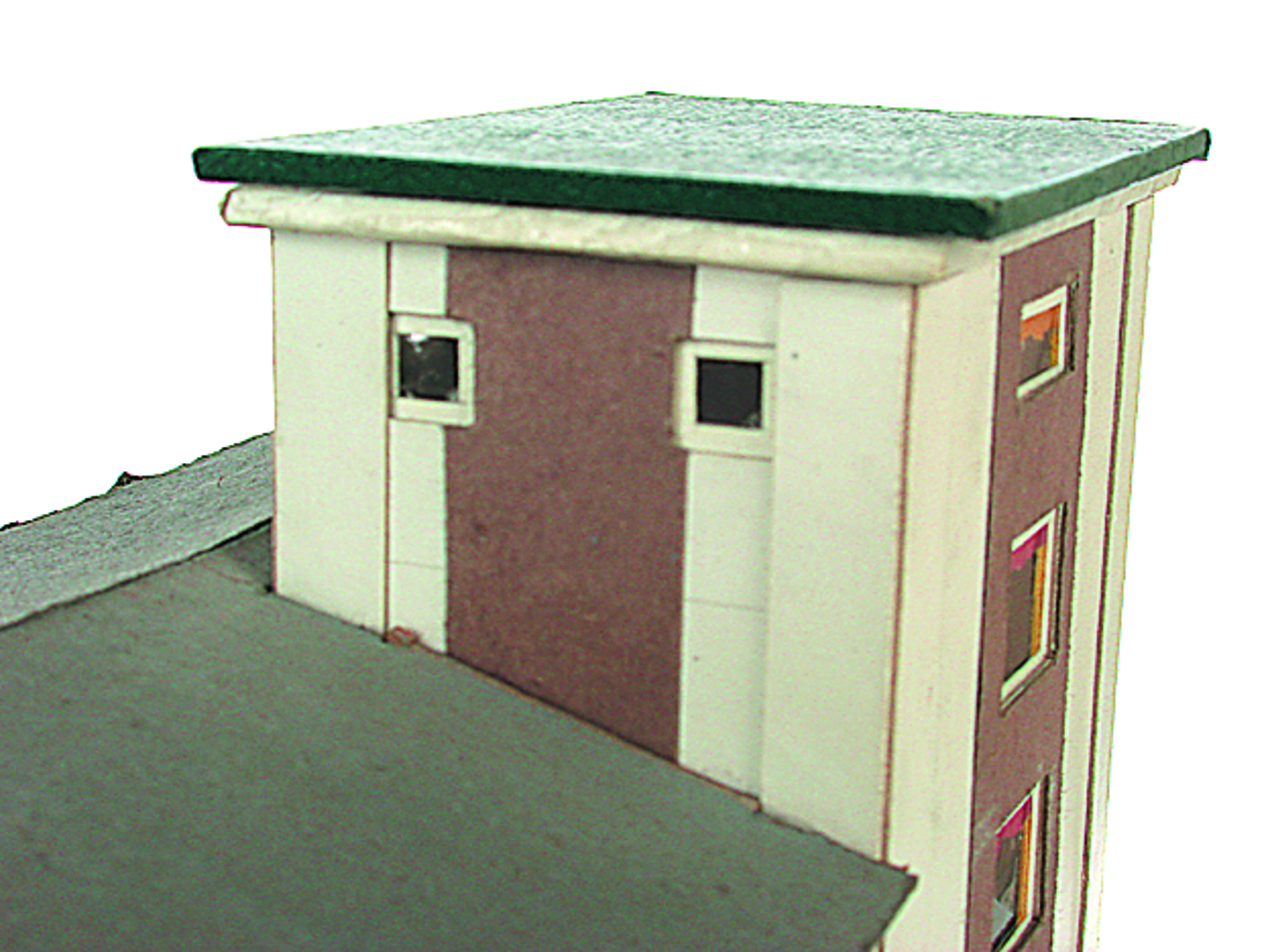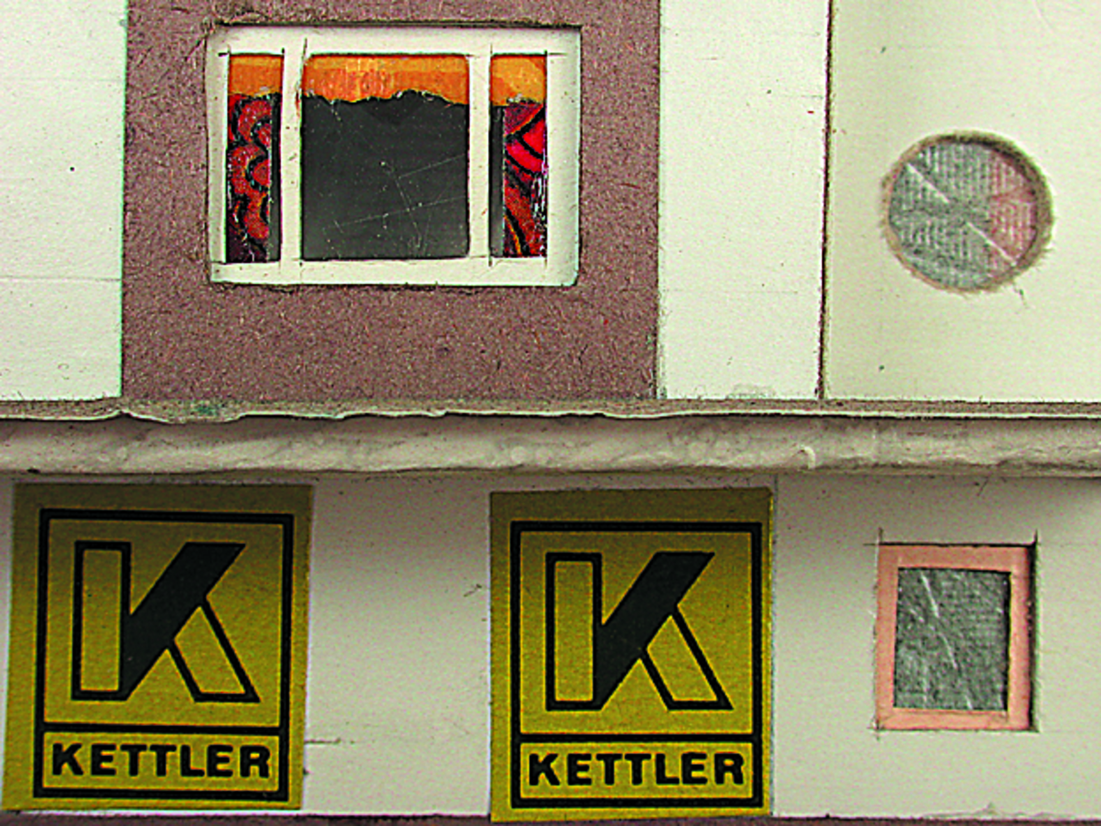 Anmerkung der Redaktion: Nicht von jedem Haus sind alle einzelnen verwendeten Materialien dokumentiert. Tatsächlich verbaute der Bastler auch Zigarettenschachteln, Spinnenpapier, Pappmaschee, Tapetenreste, Bunt- und Silberpapiere, Stoffe, Synthetikfasern, d-c-fix-Folien, Schriftproben, Zeitungsschnipsel und ausgewertete Illustrierte, Kartonagen, Holzabfälle aller Art, Uhu, Holzleim und Tapetenkleister.