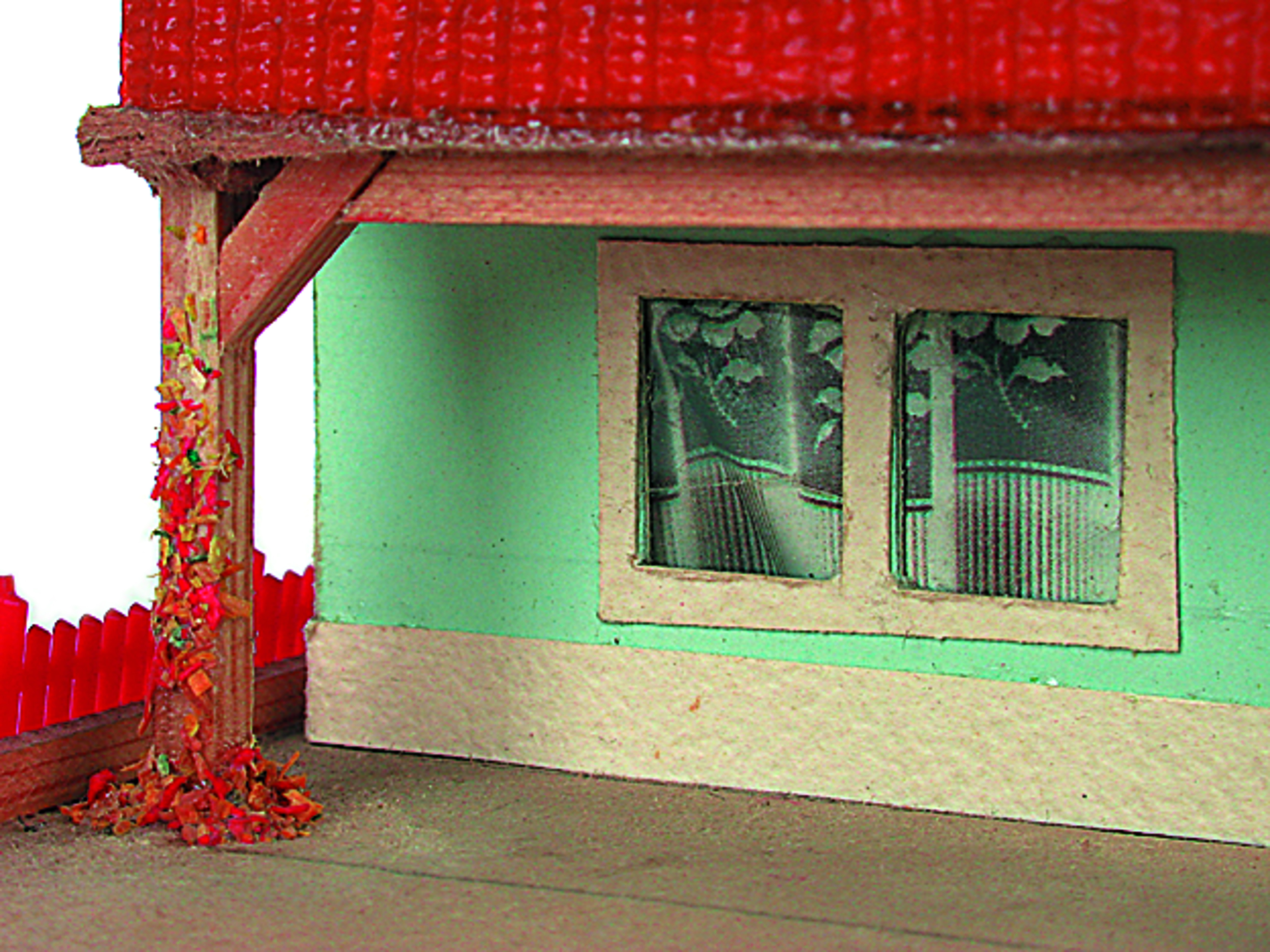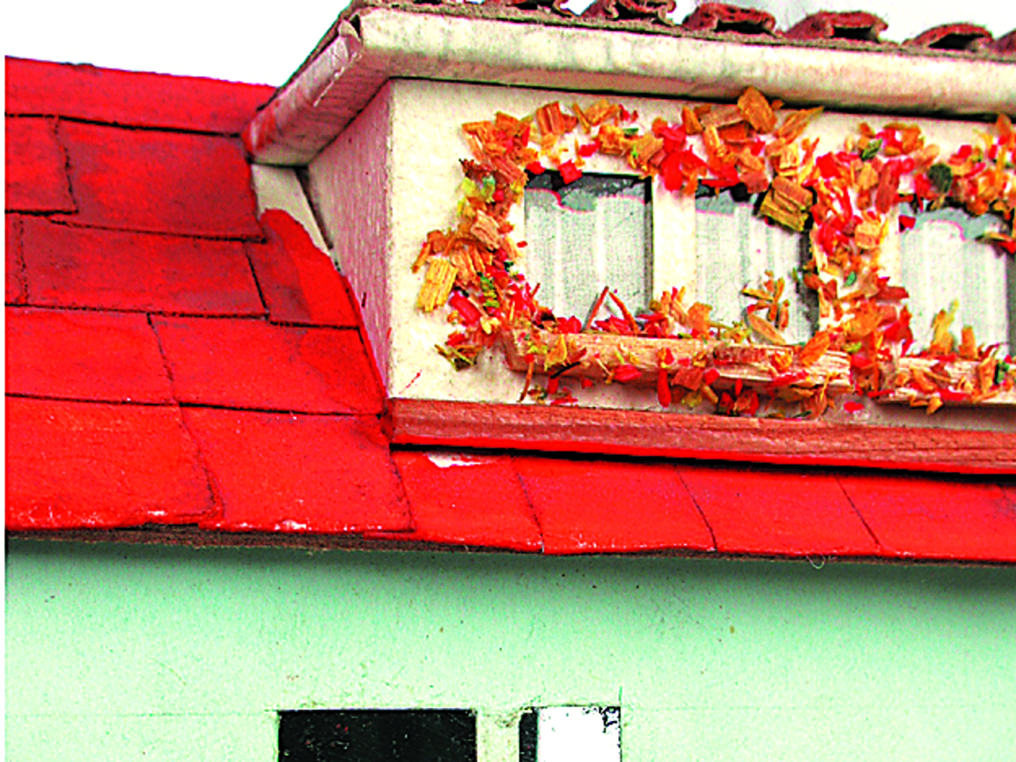 Anmerkung der Redaktion: Nicht von jedem Haus sind alle einzelnen verwendeten Materialien dokumentiert. Tatsächlich verbaute der Bastler auch Zigarettenschachteln, Spinnenpapier, Pappmaschee, Tapetenreste, Bunt- und Silberpapiere, Stoffe, Synthetikfasern, d-c-fix-Folien, Schriftproben, Zeitungsschnipsel und ausgewertete Illustrierte, Kartonagen, Holzabfälle aller Art, Uhu, Holzleim und Tapetenkleister.