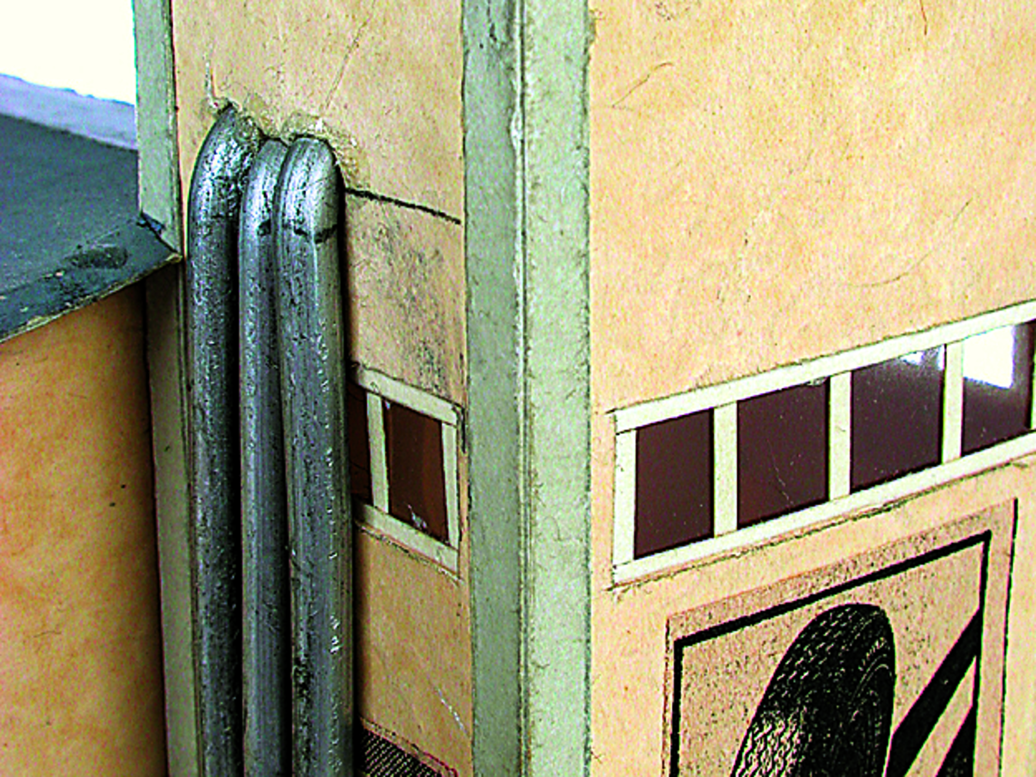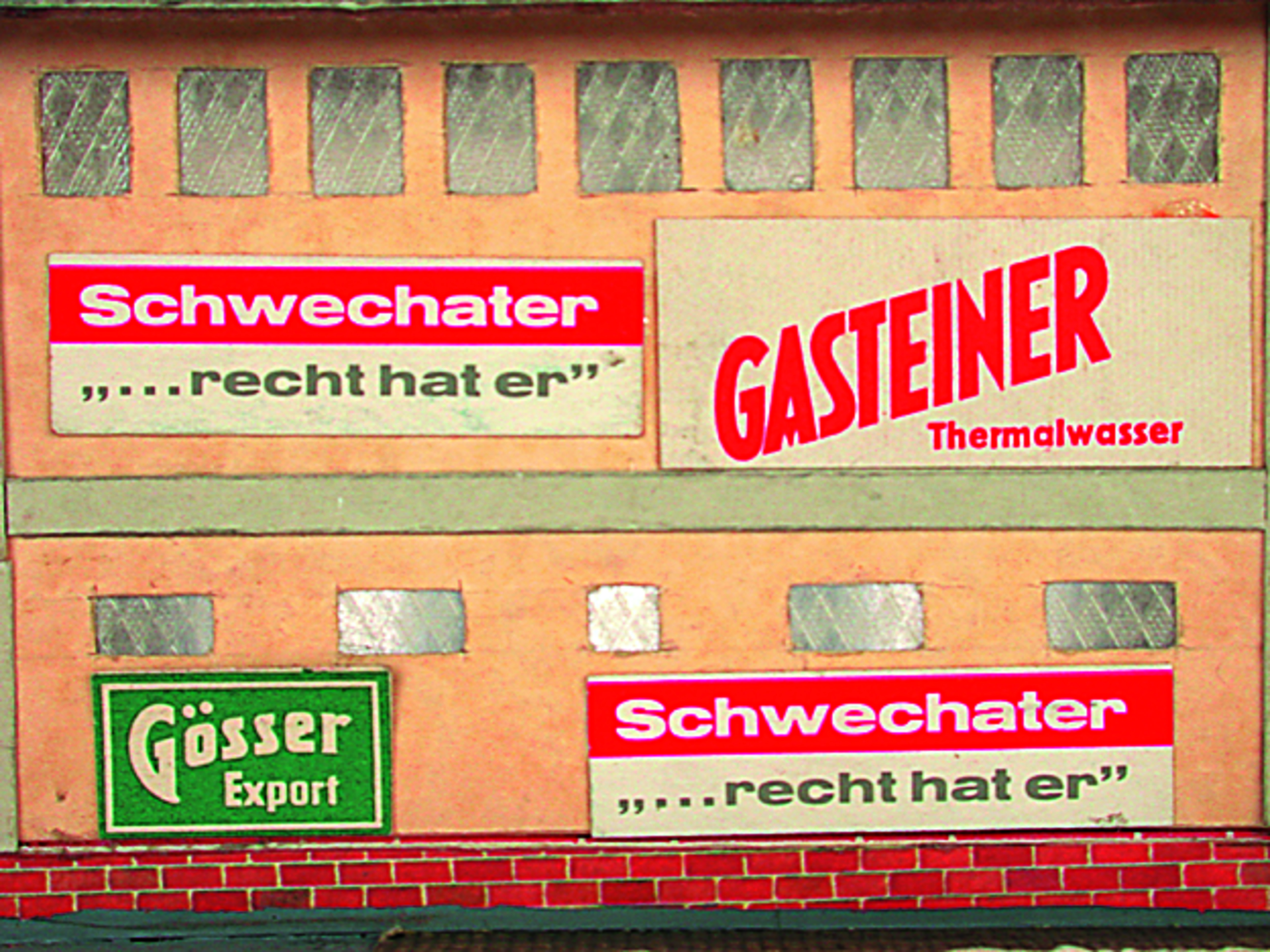 Anmerkung der Redaktion: Nicht von jedem Haus sind alle einzelnen verwendeten Materialien dokumentiert. Tatsächlich verbaute der Bastler auch Zigarettenschachteln, Spinnenpapier, Pappmaschee, Tapetenreste, Bunt- und Silberpapiere, Stoffe, Synthetikfasern, d-c-fix-Folien, Schriftproben, Zeitungsschnipsel und ausgewertete Illustrierte, Kartonagen, Holzabfälle aller Art, Uhu, Holzleim und Tapetenkleister.