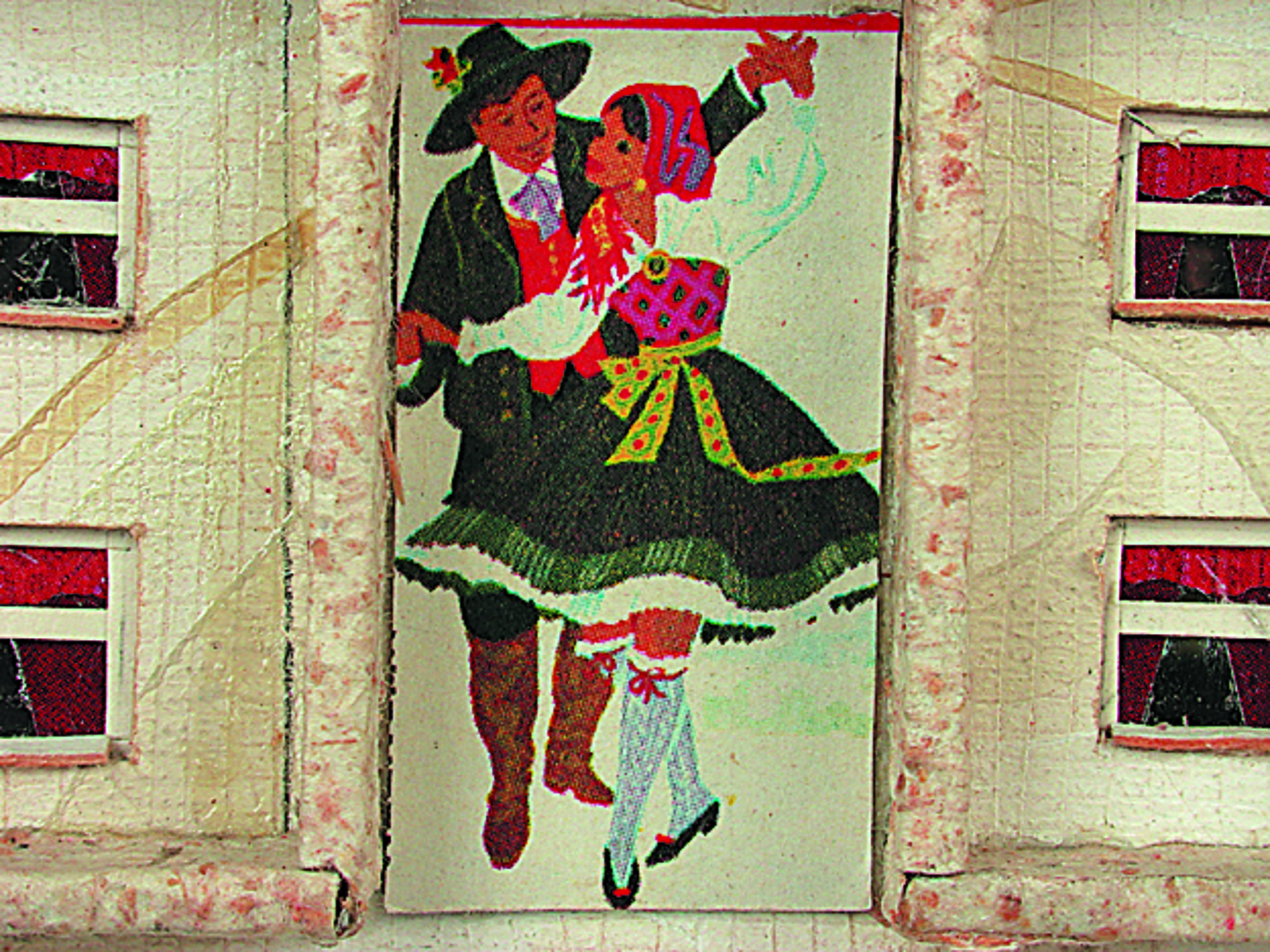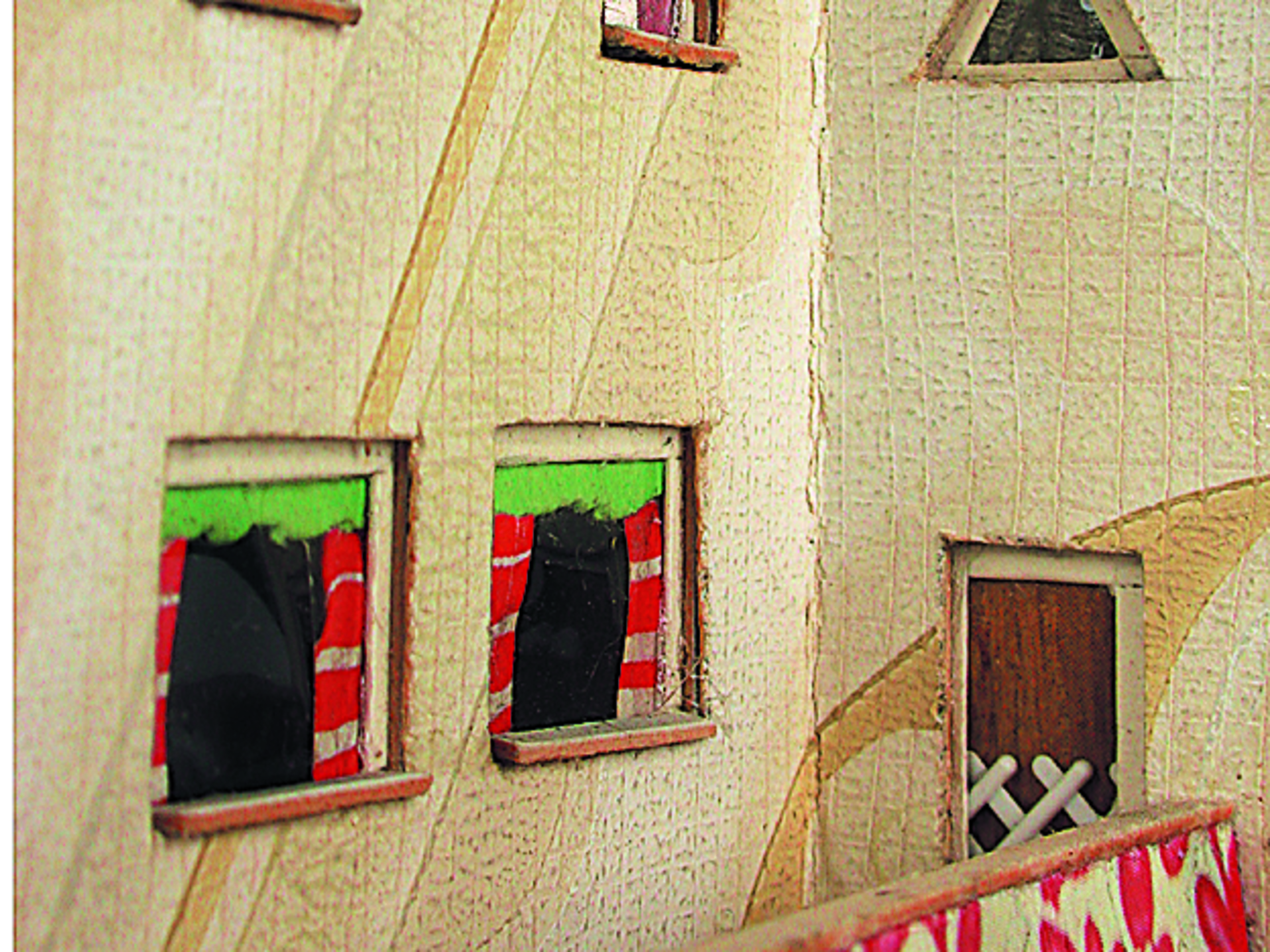 Anmerkung der Redaktion: Nicht von jedem Haus sind alle einzelnen verwendeten Materialien dokumentiert. Tatsächlich verbaute der Bastler auch Zigarettenschachteln, Spinnenpapier, Pappmaschee, Tapetenreste, Bunt- und Silberpapiere, Stoffe, Synthetikfasern, d-c-fix-Folien, Schriftproben, Zeitungsschnipsel und ausgewertete Illustrierte, Kartonagen, Holzabfälle aller Art, Uhu, Holzleim und Tapetenkleister.