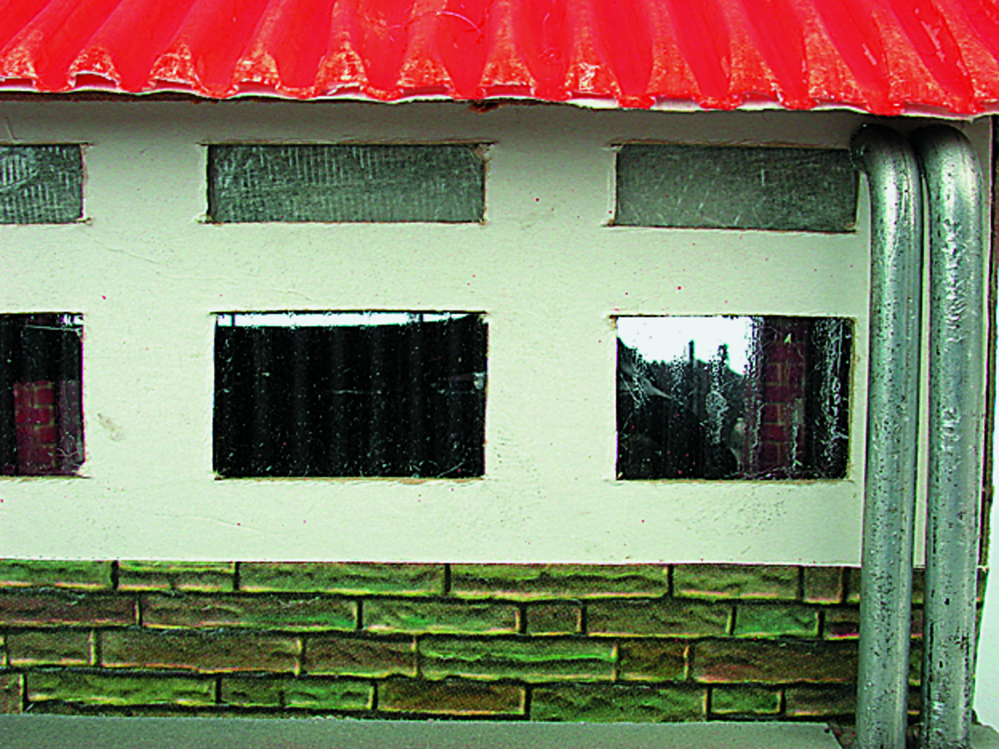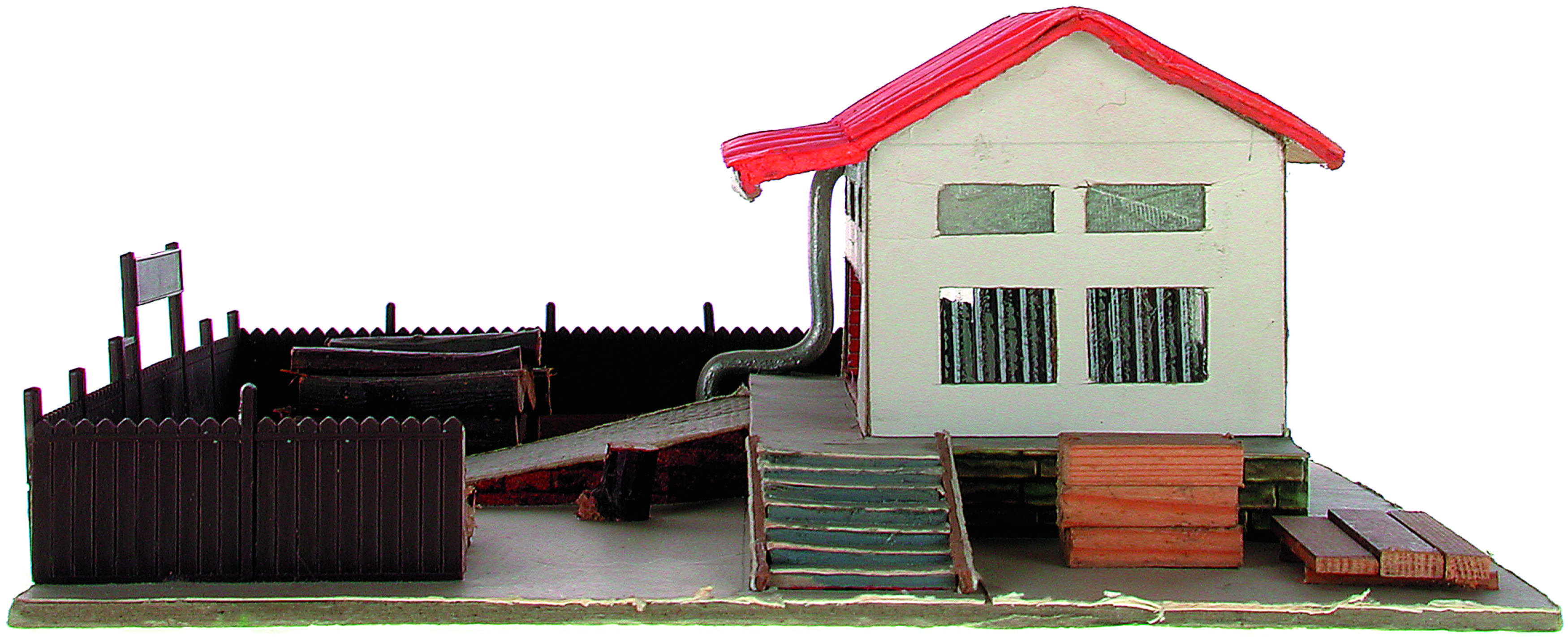 Anmerkung der Redaktion: Nicht von jedem Haus sind alle einzelnen verwendeten Materialien dokumentiert. Tatsächlich verbaute der Bastler auch Zigarettenschachteln, Spinnenpapier, Pappmaschee, Tapetenreste, Bunt- und Silberpapiere, Stoffe, Synthetikfasern, d-c-fix-Folien, Schriftproben, Zeitungsschnipsel und ausgewertete Illustrierte, Kartonagen, Holzabfälle aller Art, Uhu, Holzleim und Tapetenkleister.