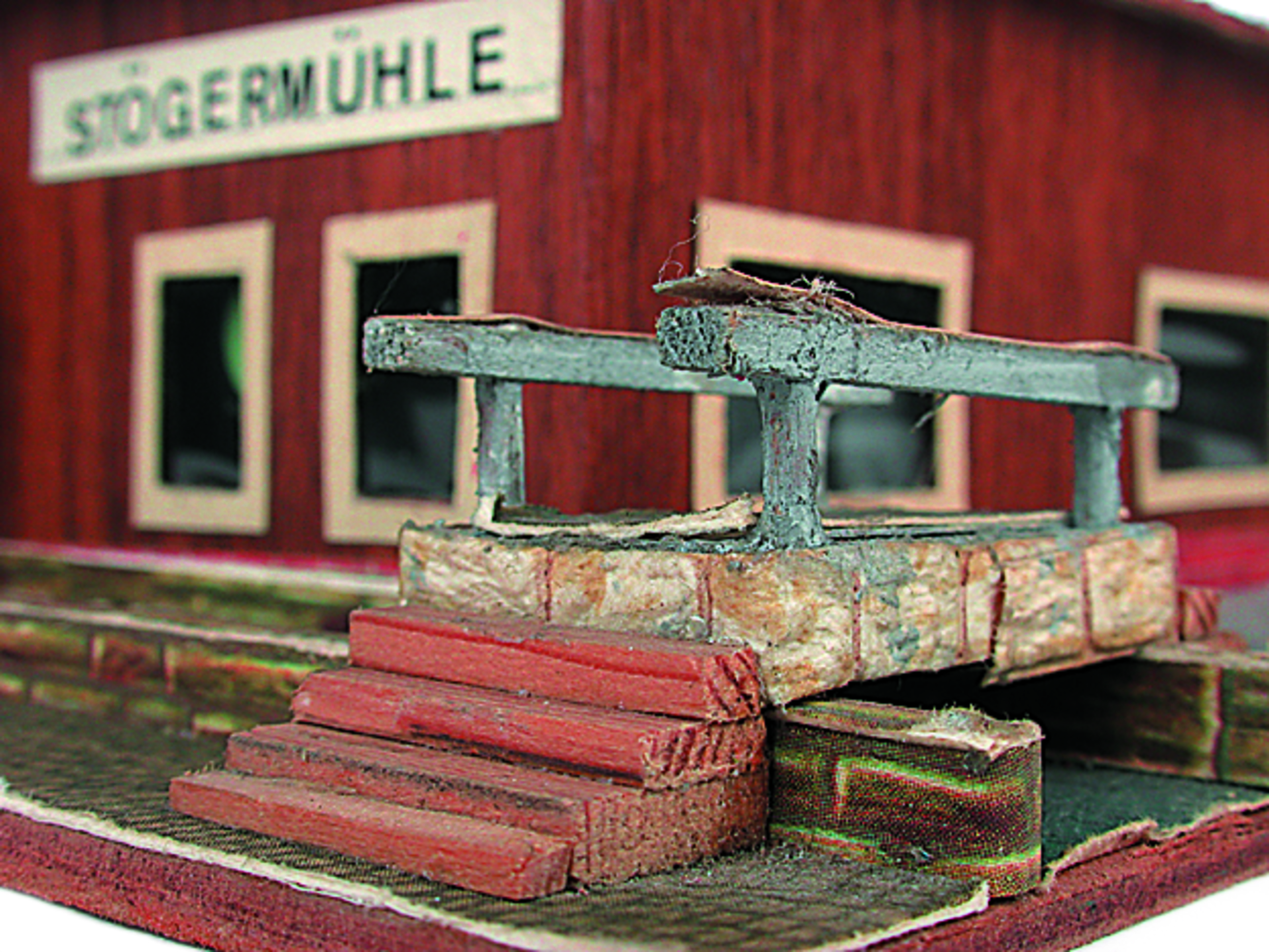 Anmerkung der Redaktion: Nicht von jedem Haus sind alle einzelnen verwendeten Materialien dokumentiert. Tatsächlich verbaute der Bastler auch Zigarettenschachteln, Spinnenpapier, Pappmaschee, Tapetenreste, Bunt- und Silberpapiere, Stoffe, Synthetikfasern, d-c-fix-Folien, Schriftproben, Zeitungsschnipsel und ausgewertete Illustrierte, Kartonagen, Holzabfälle aller Art, Uhu, Holzleim und Tapetenkleister.