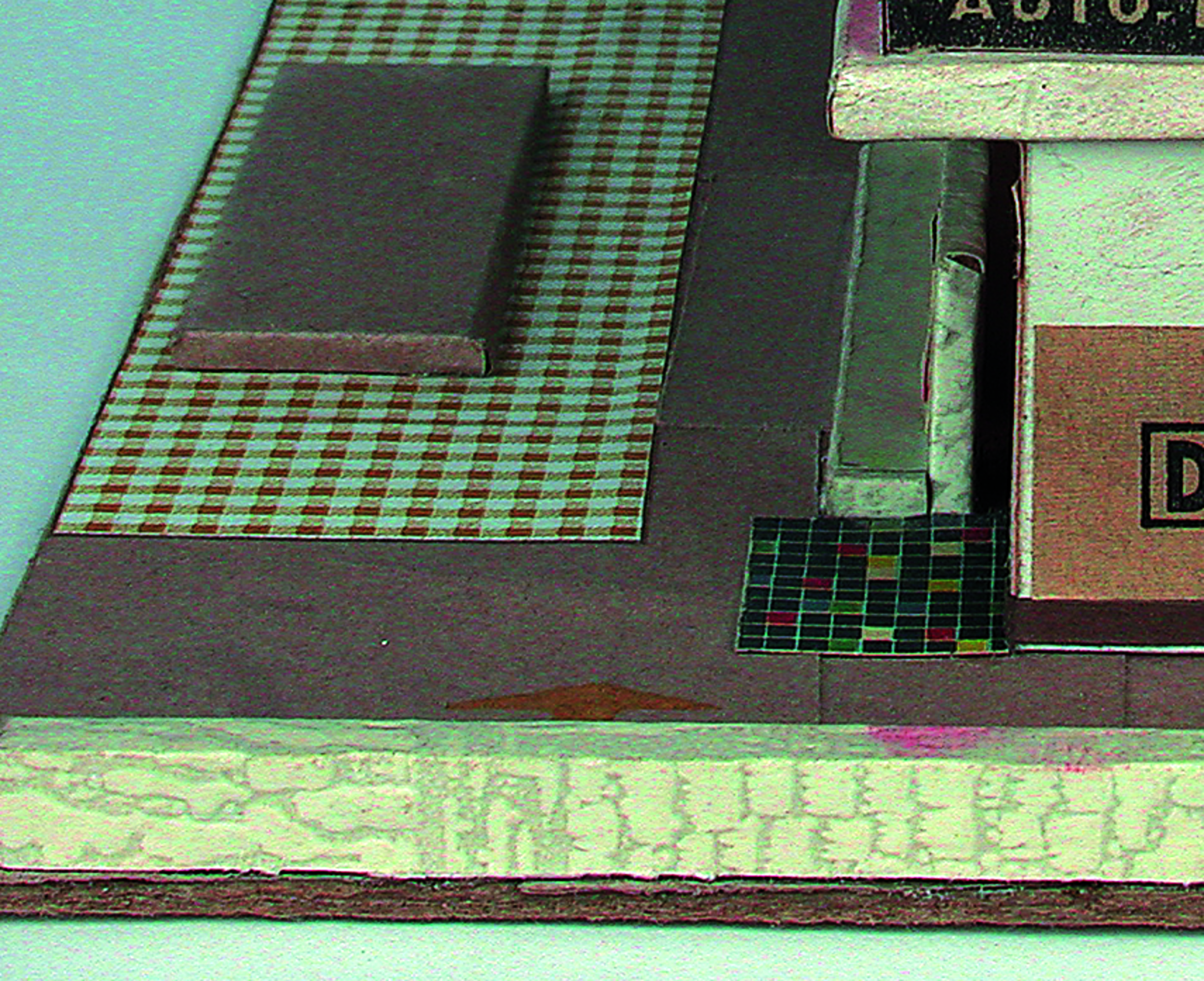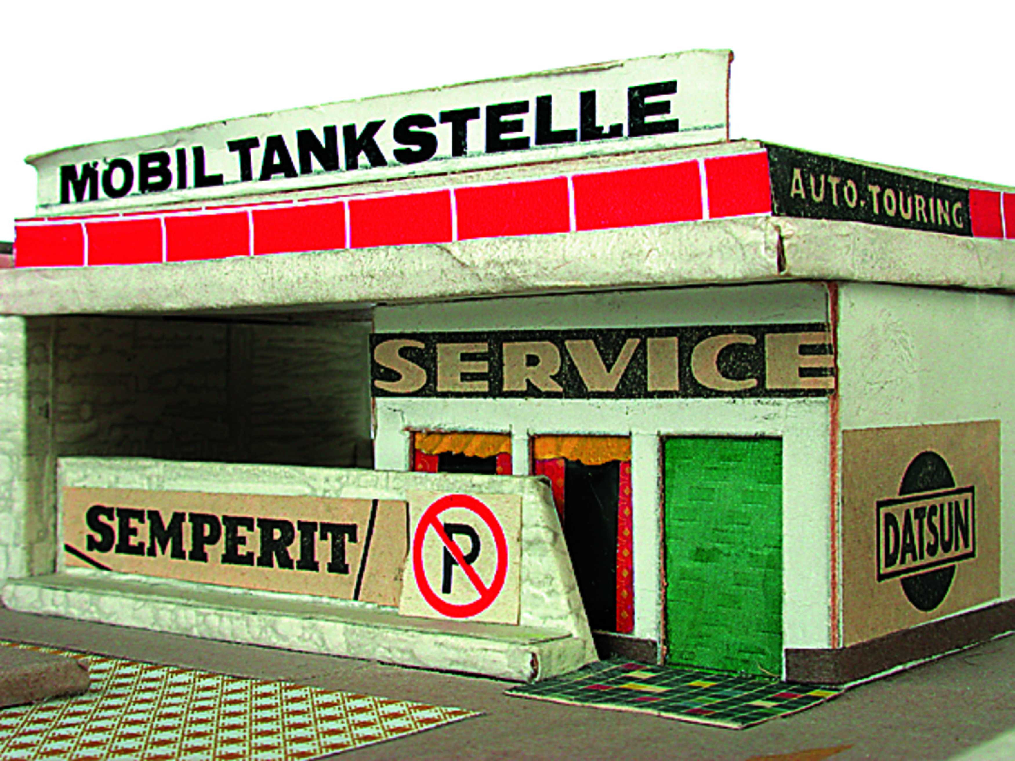 Anmerkung der Redaktion: Nicht von jedem Haus sind alle einzelnen verwendeten Materialien dokumentiert. Tatsächlich verbaute der Bastler auch Zigarettenschachteln, Spinnenpapier, Pappmaschee, Tapetenreste, Bunt- und Silberpapiere, Stoffe, Synthetikfasern, d-c-fix-Folien, Schriftproben, Zeitungsschnipsel und ausgewertete Illustrierte, Kartonagen, Holzabfälle aller Art, Uhu, Holzleim und Tapetenkleister.
