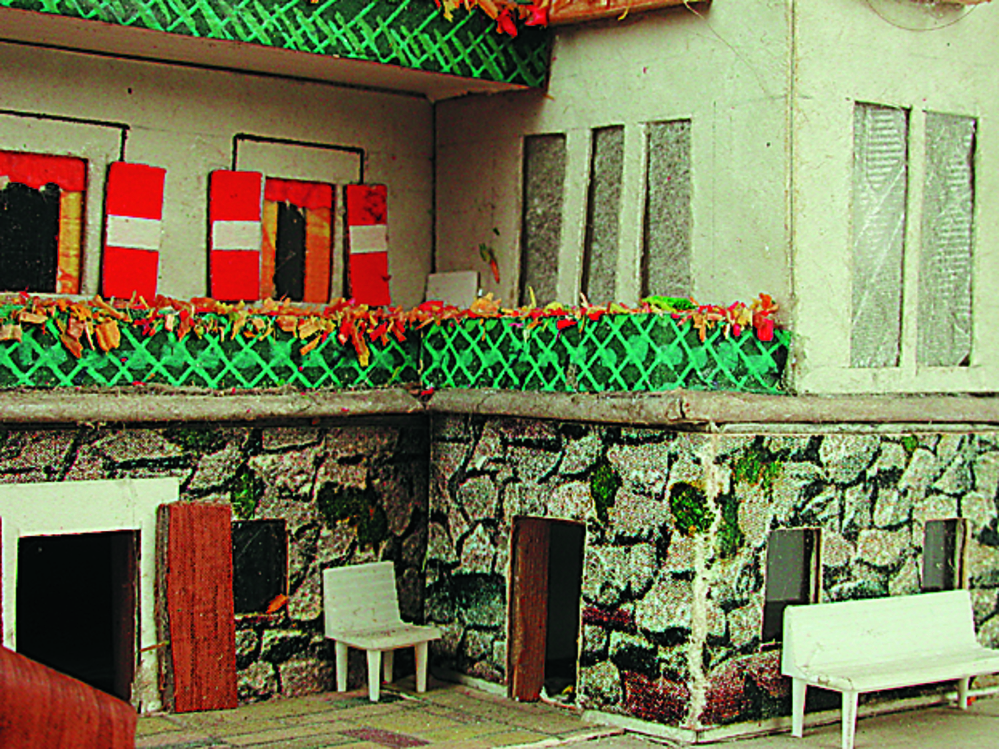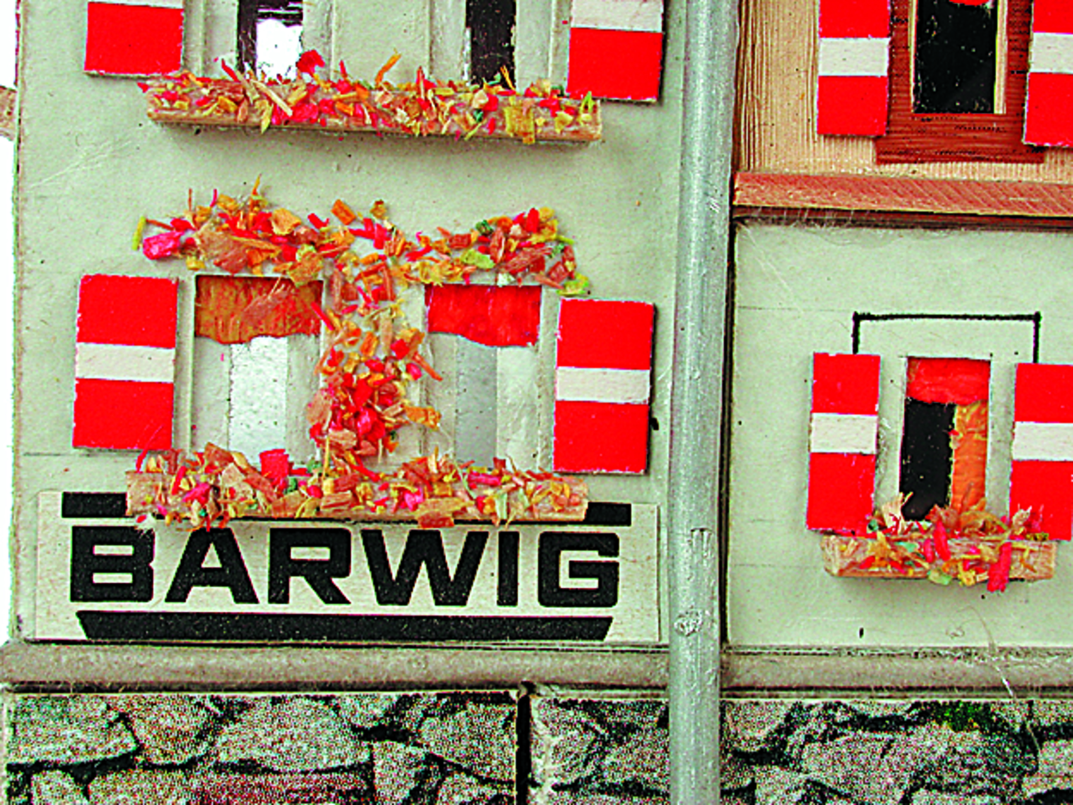 Anmerkung der Redaktion: Nicht von jedem Haus sind alle einzelnen verwendeten Materialien dokumentiert. Tatsächlich verbaute der Bastler auch Zigarettenschachteln, Spinnenpapier, Pappmaschee, Tapetenreste, Bunt- und Silberpapiere, Stoffe, Synthetikfasern, d-c-fix-Folien, Schriftproben, Zeitungsschnipsel und ausgewertete Illustrierte, Kartonagen, Holzabfälle aller Art, Uhu, Holzleim und Tapetenkleister.