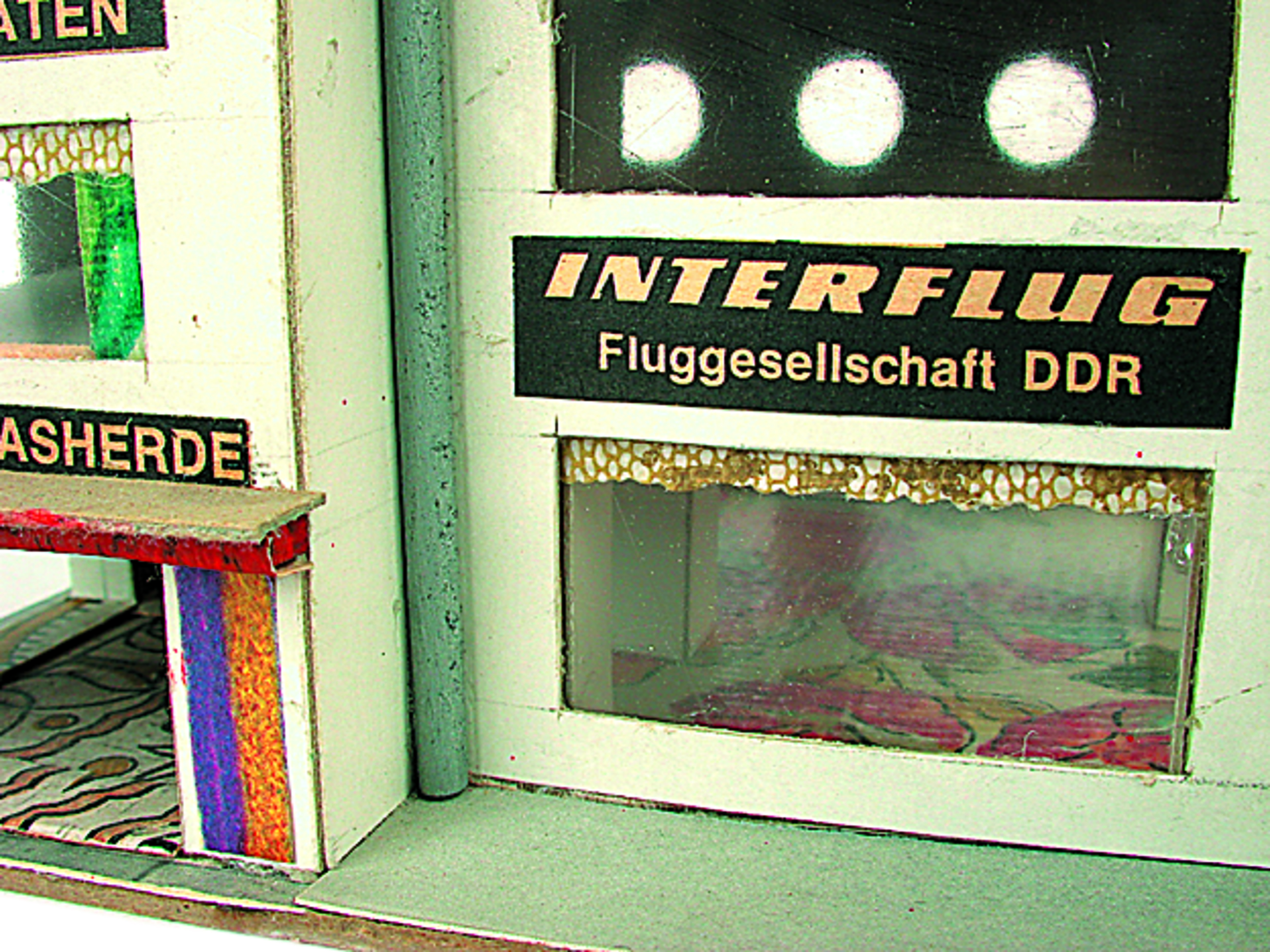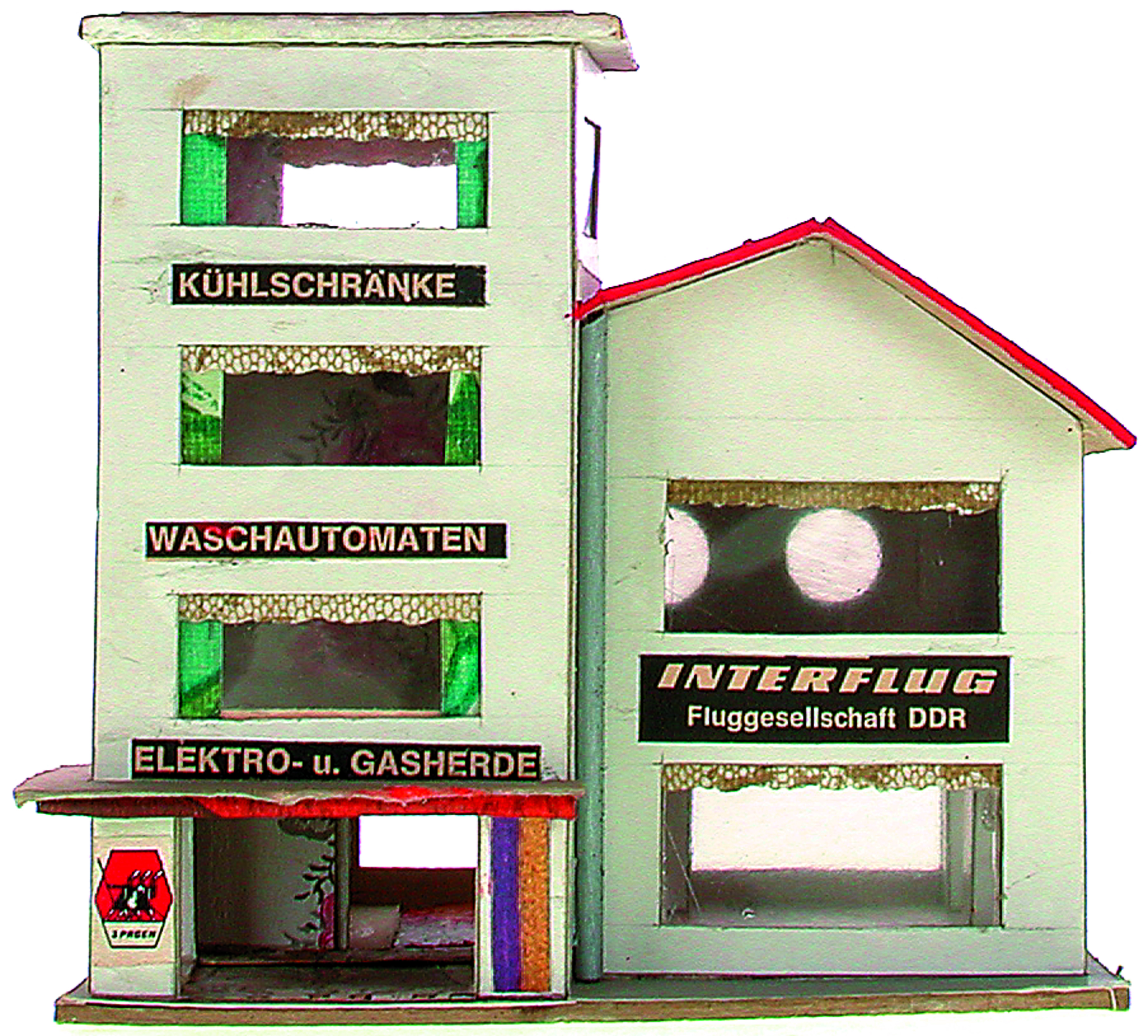 Anmerkung der Redaktion: Nicht von jedem Haus sind alle einzelnen verwendeten Materialien dokumentiert. Tatsächlich verbaute der Bastler auch Zigarettenschachteln, Spinnenpapier, Pappmaschee, Tapetenreste, Bunt- und Silberpapiere, Stoffe, Synthetikfasern, d-c-fix-Folien, Schriftproben, Zeitungsschnipsel und ausgewertete Illustrierte, Kartonagen, Holzabfälle aller Art, Uhu, Holzleim und Tapetenkleister.