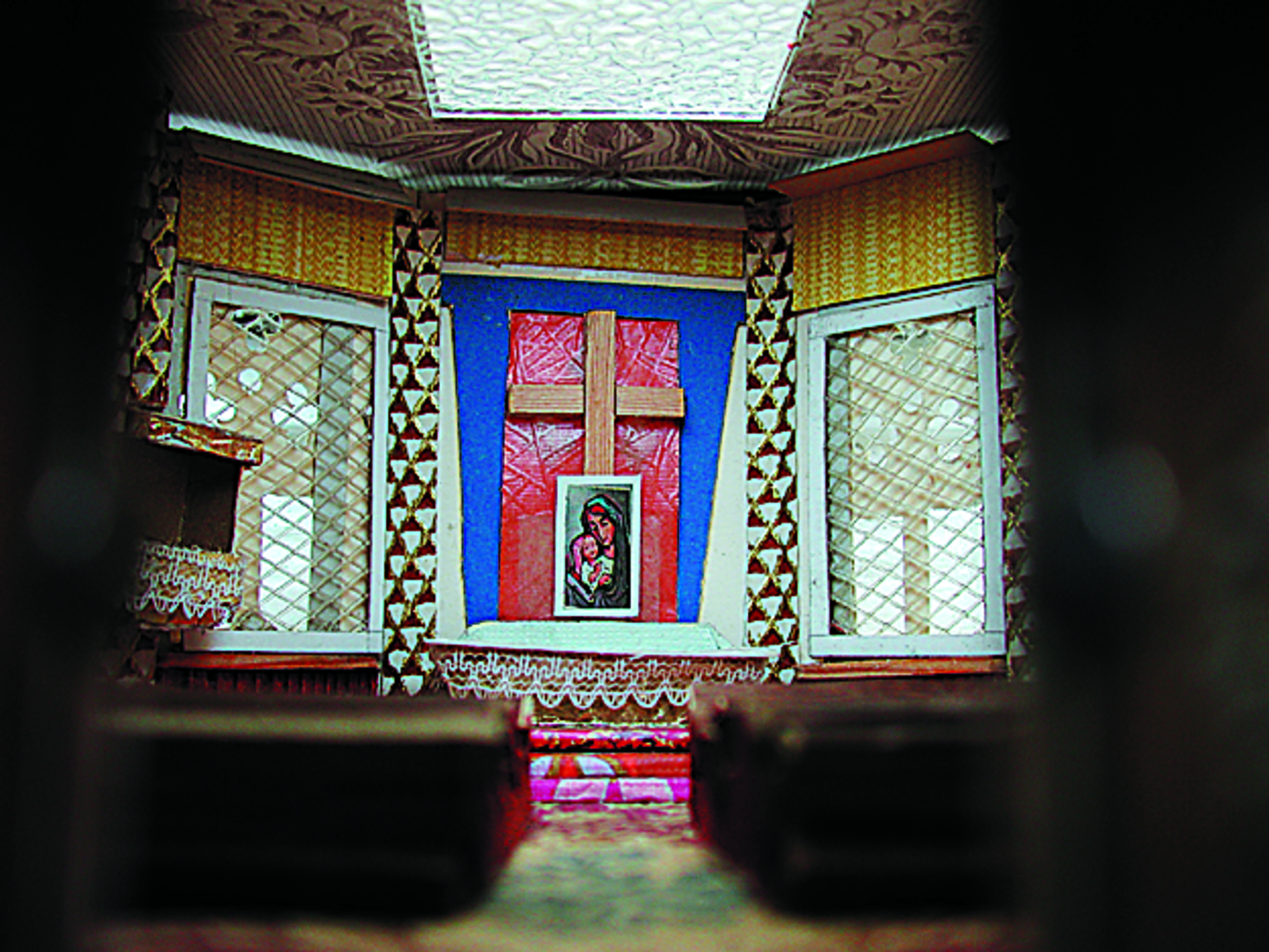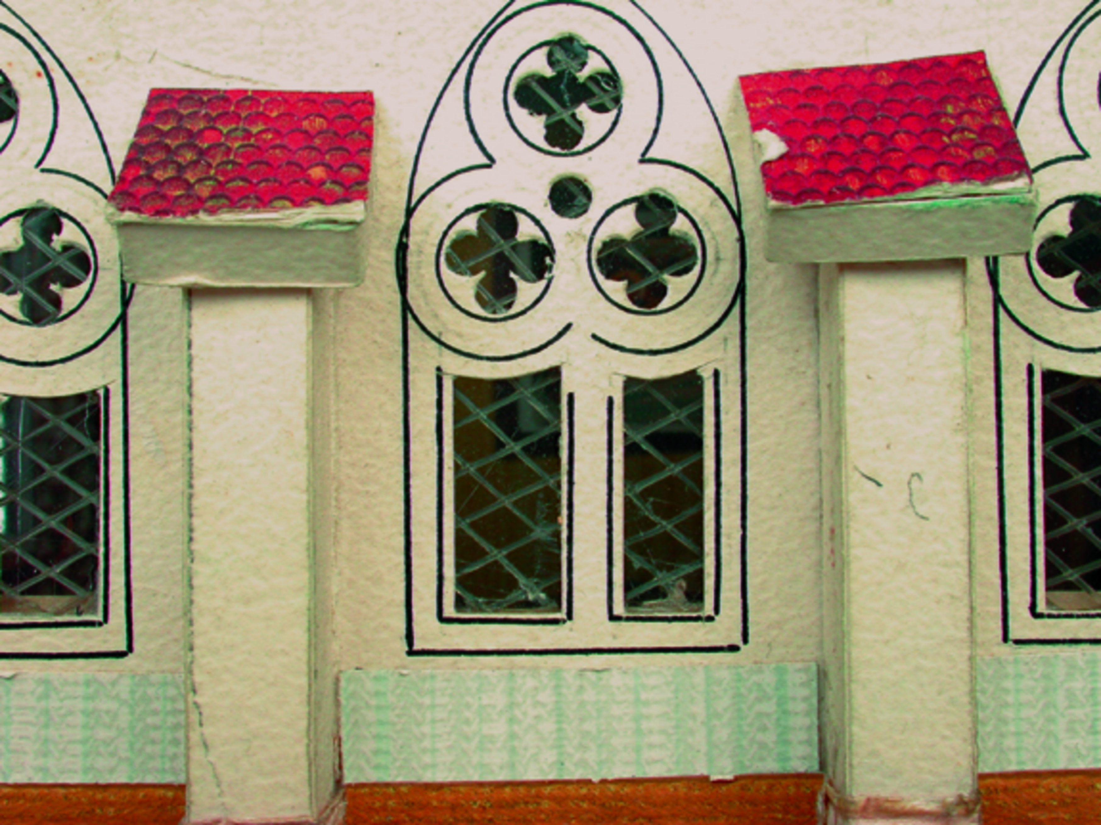 Anmerkung der Redaktion: Nicht von jedem Haus sind alle einzelnen verwendeten Materialien dokumentiert. Tatsächlich verbaute der Bastler auch Zigarettenschachteln, Spinnenpapier, Pappmaschee, Tapetenreste, Bunt- und Silberpapiere, Stoffe, Synthetikfasern, d-c-fix-Folien, Schriftproben, Zeitungsschnipsel und ausgewertete Illustrierte, Kartonagen, Holzabfälle aller Art, Uhu, Holzleim und Tapetenkleister.