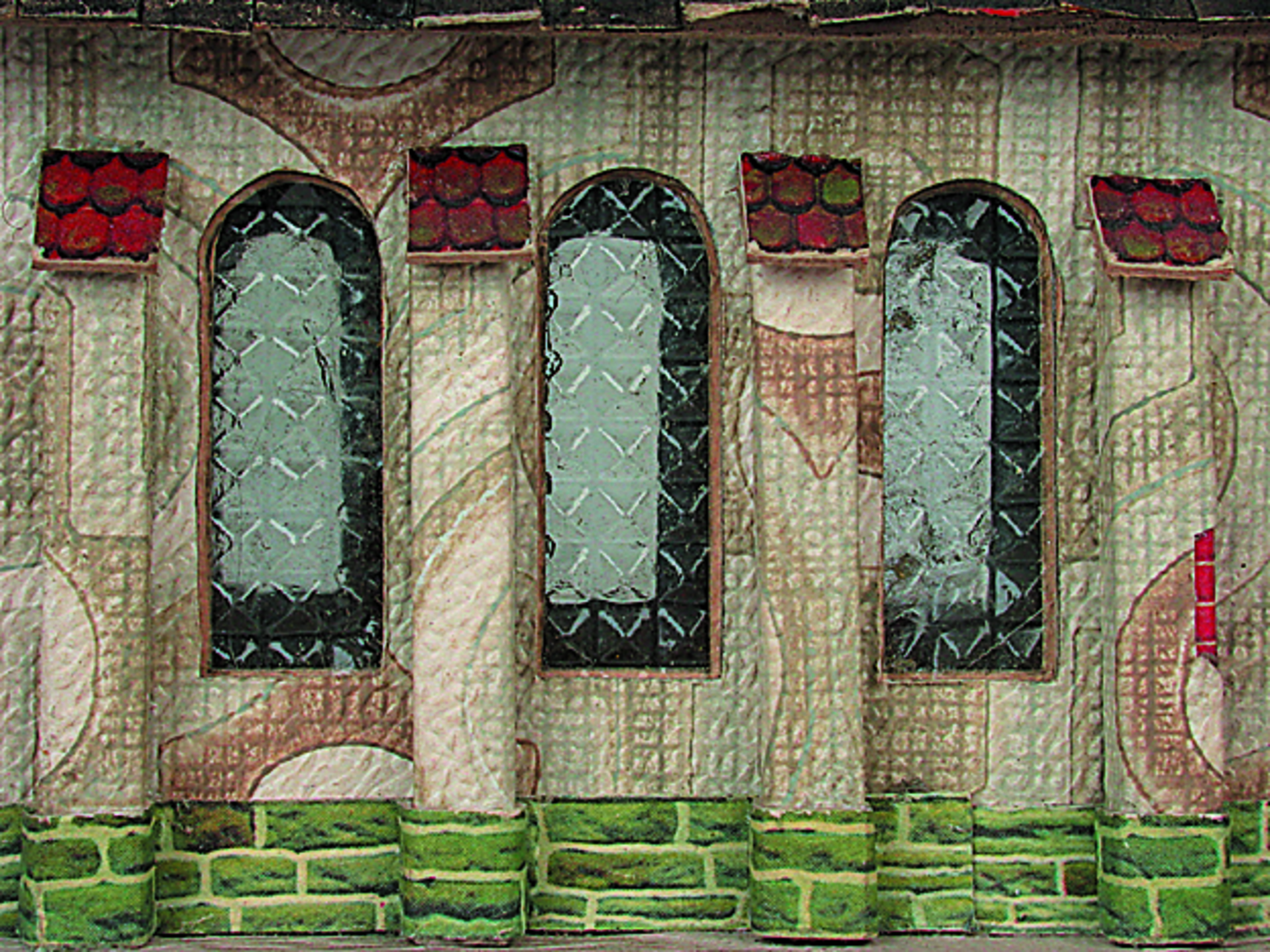 Anmerkung der Redaktion: Nicht von jedem Haus sind alle einzelnen verwendeten Materialien dokumentiert. Tatsächlich verbaute der Bastler auch Zigarettenschachteln, Spinnenpapier, Pappmaschee, Tapetenreste, Bunt- und Silberpapiere, Stoffe, Synthetikfasern, d-c-fix-Folien, Schriftproben, Zeitungsschnipsel und ausgewertete Illustrierte, Kartonagen, Holzabfälle aller Art, Uhu, Holzleim und Tapetenkleister.
