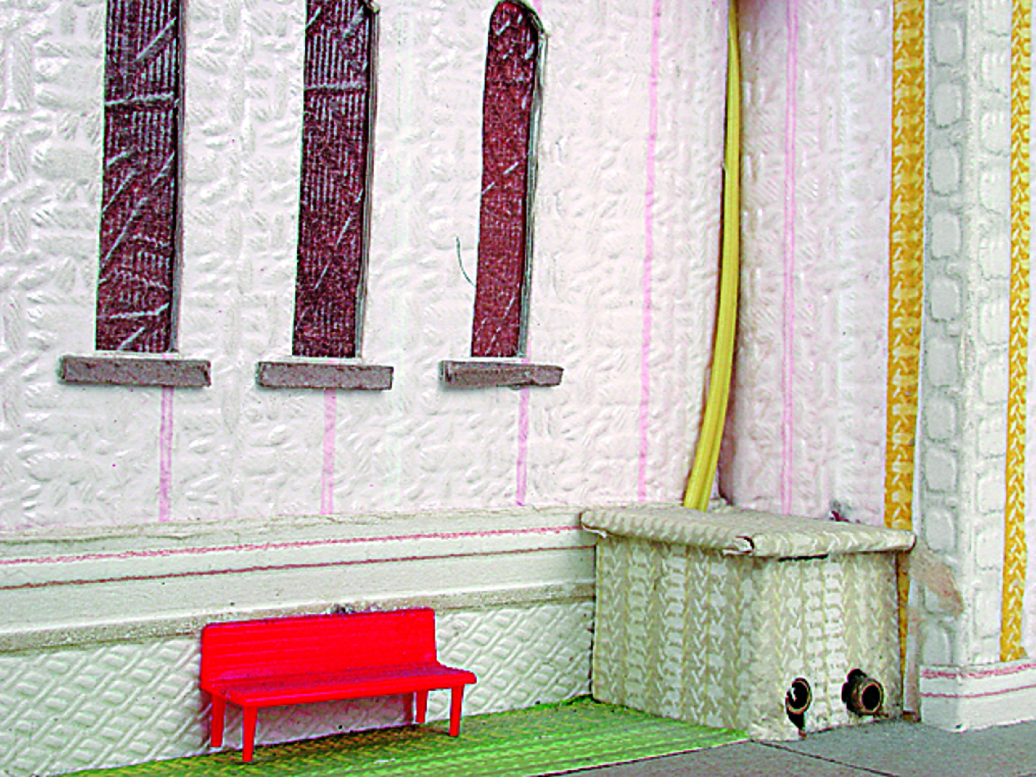 Anmerkung der Redaktion: Nicht von jedem Haus sind alle einzelnen verwendeten Materialien dokumentiert. Tatsächlich verbaute der Bastler auch Zigarettenschachteln, Spinnenpapier, Pappmaschee, Tapetenreste, Bunt- und Silberpapiere, Stoffe, Synthetikfasern, d-c-fix-Folien, Schriftproben, Zeitungsschnipsel und ausgewertete Illustrierte, Kartonagen, Holzabfälle aller Art, Uhu, Holzleim und Tapetenkleister.