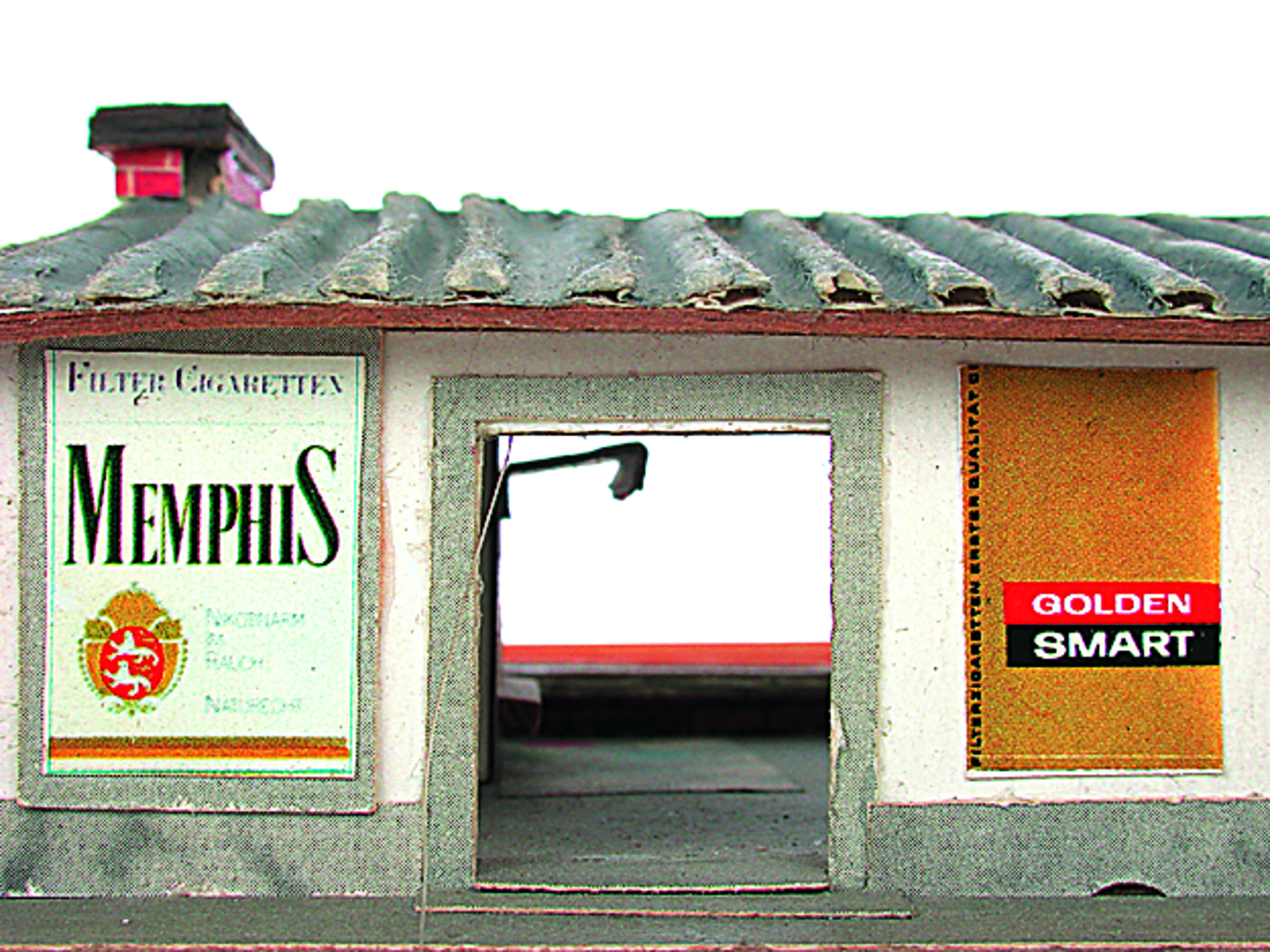 Anmerkung der Redaktion: Nicht von jedem Haus sind alle einzelnen verwendeten Materialien dokumentiert. Tatsächlich verbaute der Bastler auch Zigarettenschachteln, Spinnenpapier, Pappmaschee, Tapetenreste, Bunt- und Silberpapiere, Stoffe, Synthetikfasern, d-c-fix-Folien, Schriftproben, Zeitungsschnipsel und ausgewertete Illustrierte, Kartonagen, Holzabfälle aller Art, Uhu, Holzleim und Tapetenkleister.