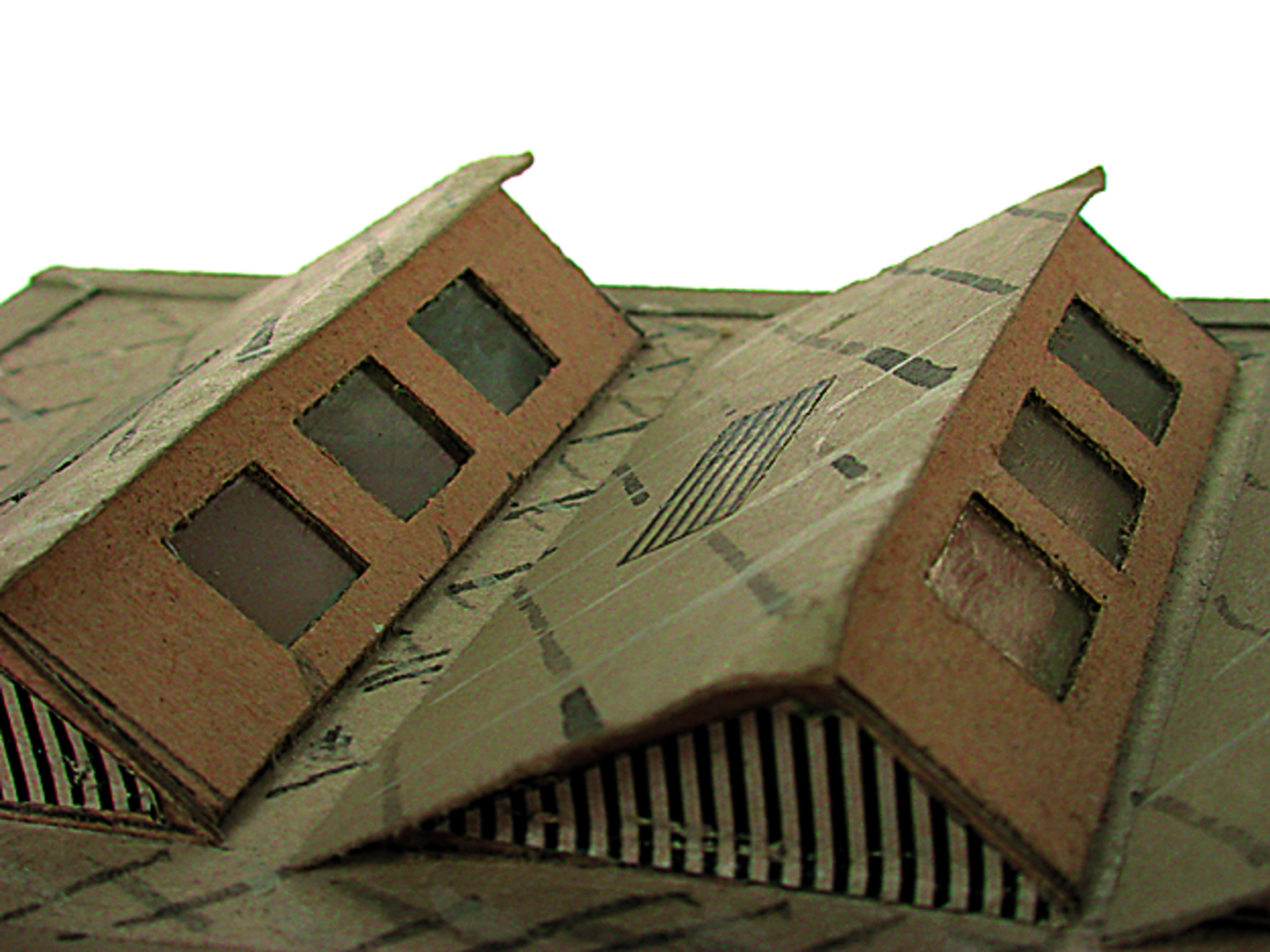 Anmerkung der Redaktion: Nicht von jedem Haus sind alle einzelnen verwendeten Materialien dokumentiert. Tatsächlich verbaute der Bastler auch Zigarettenschachteln, Spinnenpapier, Pappmaschee, Tapetenreste, Bunt- und Silberpapiere, Stoffe, Synthetikfasern, d-c-fix-Folien, Schriftproben, Zeitungsschnipsel und ausgewertete Illustrierte, Kartonagen, Holzabfälle aller Art, Uhu, Holzleim und Tapetenkleister.