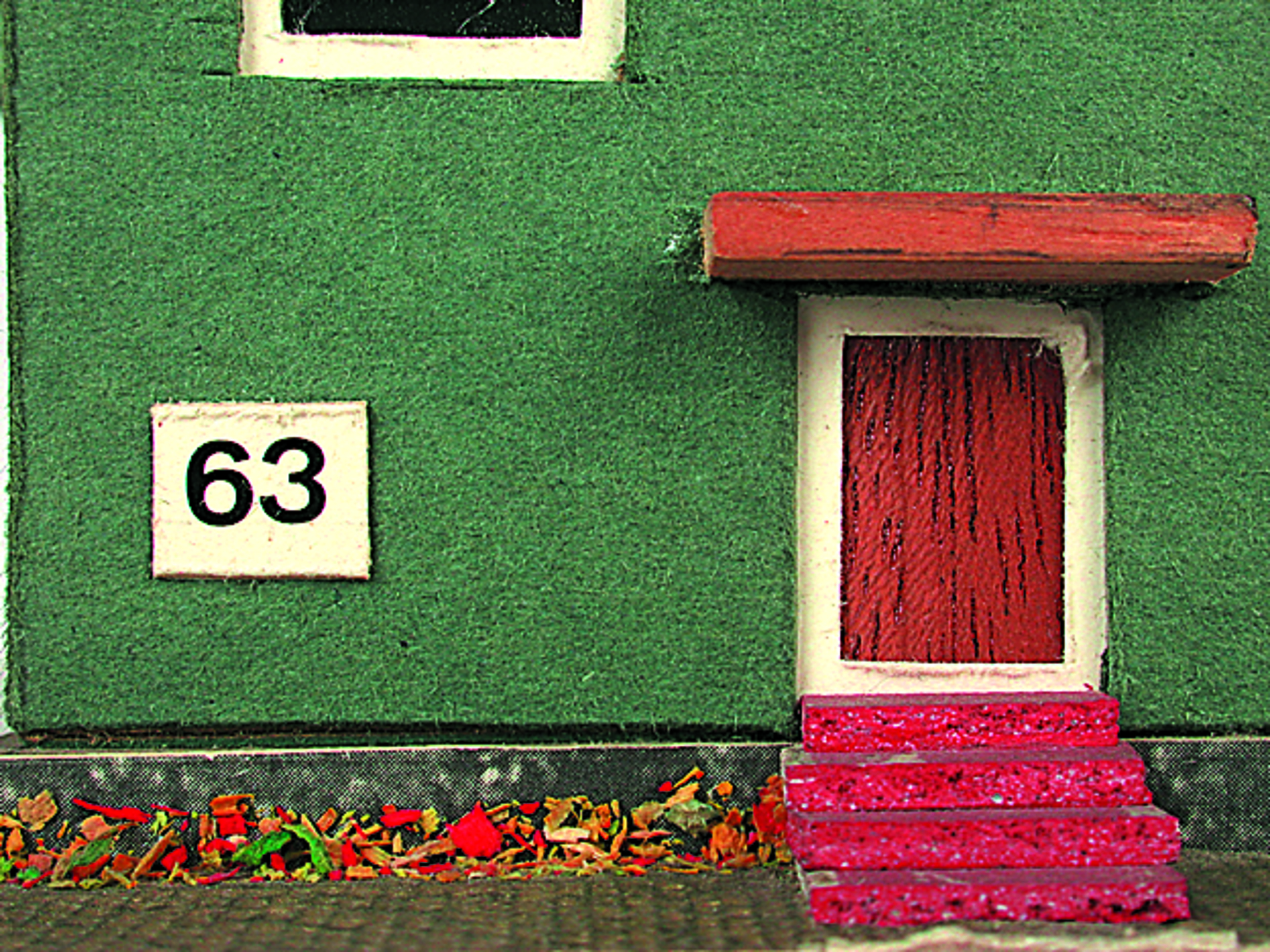Anmerkung der Redaktion: Nicht von jedem Haus sind alle einzelnen verwendeten Materialien dokumentiert. Tatsächlich verbaute der Bastler auch Zigarettenschachteln, Spinnenpapier, Pappmaschee, Tapetenreste, Bunt- und Silberpapiere, Stoffe, Synthetikfasern, d-c-fix-Folien, Schriftproben, Zeitungsschnipsel und ausgewertete Illustrierte, Kartonagen, Holzabfälle aller Art, Uhu, Holzleim und Tapetenkleister.
