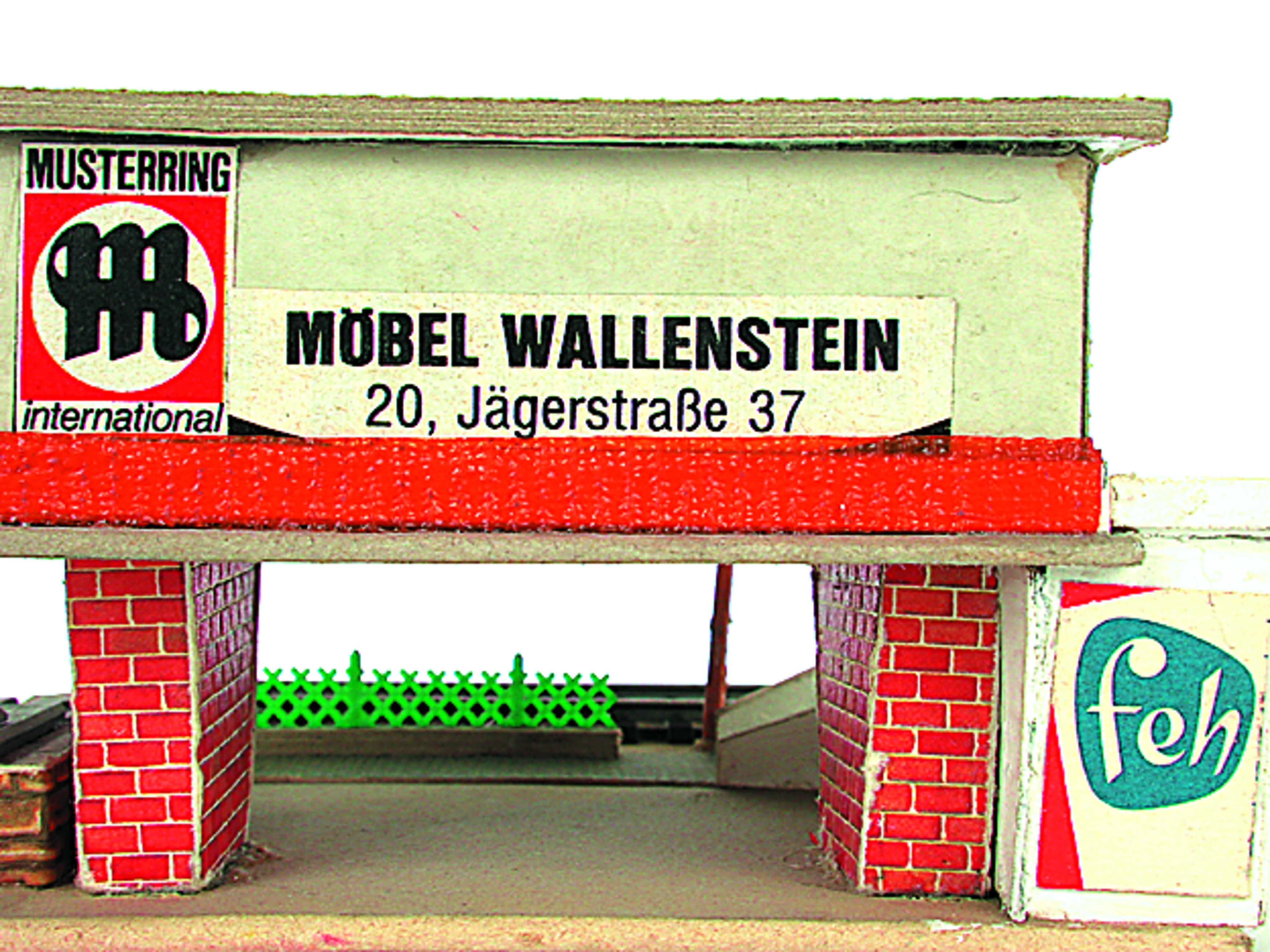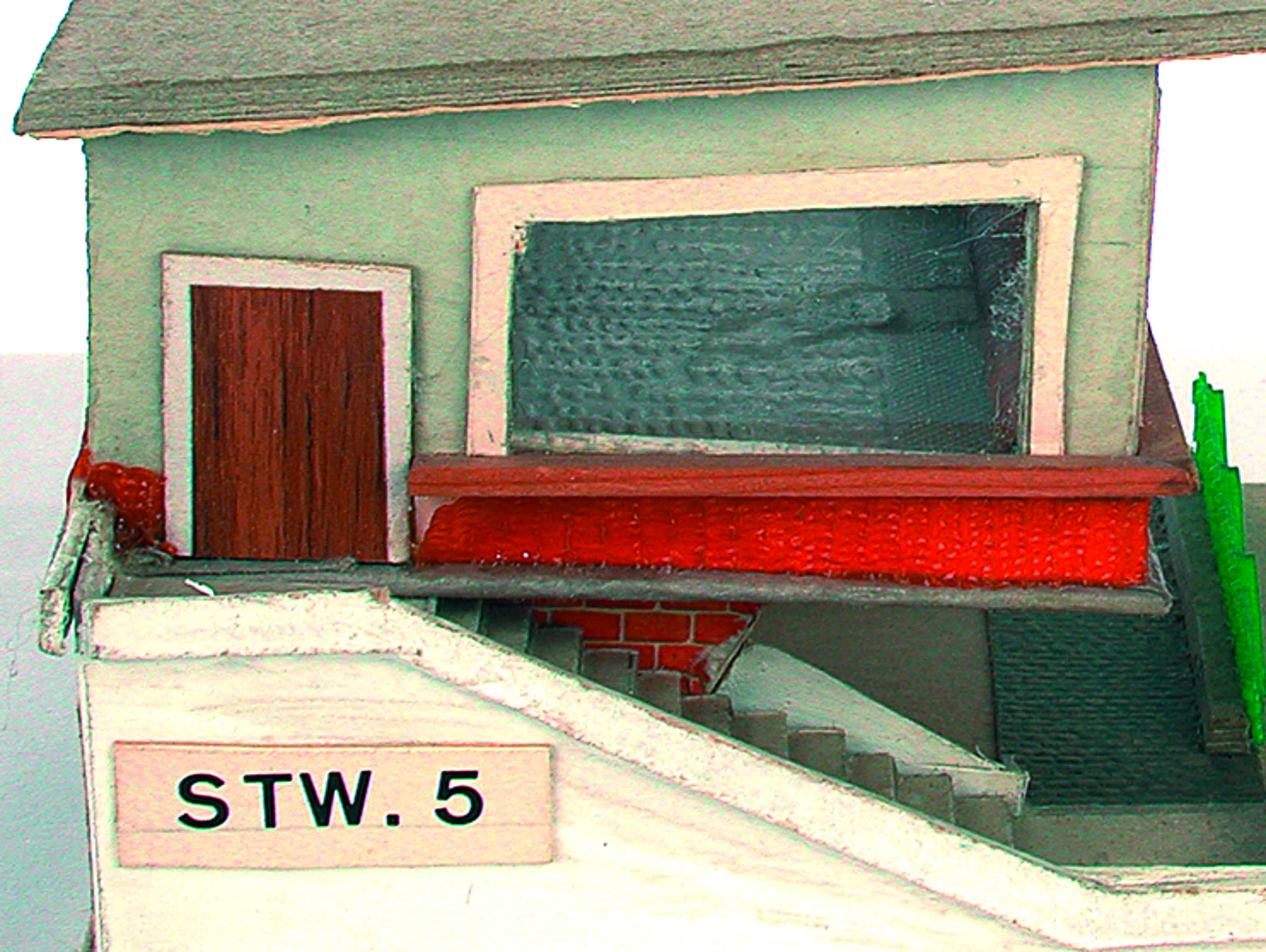 Anmerkung der Redaktion: Nicht von jedem Haus sind alle einzelnen verwendeten Materialien dokumentiert. Tatsächlich verbaute der Bastler auch Zigarettenschachteln, Spinnenpapier, Pappmaschee, Tapetenreste, Bunt- und Silberpapiere, Stoffe, Synthetikfasern, d-c-fix-Folien, Schriftproben, Zeitungsschnipsel und ausgewertete Illustrierte, Kartonagen, Holzabfälle aller Art, Uhu, Holzleim und Tapetenkleister.