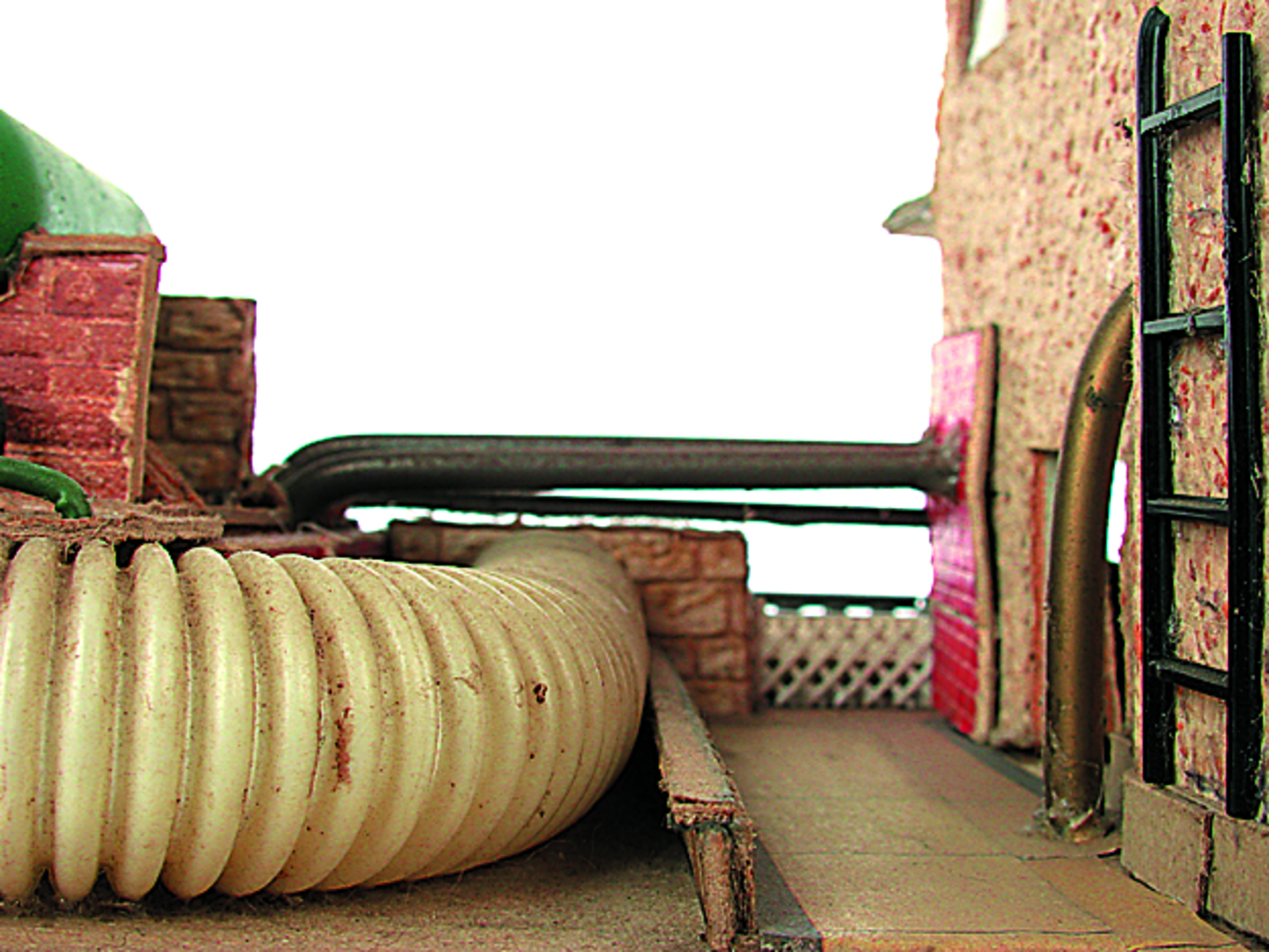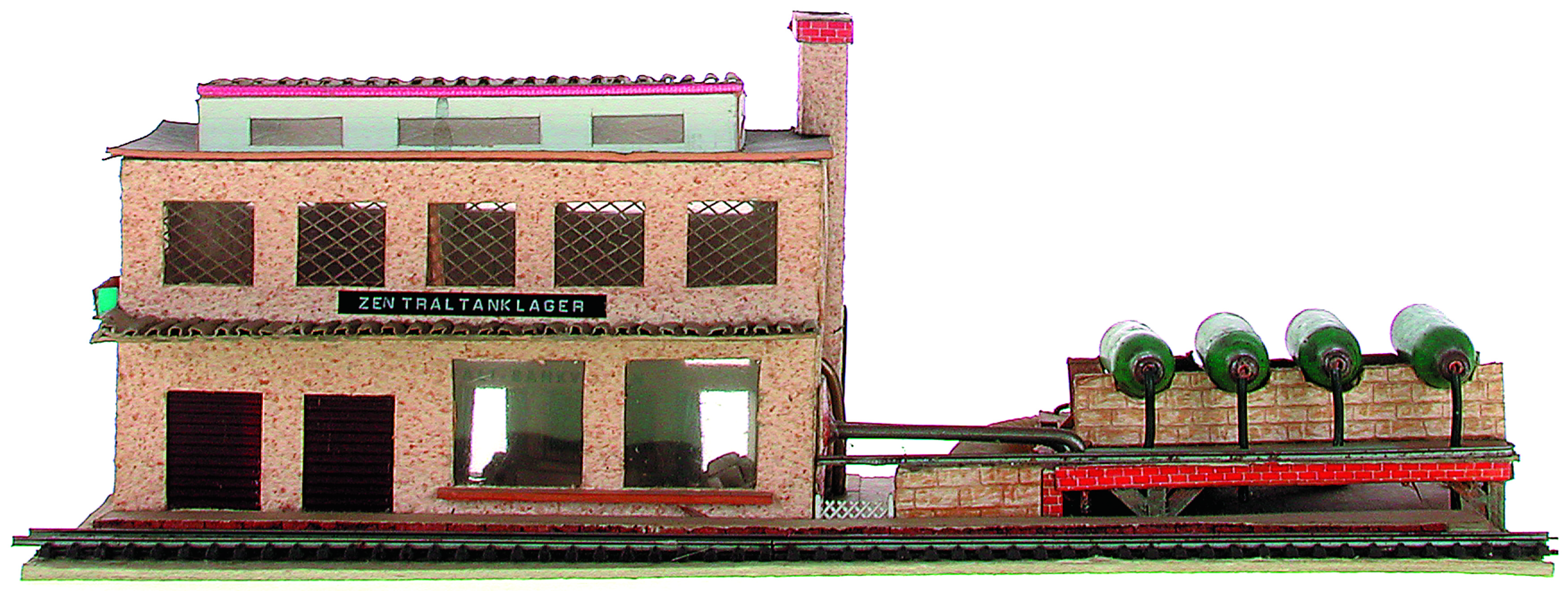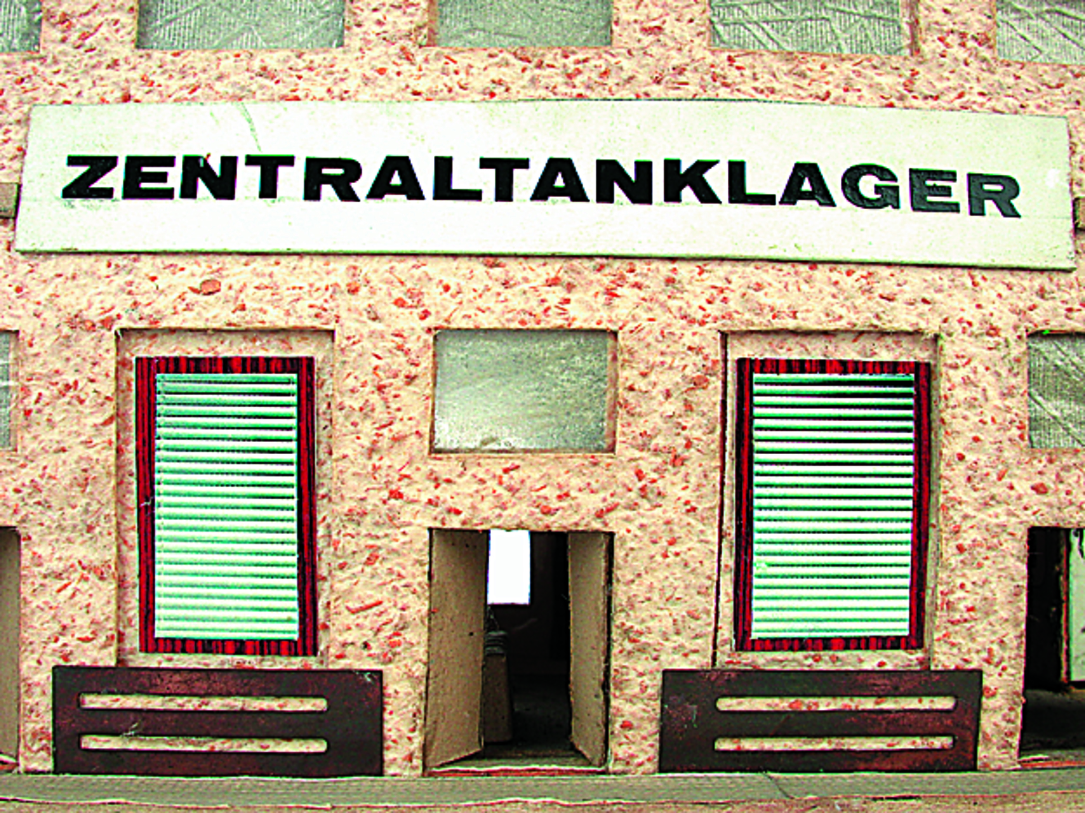 Anmerkung der Redaktion: Nicht von jedem Haus sind alle einzelnen verwendeten Materialien dokumentiert. Tatsächlich verbaute der Bastler auch Zigarettenschachteln, Spinnenpapier, Pappmaschee, Tapetenreste, Bunt- und Silberpapiere, Stoffe, Synthetikfasern, d-c-fix-Folien, Schriftproben, Zeitungsschnipsel und ausgewertete Illustrierte, Kartonagen, Holzabfälle aller Art, Uhu, Holzleim und Tapetenkleister.