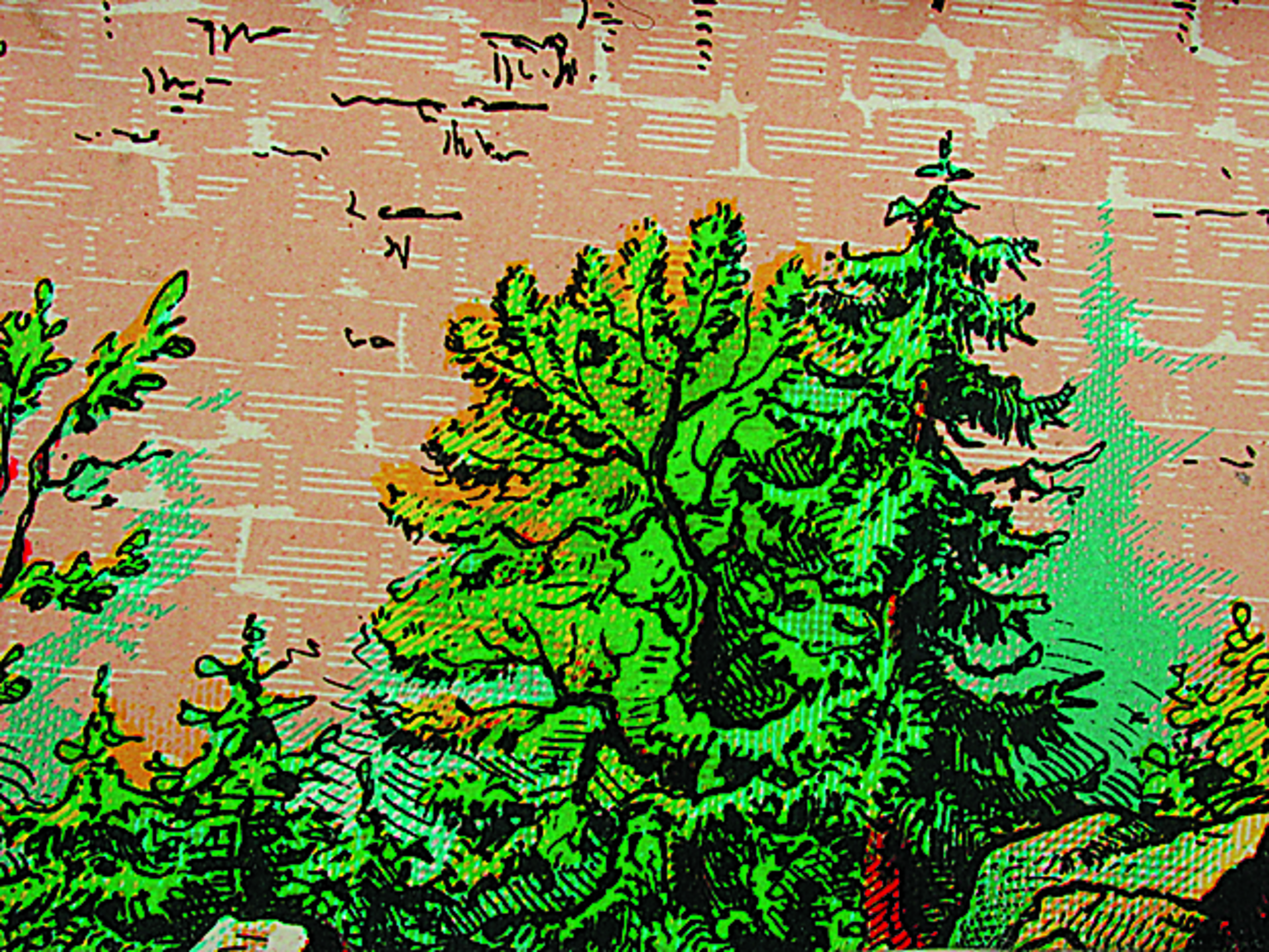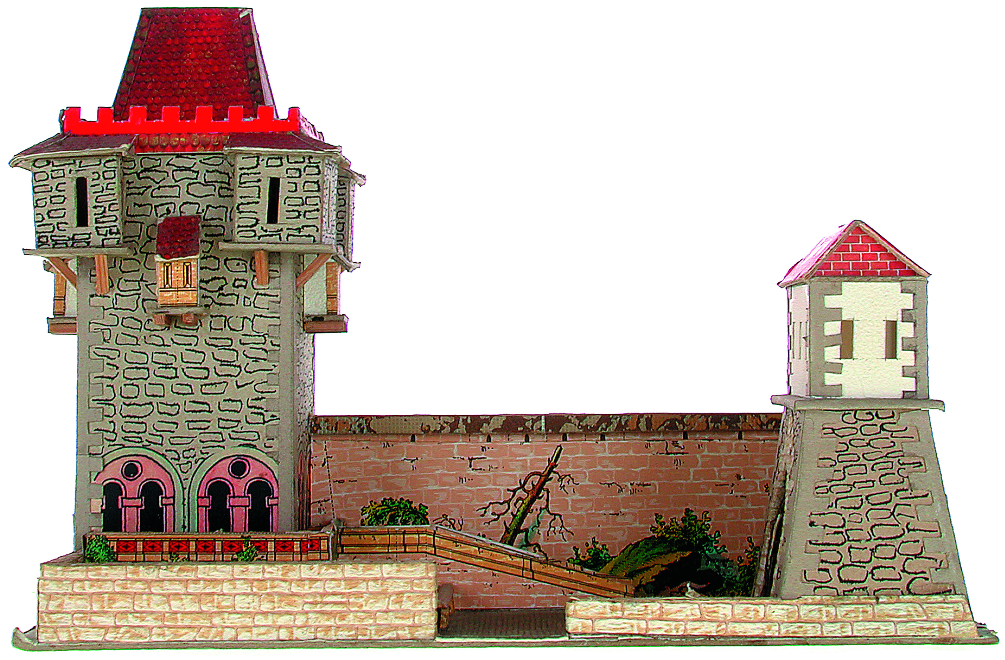 Anmerkung der Redaktion: Nicht von jedem Haus sind alle einzelnen verwendeten Materialien dokumentiert. Tatsächlich verbaute der Bastler auch Zigarettenschachteln, Spinnenpapier, Pappmaschee, Tapetenreste, Bunt- und Silberpapiere, Stoffe, Synthetikfasern, d-c-fix-Folien, Schriftproben, Zeitungsschnipsel und ausgewertete Illustrierte, Kartonagen, Holzabfälle aller Art, Uhu, Holzleim und Tapetenkleister.