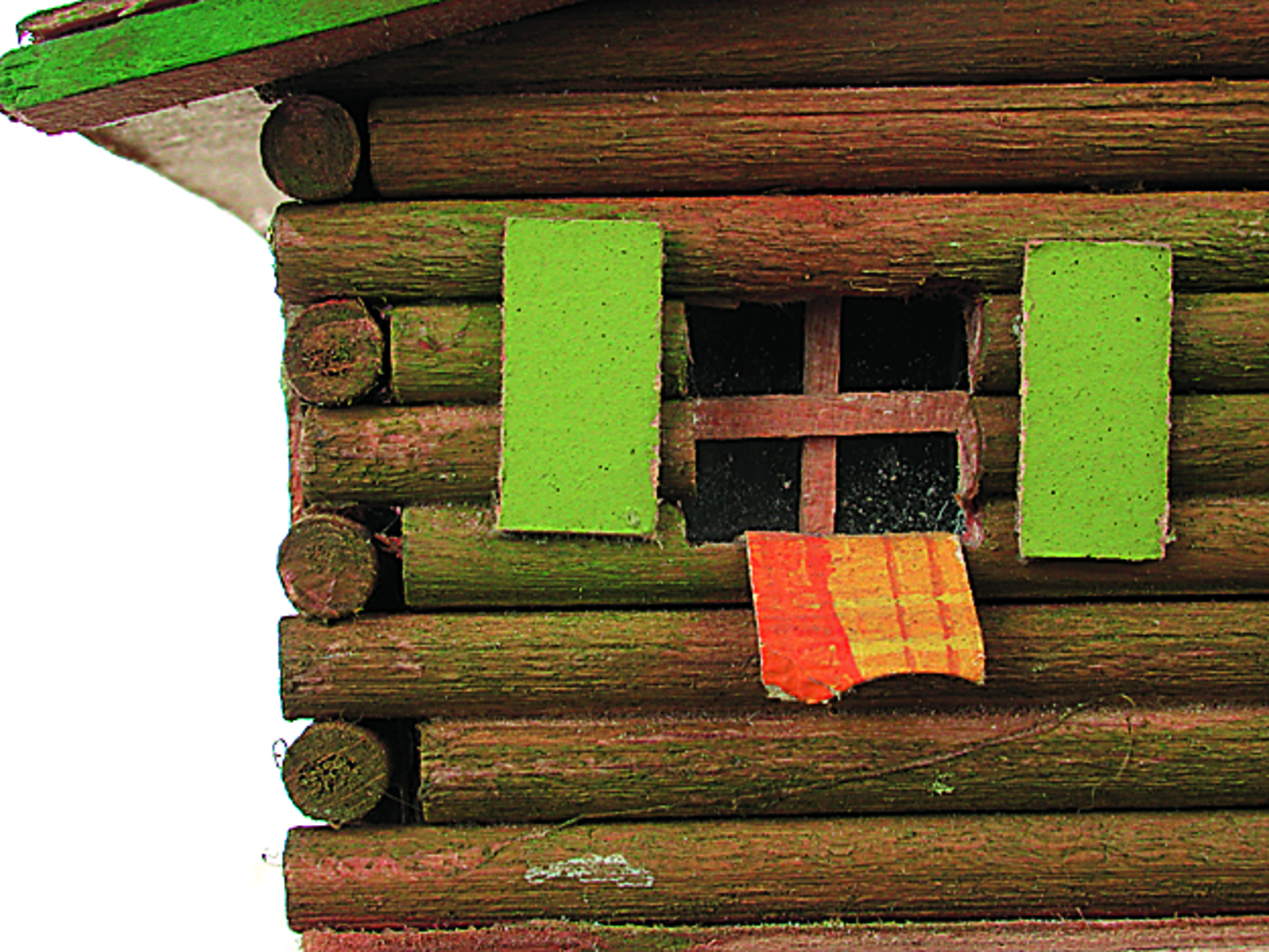 Anmerkung der Redaktion: Nicht von jedem Haus sind alle einzelnen verwendeten Materialien dokumentiert. Tatsächlich verbaute der Bastler auch Zigarettenschachteln, Spinnenpapier, Pappmaschee, Tapetenreste, Bunt- und Silberpapiere, Stoffe, Synthetikfasern, d-c-fix-Folien, Schriftproben, Zeitungsschnipsel und ausgewertete Illustrierte, Kartonagen, Holzabfälle aller Art, Uhu, Holzleim und Tapetenkleister.