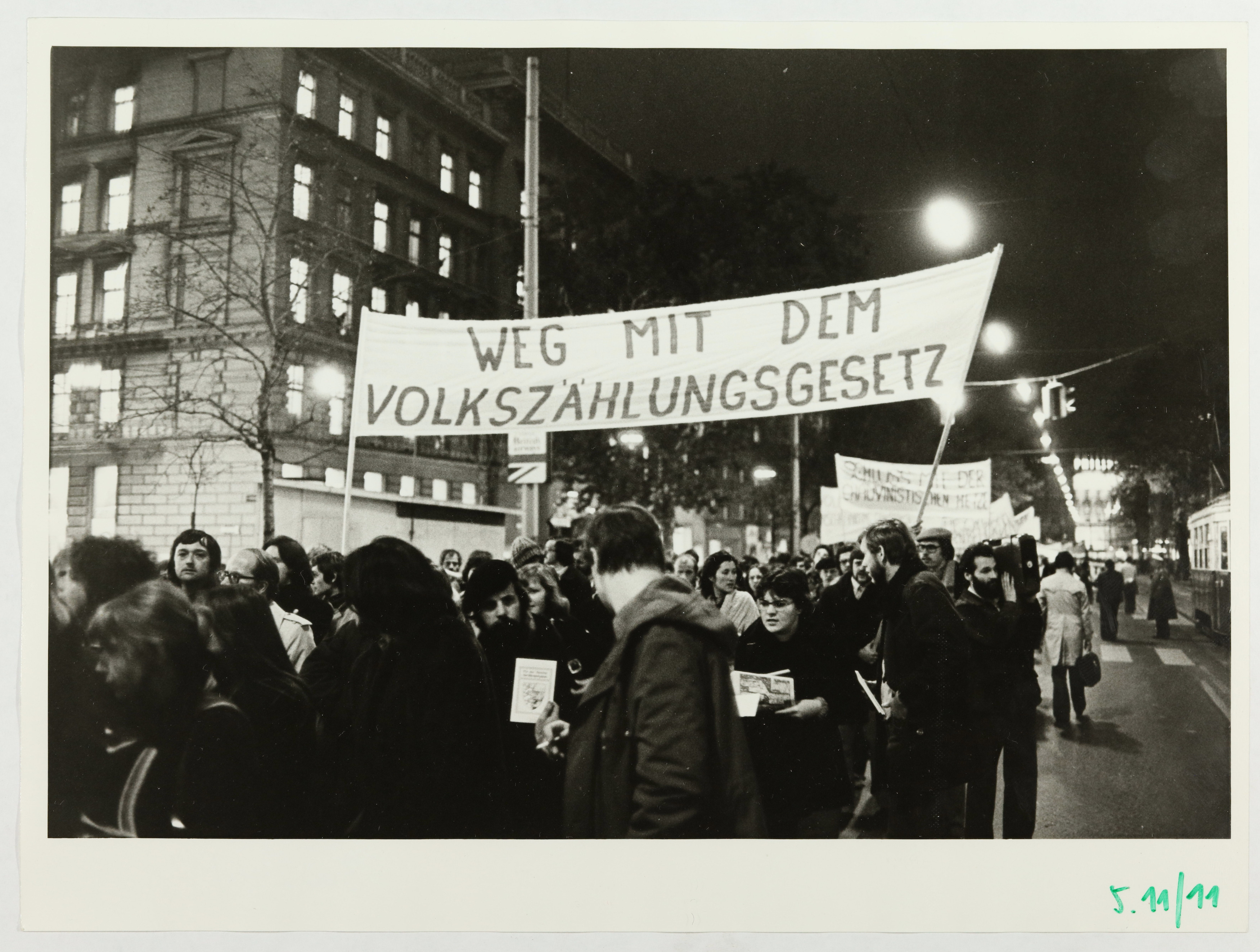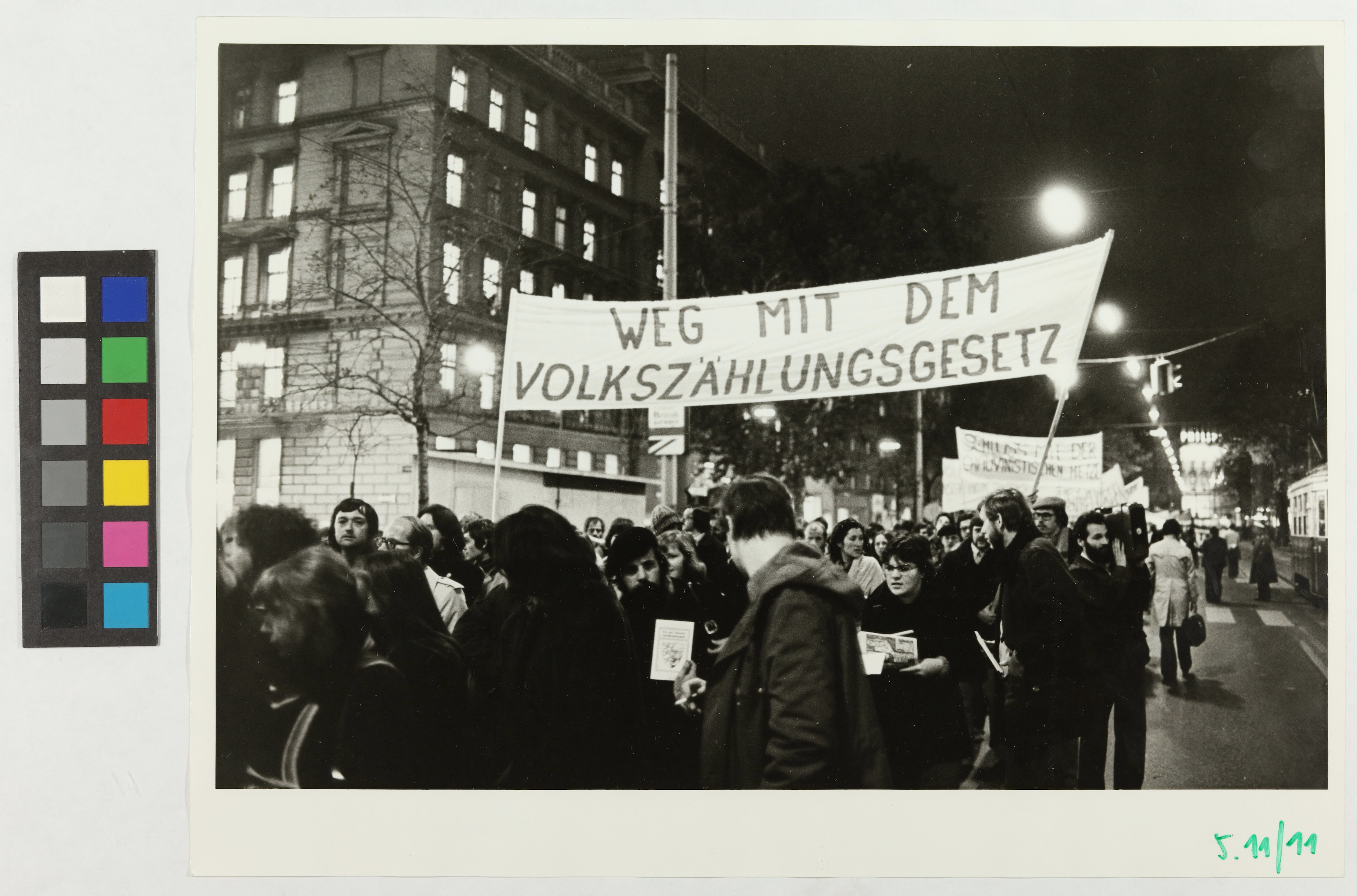 Demonstration für die Rechte der slowenischen Volksgruppe in Kärnten und die Durchsetzung von Artikel 7 des Staatsvertrages. DemonstrantInnen auf dem Kärntner Ring, 5.11.1976