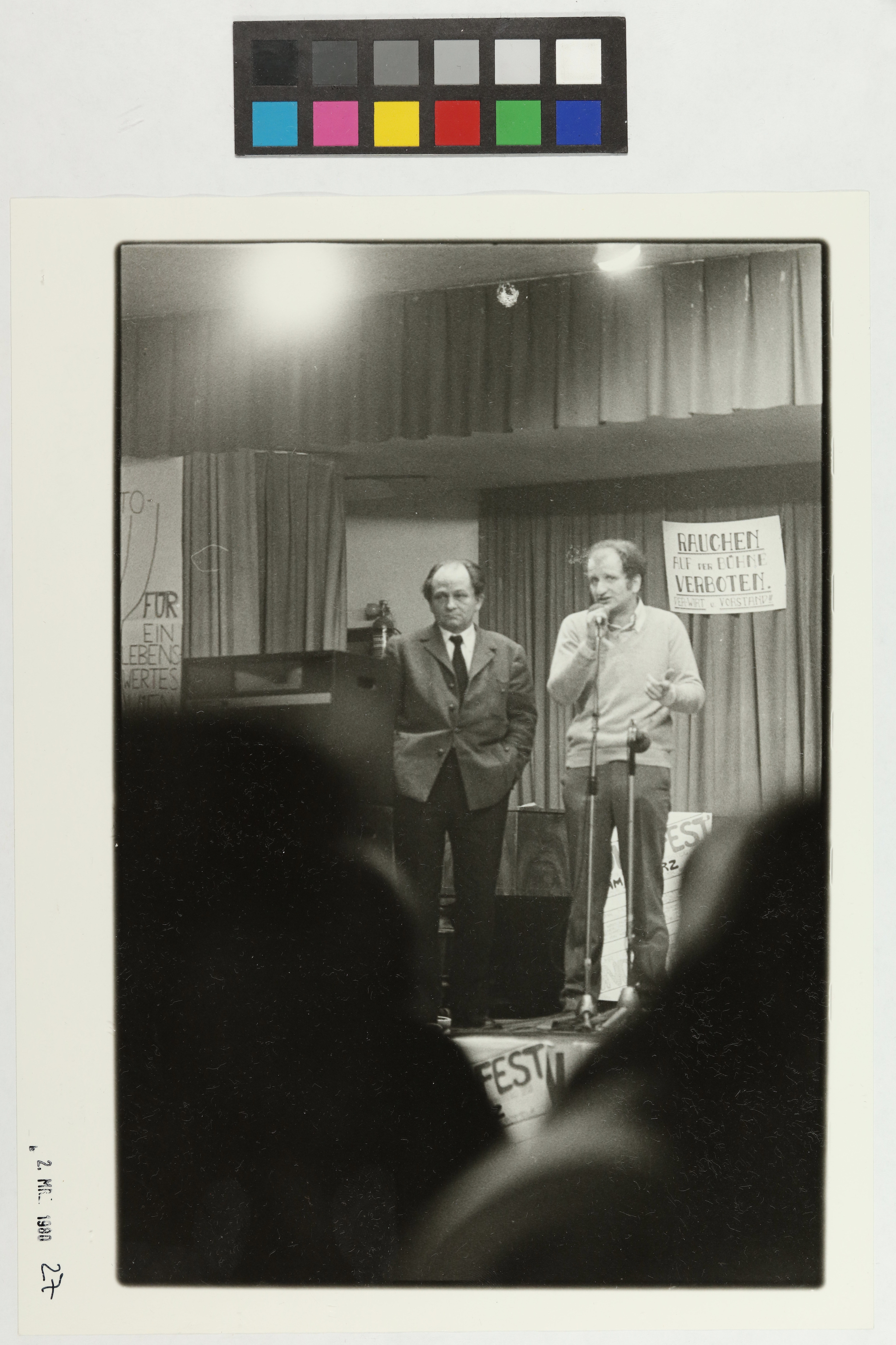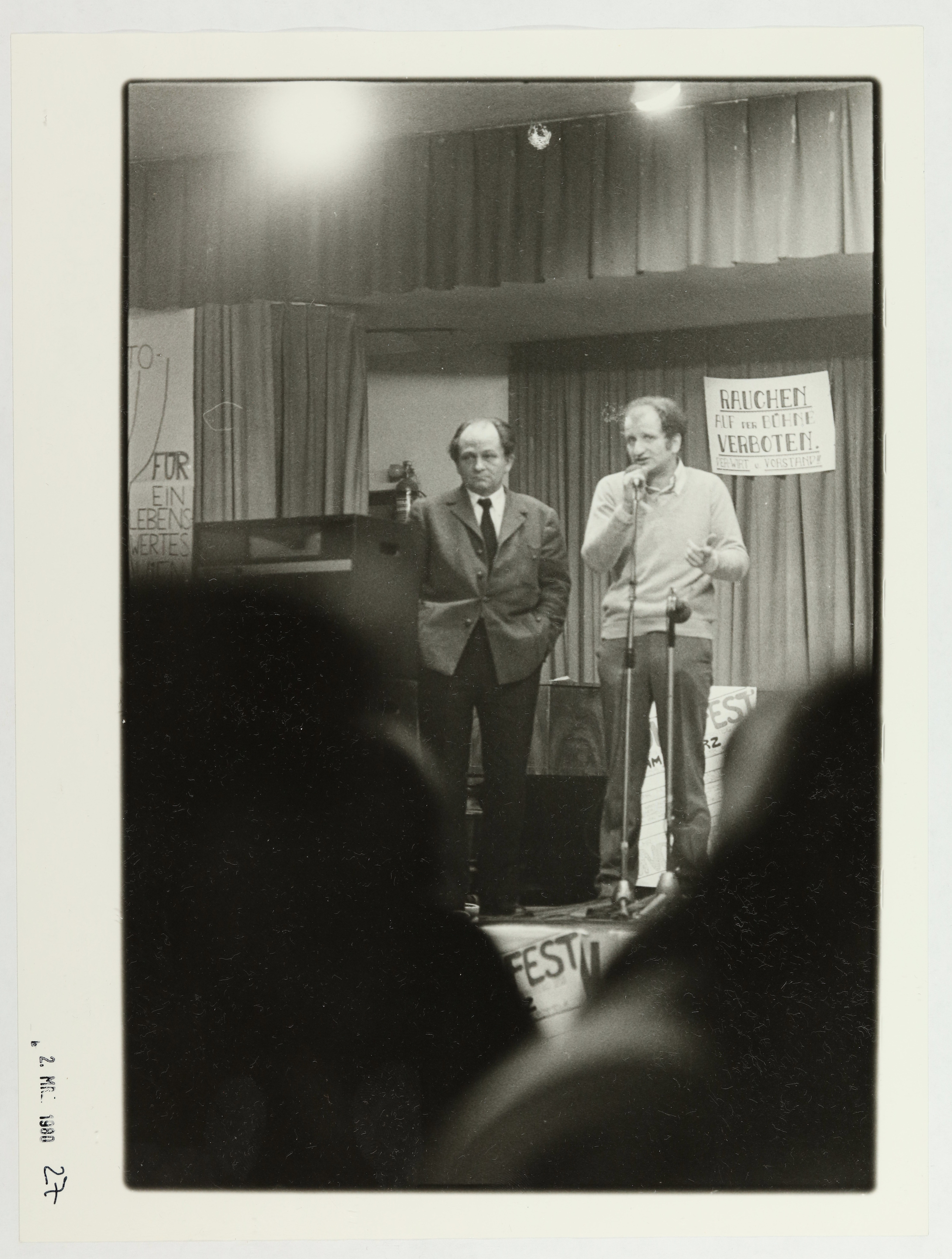 "Volksfest" der "Bürgerinitiative Flötzersteig XVI" gegen den Ausbau der Straße über den Flötzersteig aus Anlass der Volksbefragung (16.-18.3.1980). Schutzhaus "Zur Zukunft" (15., Auf der Schmelz), 2.3.1980. Von links Jörg Mauthe, Peter Kreisky
