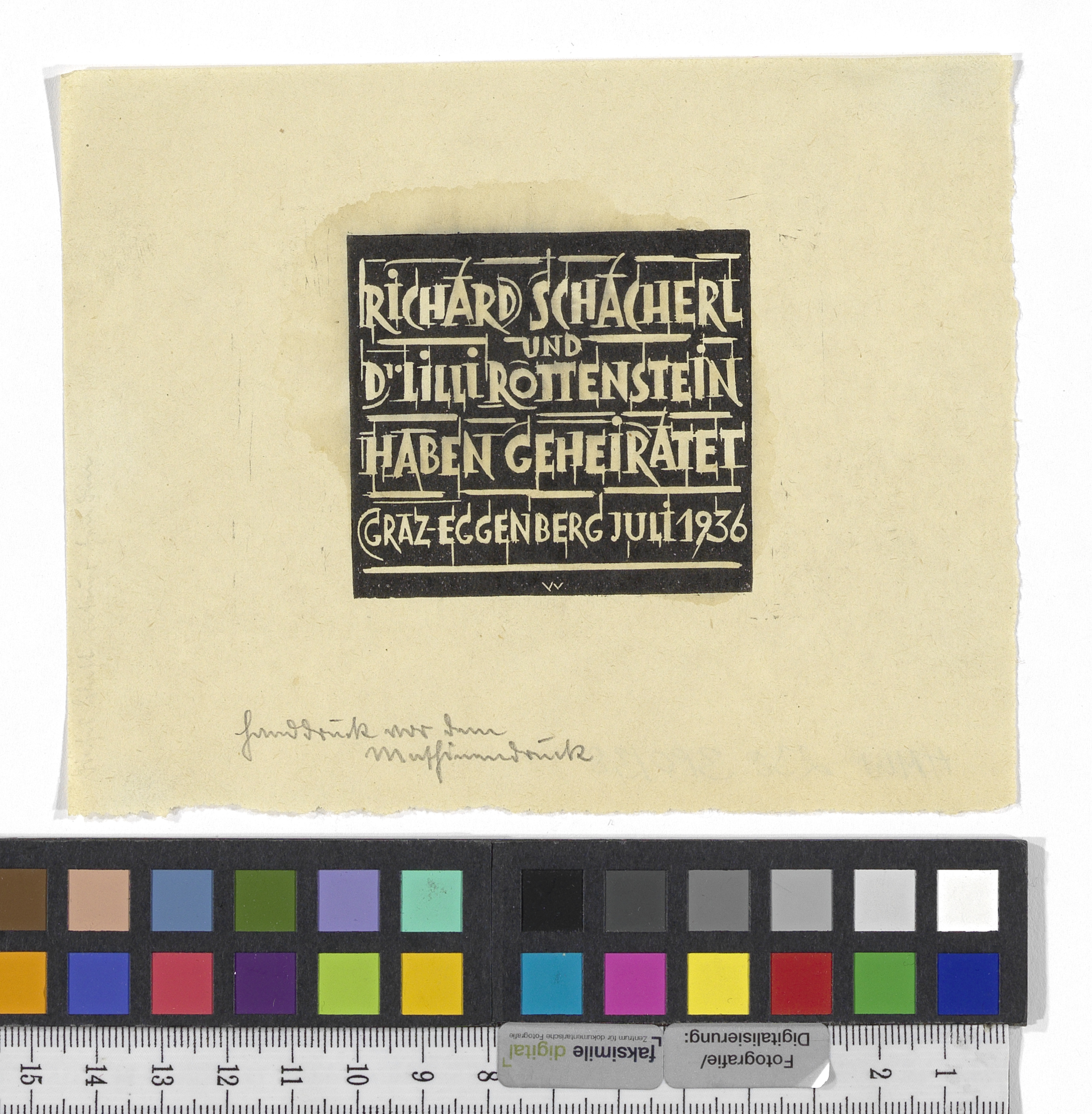 Hochzeitsanzeige "Richard Schacherl / und/ Dr Lilli Rottenstein/ haben geheiratet/ Graz Eggenberg Juli 1936"