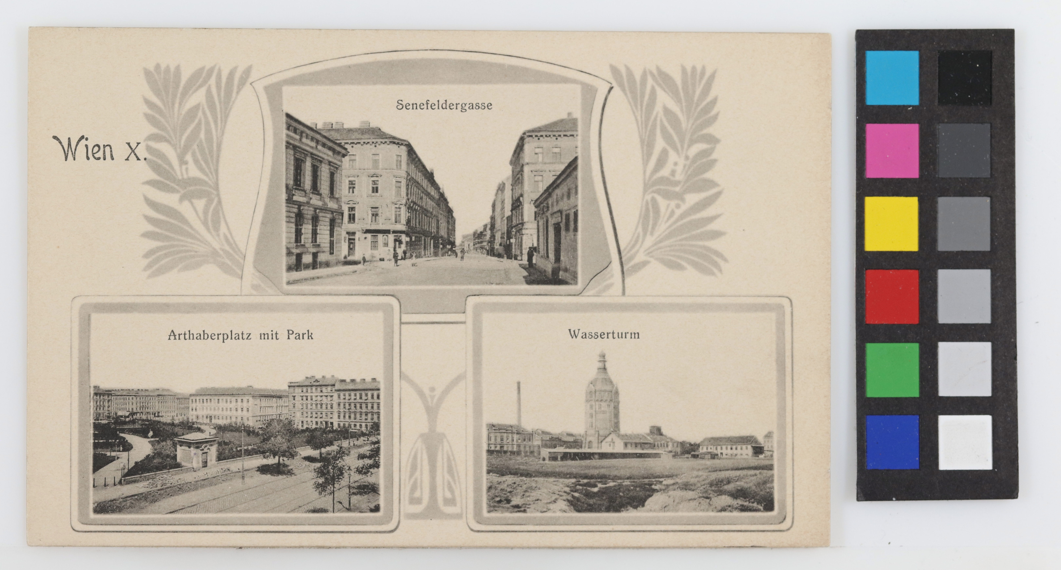 10., Allgemein - Mehrbildkarte: Senefeldergasse, Arthaberplatz mit Park und Wasserturm, Ansichtskarte
