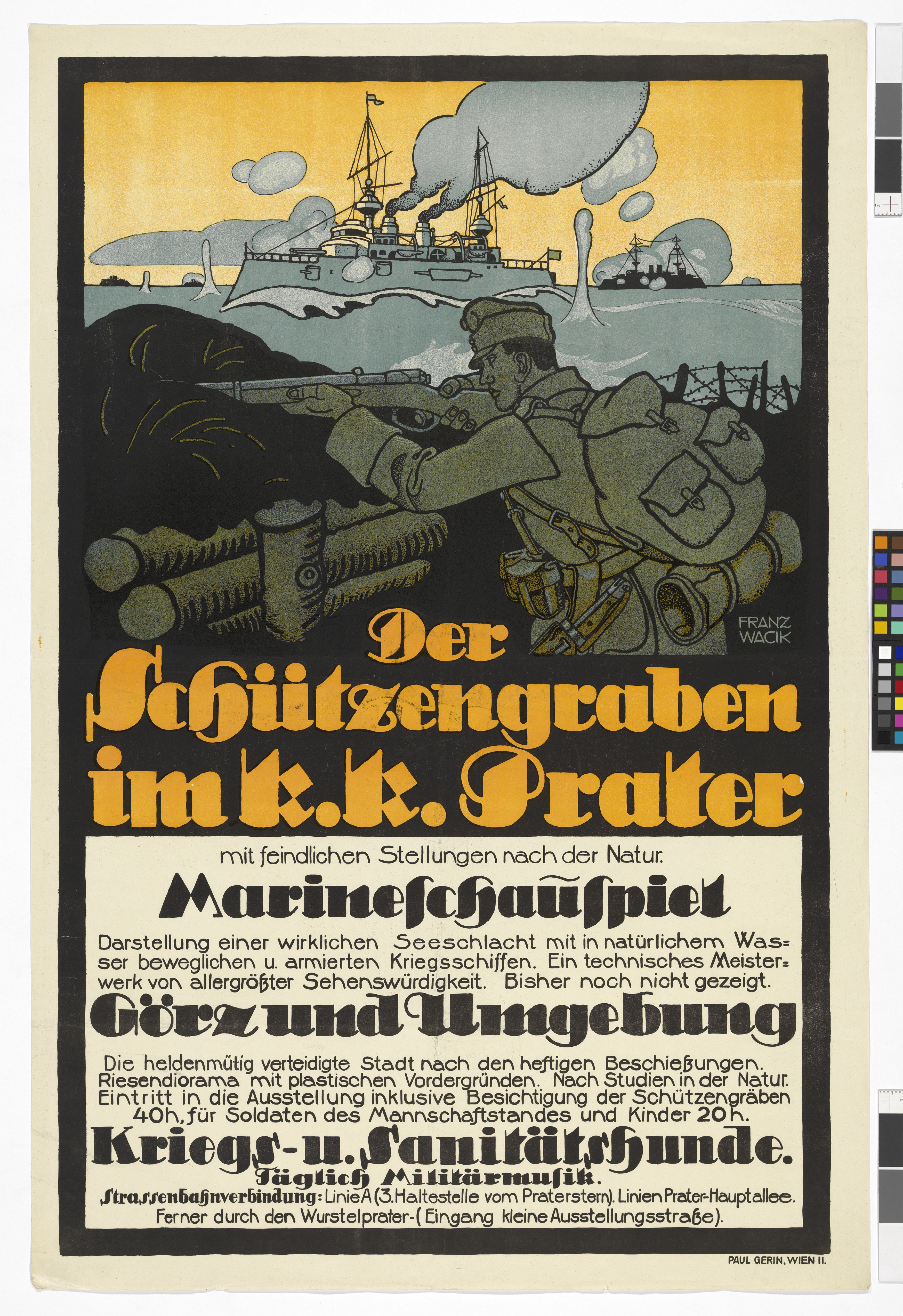 Plakat für die Kriegsausstellung 1916: "Schützengraben im k. k. Prater", "Marineschauspiel", "Riesendiorama" von "Görz und Umgebung" und "Kriegs- und Sanitätshunde"