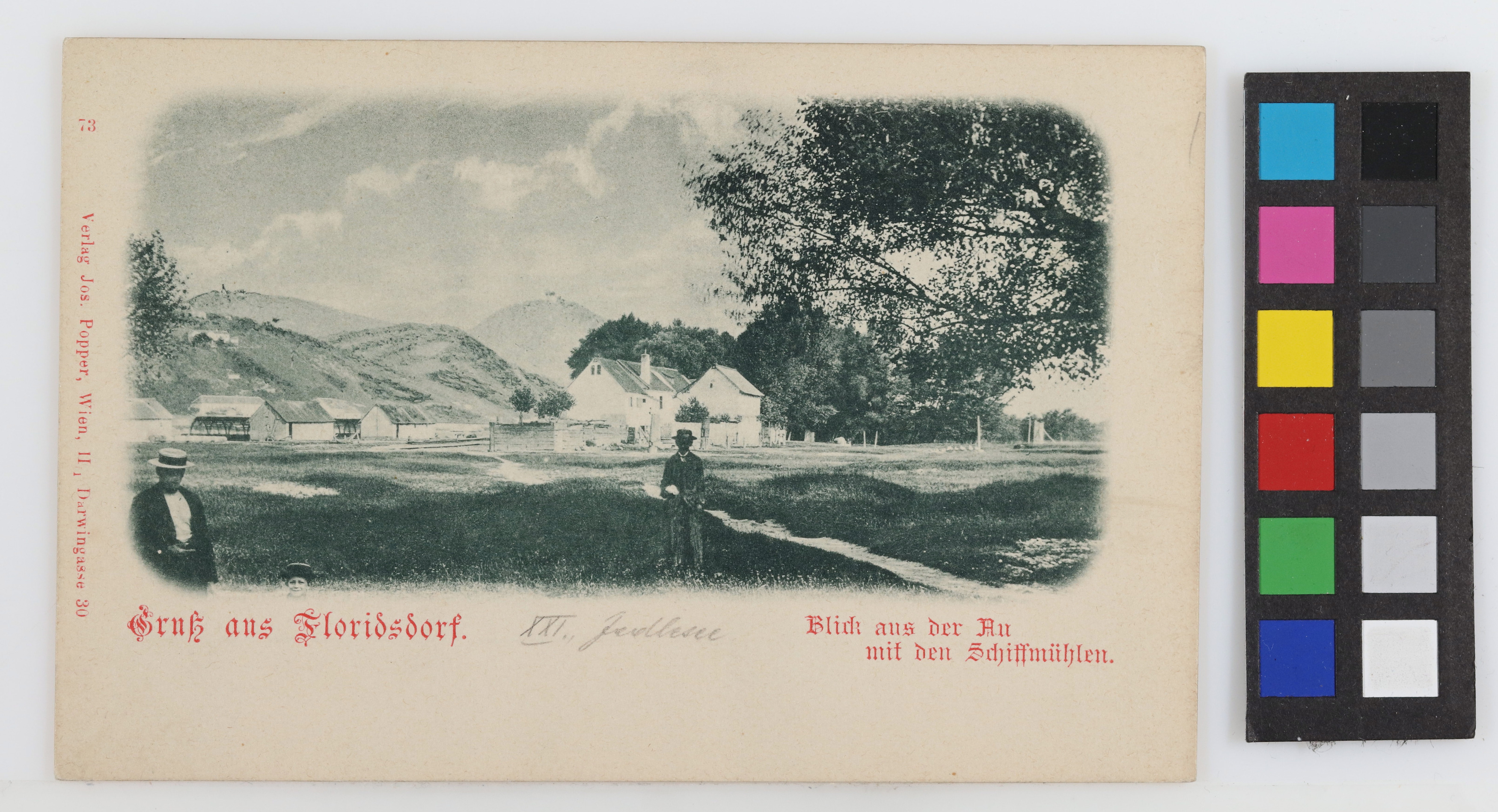21., Jedlesee - Blick aus der Au mit den Schiffmühlen gegen Kahlenberg und Leopoldsberg, Ansichtskarte