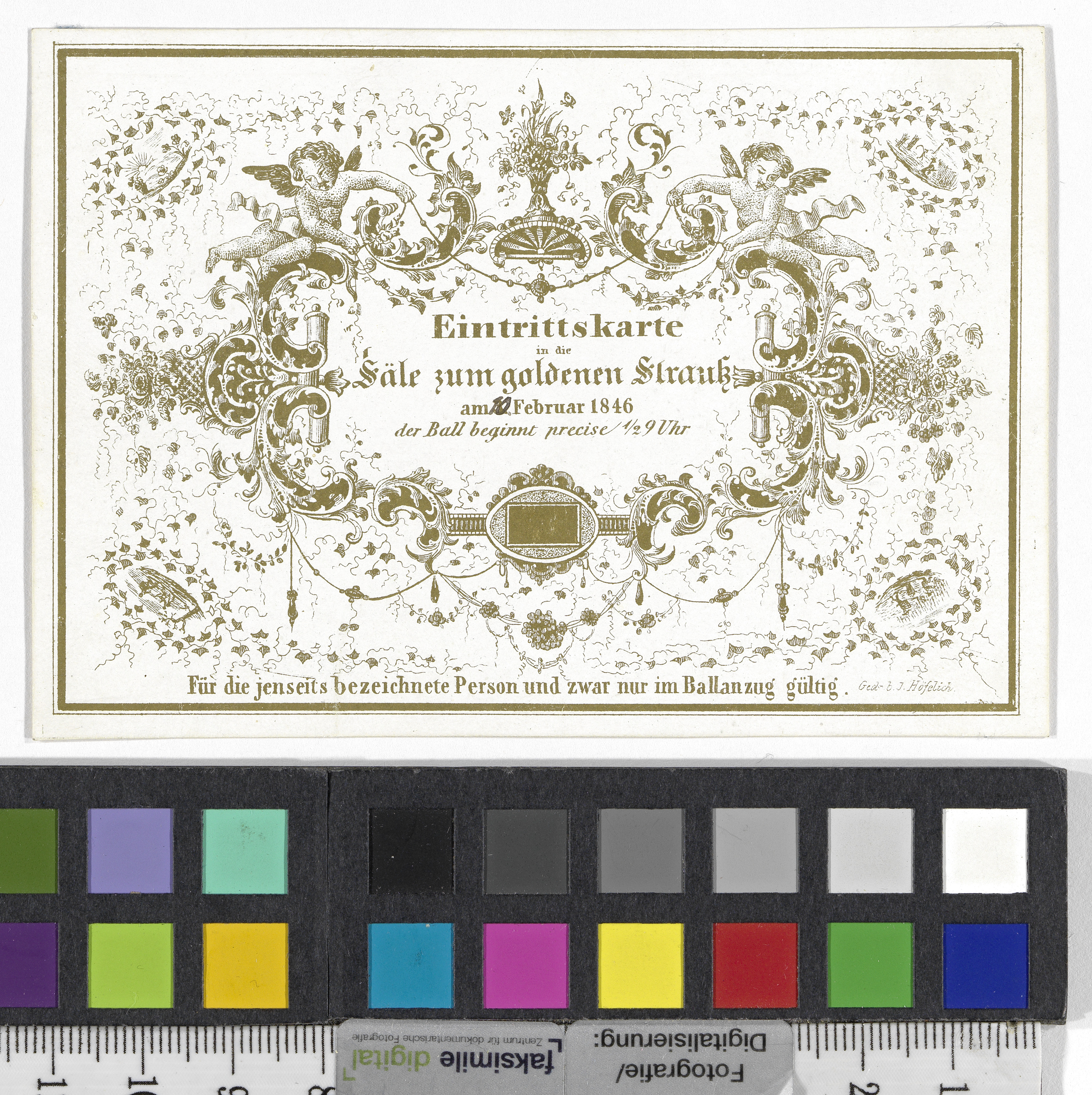 Goldfarbene, mit Engeln, kleinen, kaum erkennbaren Landschaftsszenen und zahlreichen Ornamenten verzierte Kartusche mit Text: “Eintrittskarte / in die / Säle zum goldenen Strauß / am 3. [handschriftlich korrigiert: 10.] Februar 1846 / der Ball beginnt precise 1/2 9 Uhr / Für die jenseits bezeichnete Person und zwar nur im Ballanzug gültig.”