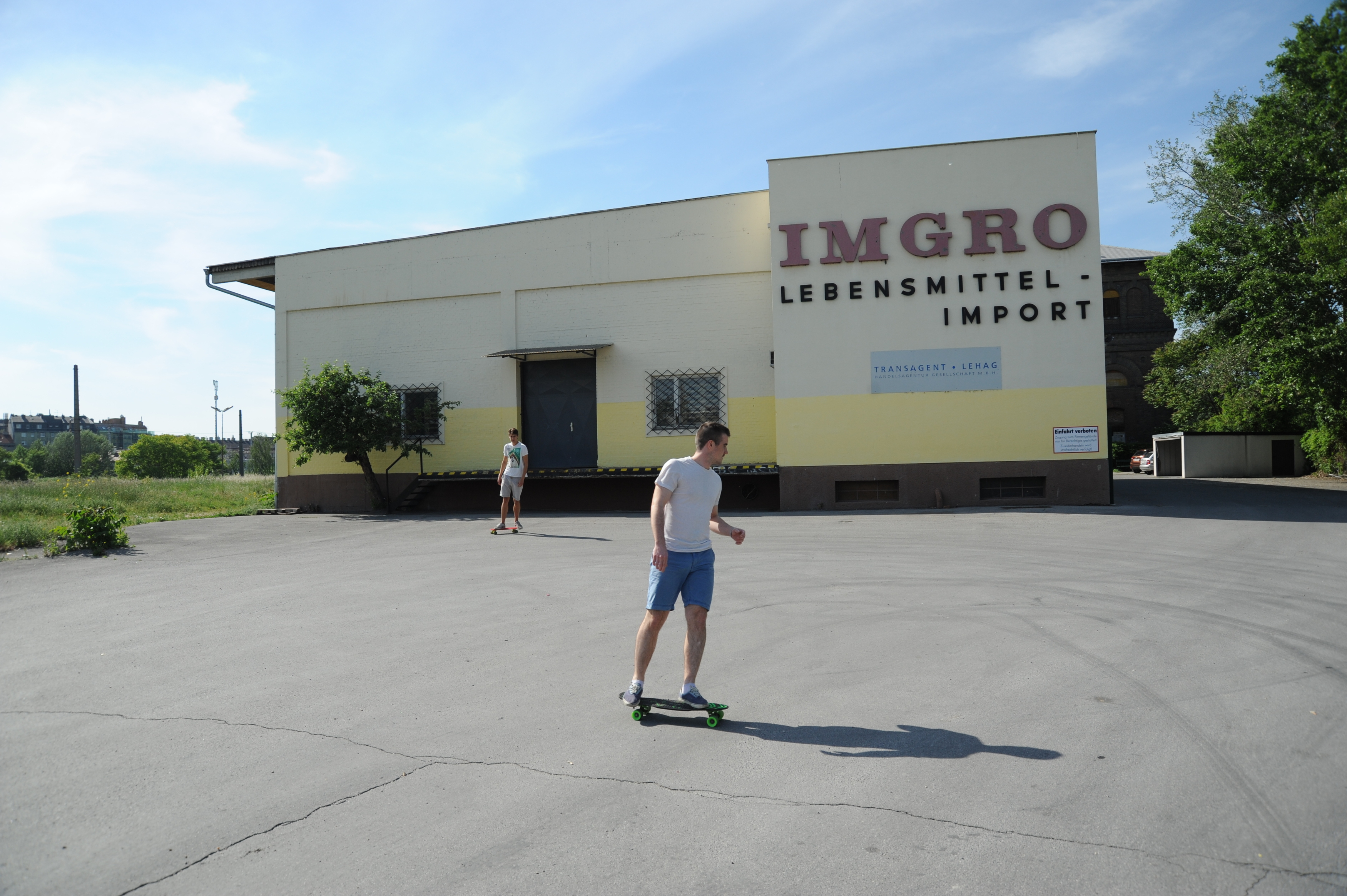 2., ehem. Nordbahnhofgelände, Frachtenbahnhof - Leystraße mit Lagerhalle von IMGRO-Lebensmittel-Import und Inline-Skatern