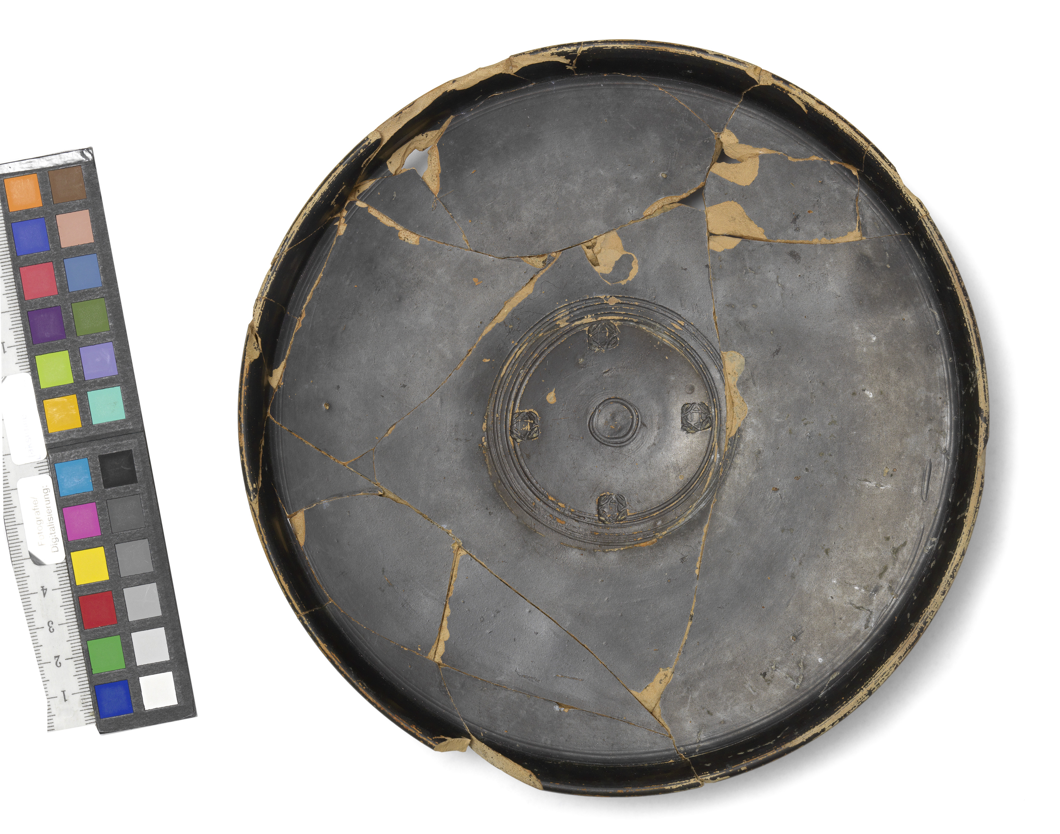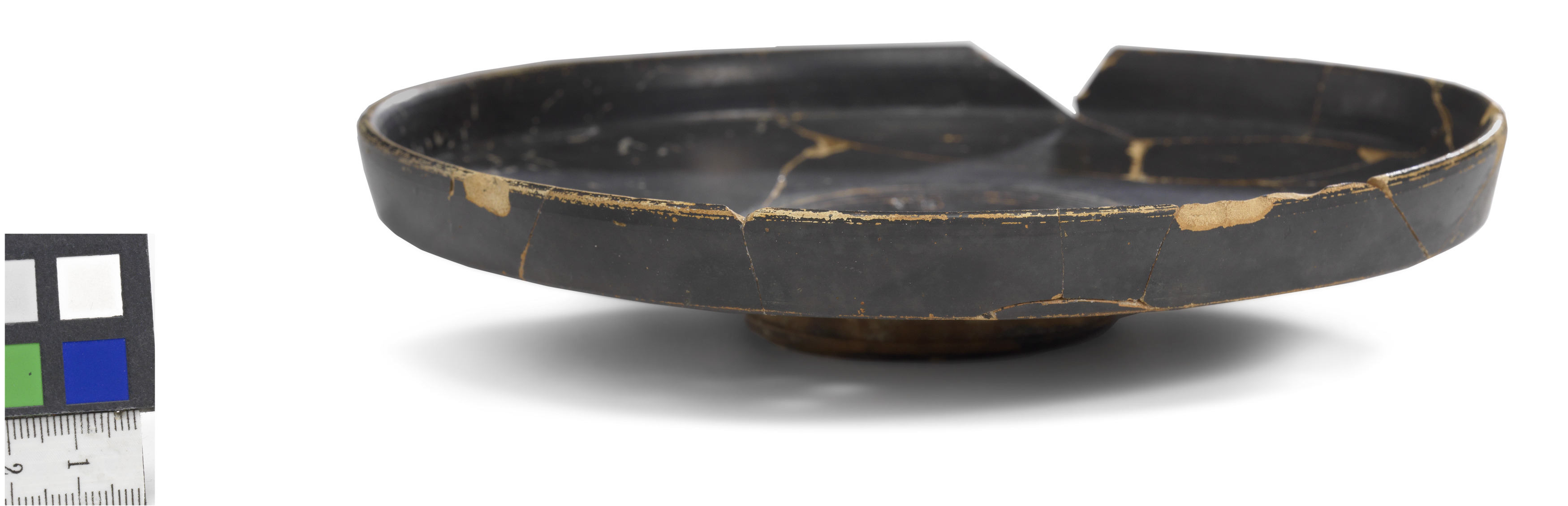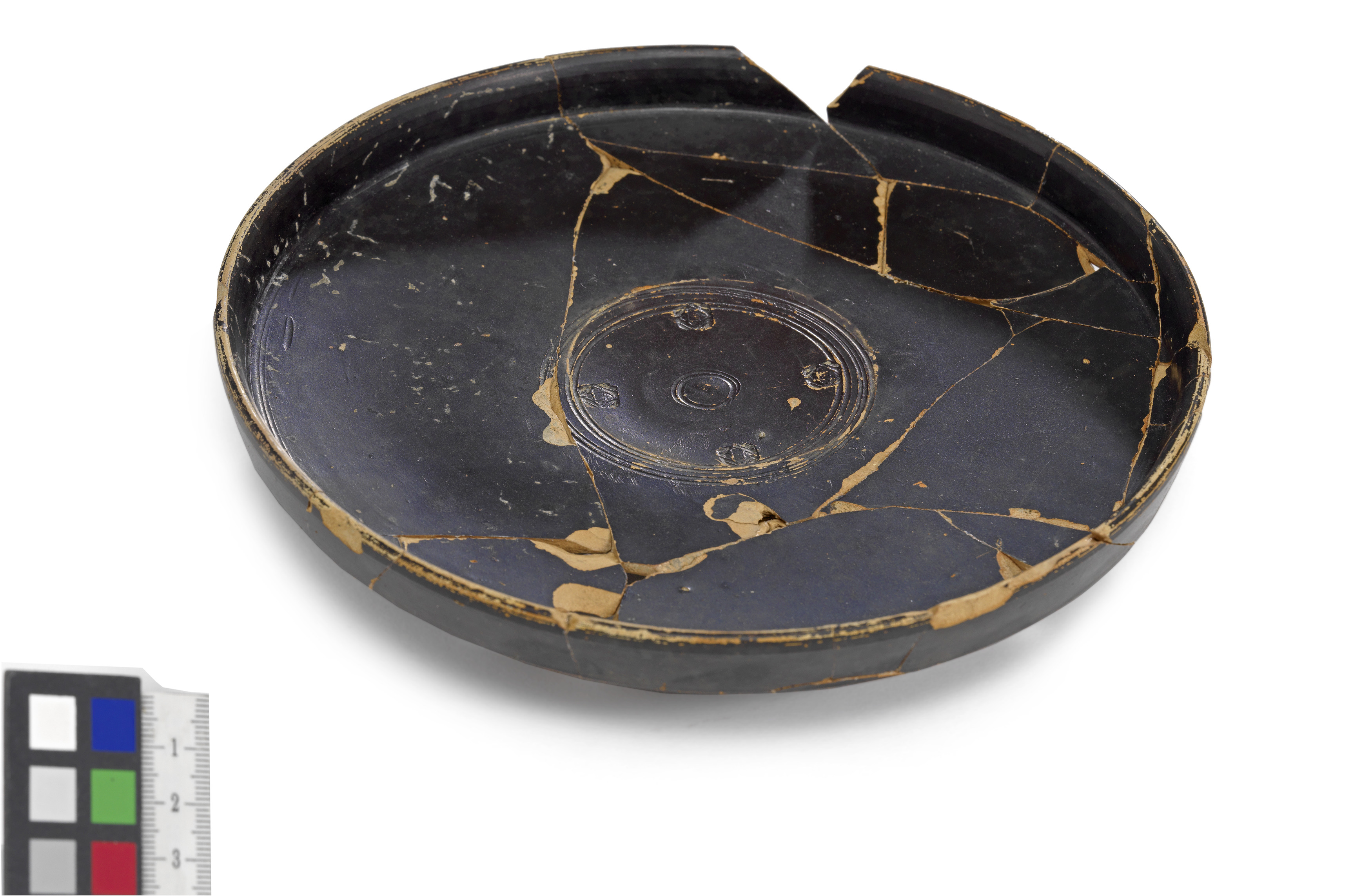 Campana-Teller Lamb. 7 mit steilem Rand und annähernd flachem Boden, aus hellbraun brennendem Ton gefertigt, mit schwarzer Engobe überzogen. In der Mitte Kreislinien, darin vier kleine rechteckige Stempel; im Zentrum doppelte Kreislinie.