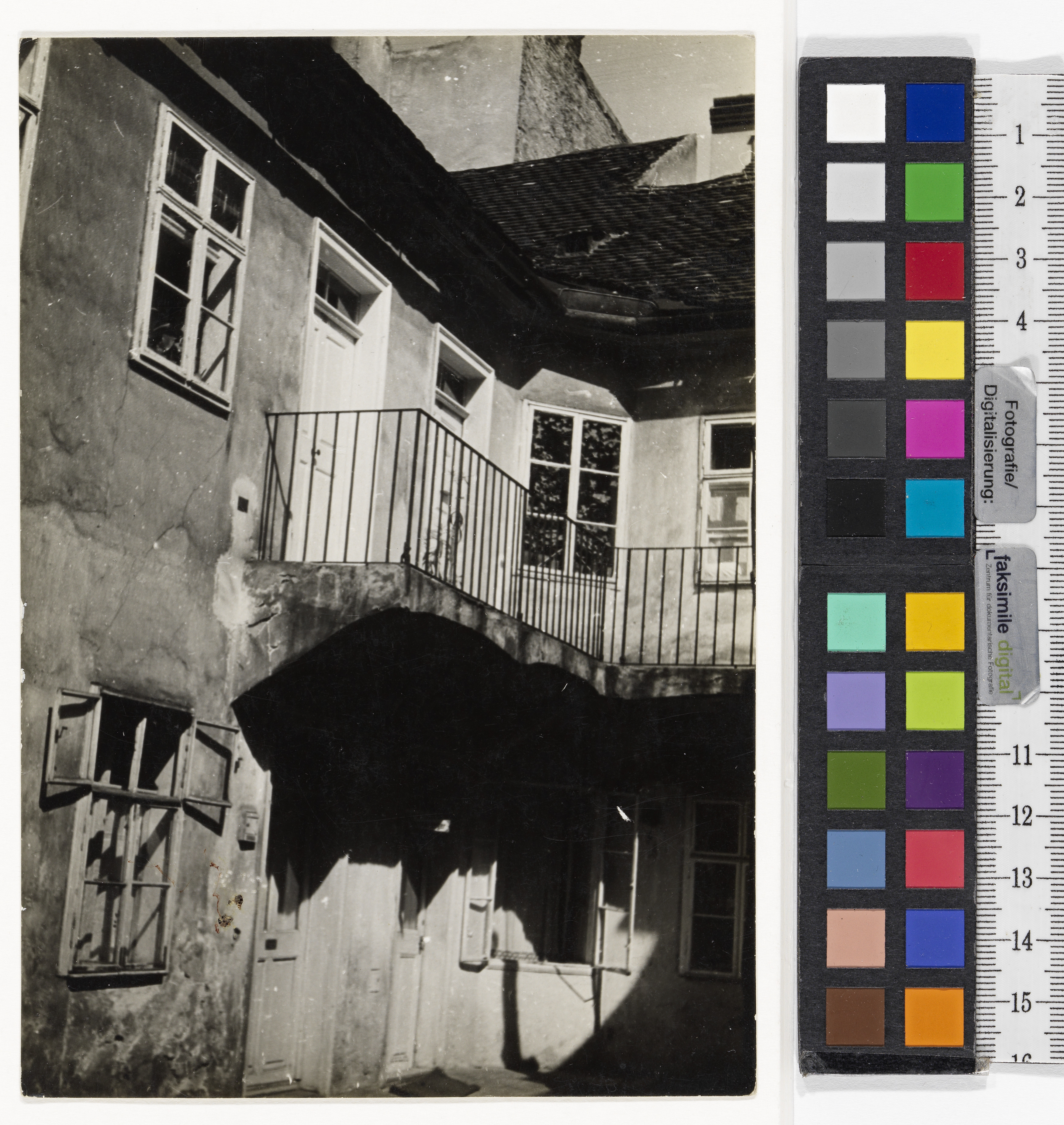 - Foto: RS: Mi.o.: ““Pawlatschen”-type of balcony / suburban apt. houses at the / inner city this photograph from Döbling / Hof eines / alten Vorstadthauses, Döbling / mit der typischen / “Pawlatschen”, dem / offenen Gang um den 1. Stock / Photo Ing. Robert Haas” (Bleistift)