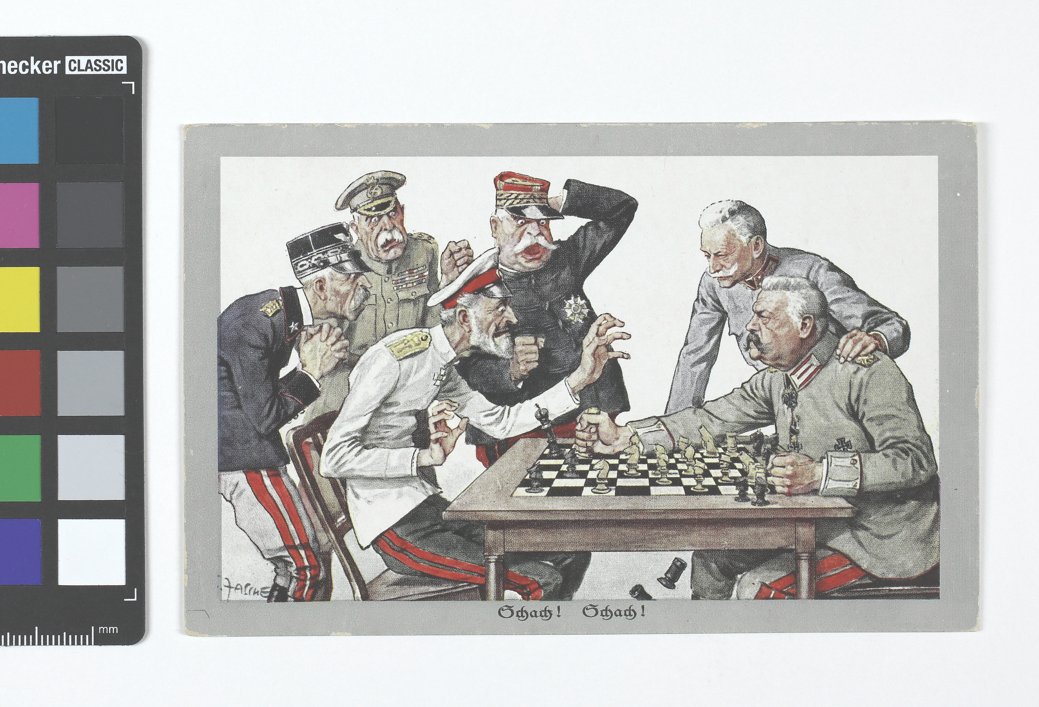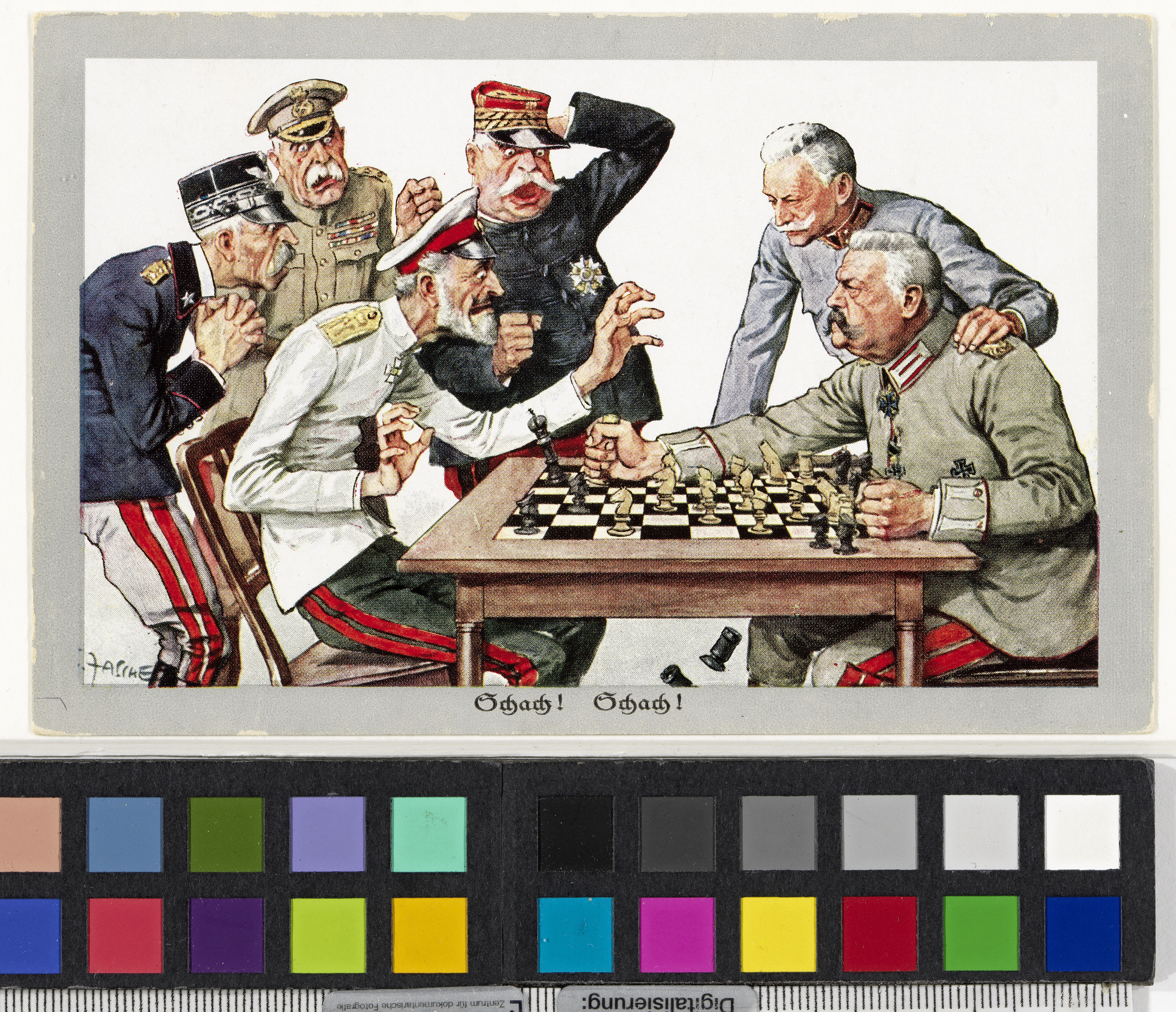 - Kriegspostkarte mit politisch-satyrischer Darstellung: Schachspiel von Hötzendorfs und von Hindenburgs gegen Vertreter der 4 feindl. Großmächte