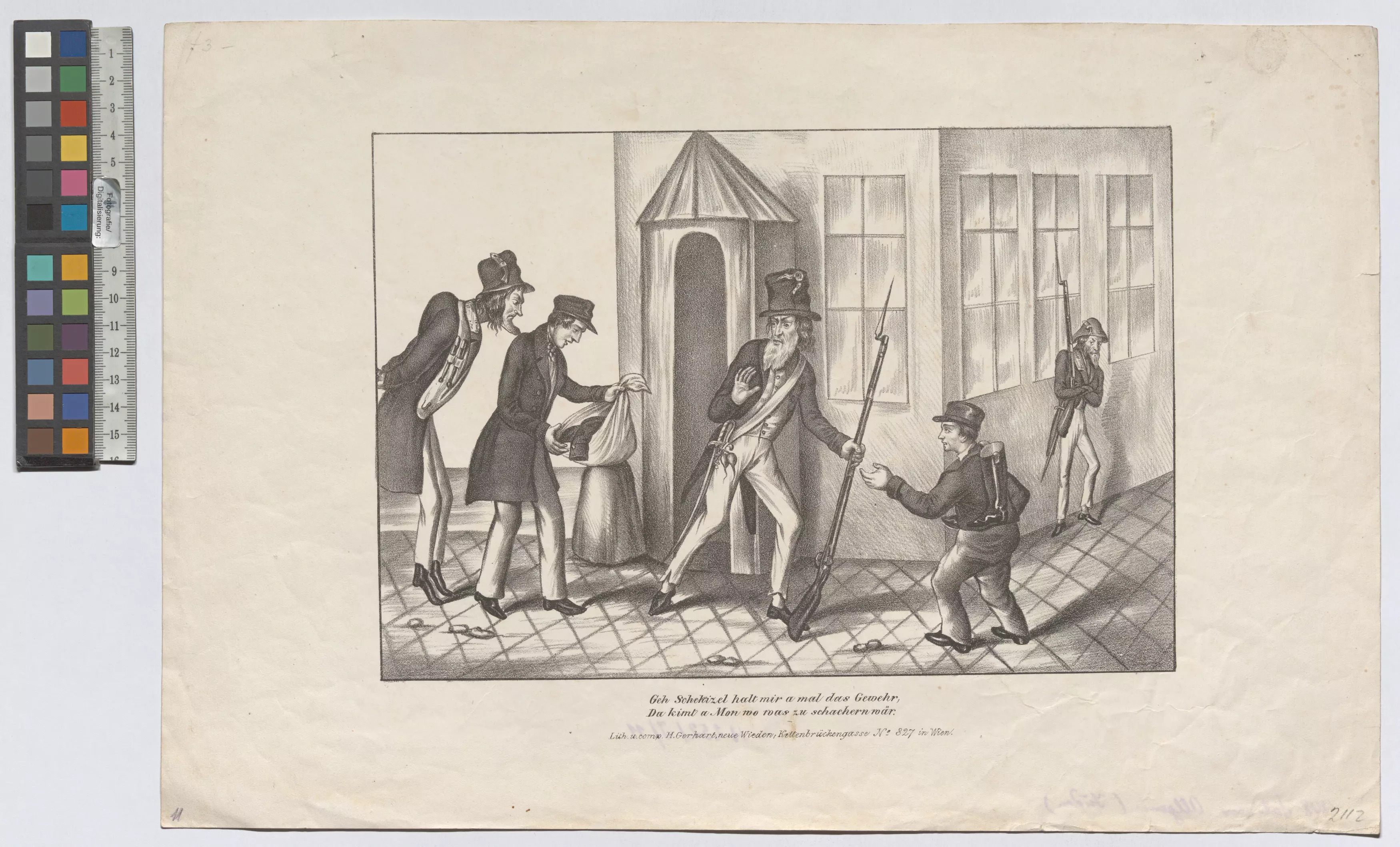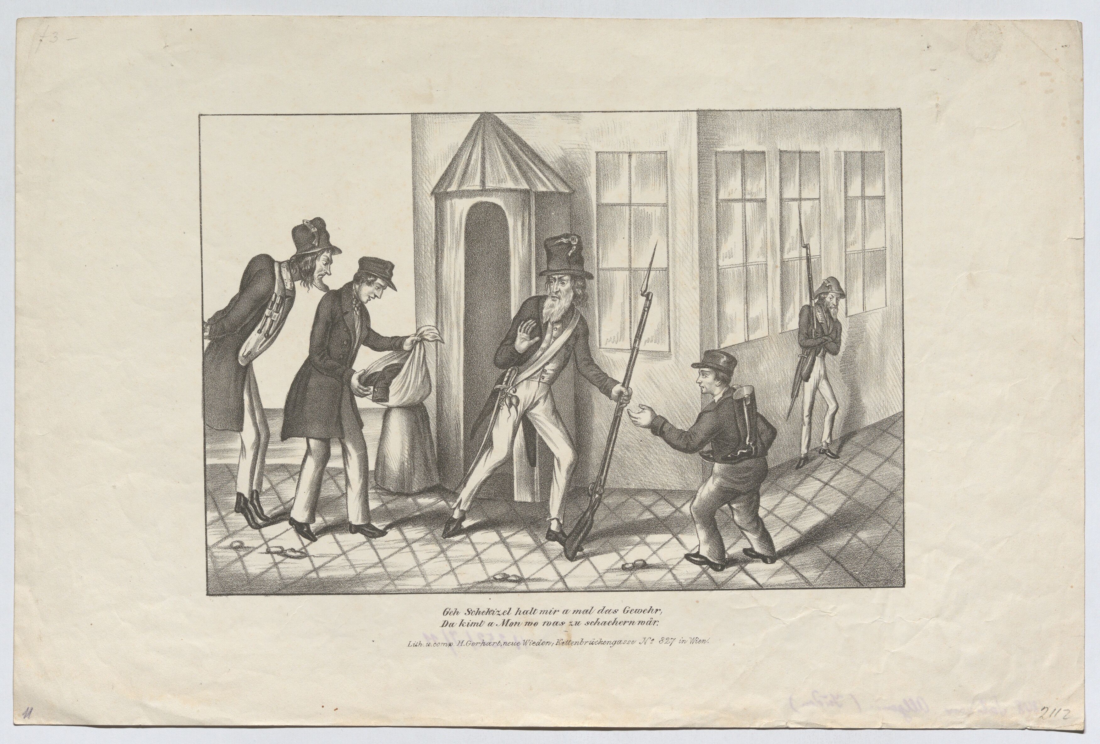 "Geh Schekizel halt mir a mal das Gewehr, / (...)" (Antisemitische Karikatur zur Revolution 1848)