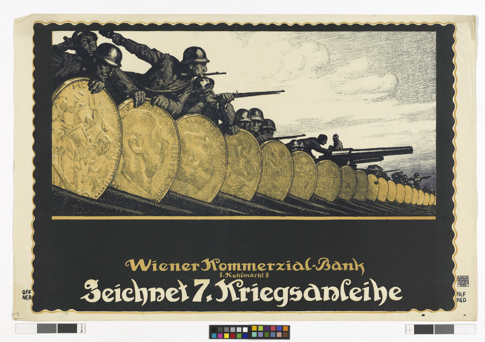 - Um an Geld für die Kriegsführung zu kommen, standen dem Staat zwei Möglichkeiten zur Verfügung: Man konnte Steuern erhöhen oder Geld von der Bevölkerung borgen. Österreich-Ungarn beschritt den zweiten Weg und legte im November 1914 die erste Kriegsanleihe auf, der bis 1918 in der österreichischen Reichshälfte sieben weitere folgen sollten. Insgesamt brachte man so 35 Milliarden Kronen auf. Für die Anleihen wurde ausgiebig und aggressiv geworben, es galt als „patriotische“ Pflicht, Kriegsanleihen zu zeichnen. Vor allem Arbeiter und Kleinbürger verloren dabei zum Teil ihr gesamtes Geldvermögen.