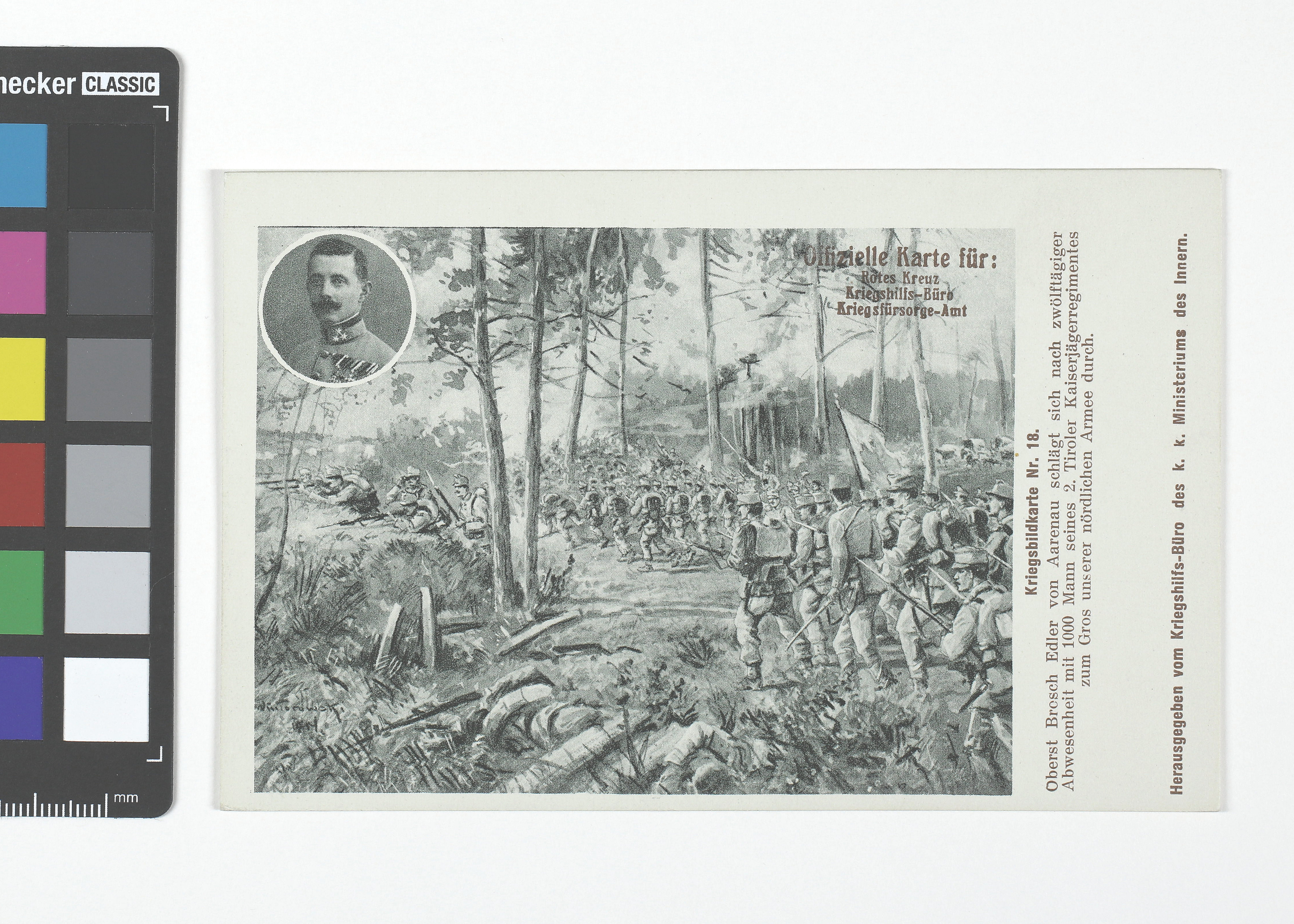 Kriegspostkarte: Kriegsbildkarte Nr. 18. Oberst Brosch Edler von Aarenau schlägt sich nach zwölftägiger Abwesenheit mit 1000 Mann seines 2. Tiroler Kaiserjägerregimentes zum Gros unserer nördlichen Armee durch. (Offizielle Karte für: Rotes Kreuz, Kriegshilfs-Büro, Kriegsfürsorge)