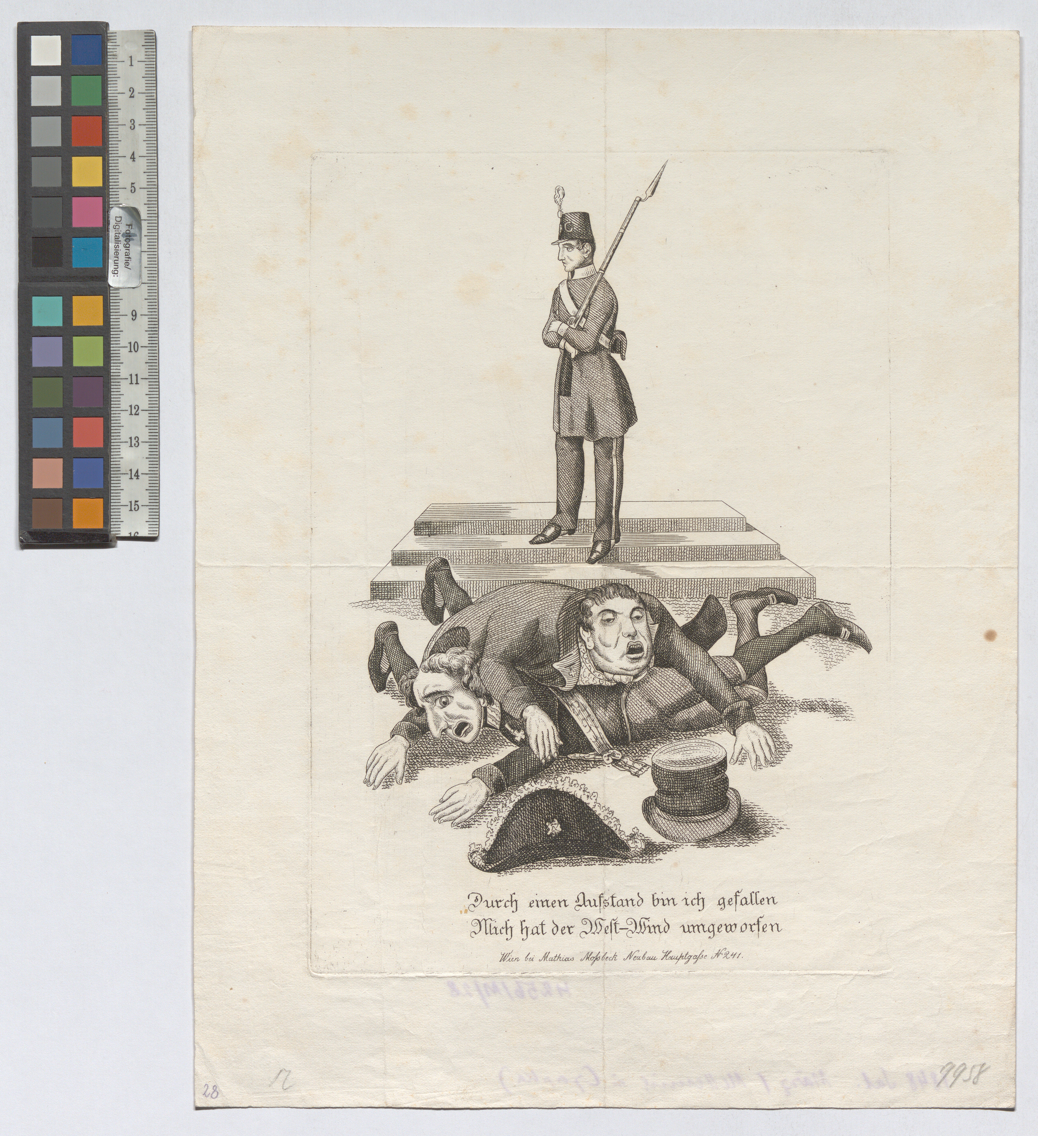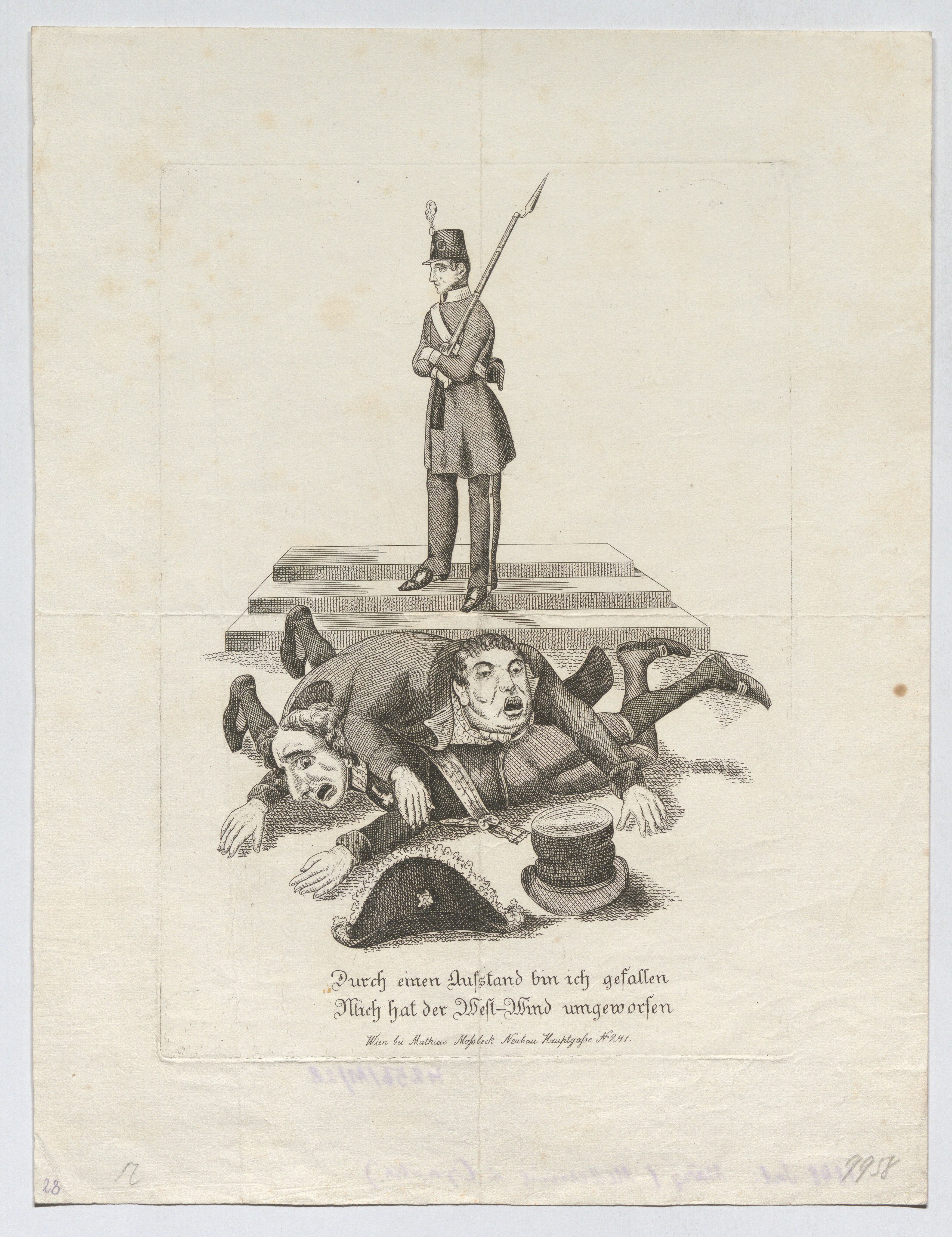 "Durch einen Aufstand bin ich gefallen / Mich hat der West-Wind umgeworfen" (Karikatur auf die Flucht Metternichs und Czapkas im März 1848)