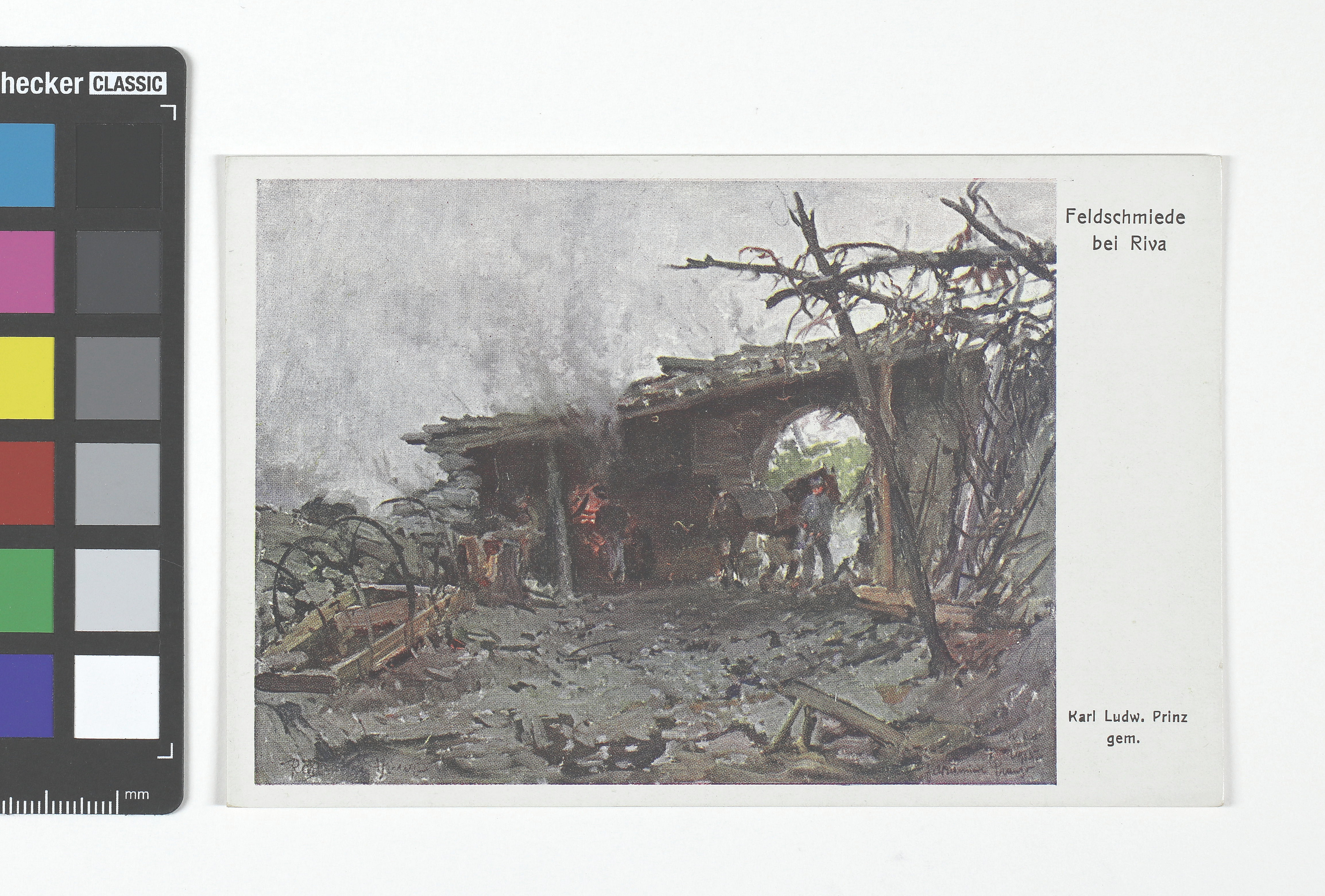- Kriegspostkarte vom südwestl. Kriegsschauplatz 1915 (Offizielle Karte zu Gunsten der Österr. Gesellschaft vom Roten Kreuz, des Kriegsfürsorgeamtes des k. u. k. Kriegsministeriums und des Kriegshilfsbüros des k. k. Ministeriums des Innern, Nr. 411; aus einer Serie von 10 Karten mit Motiven von Karl Ludwig Prinz (1. Serie), im Umschlag, zum Preis von 2 Kronen)