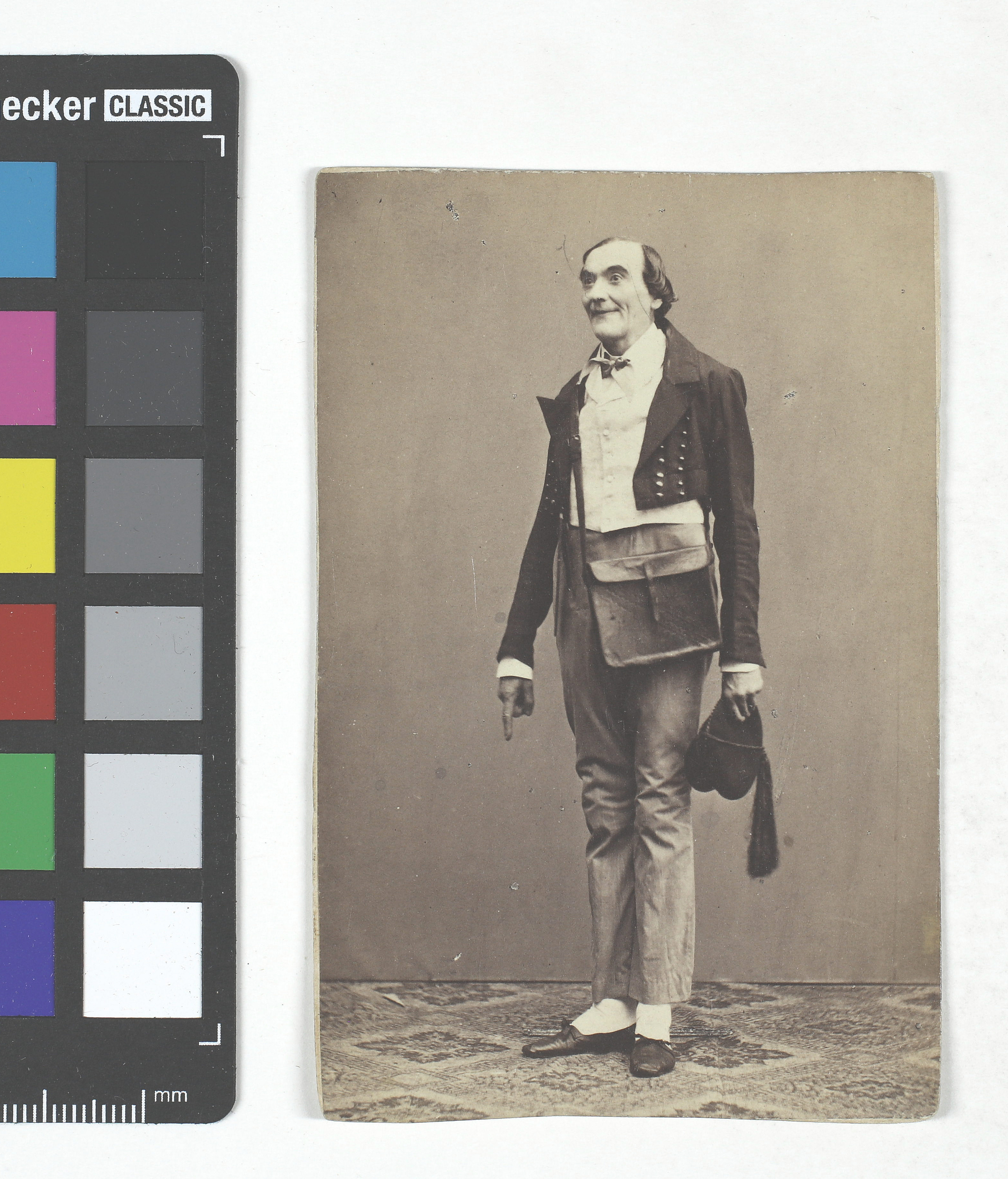Johann Nestroy (1801-1862) als "Willibald Schnabel" in "Die schlimmen Buben in der Schule" von Johann Nestroy (aus dem "Nestroy-Album" von 1862)