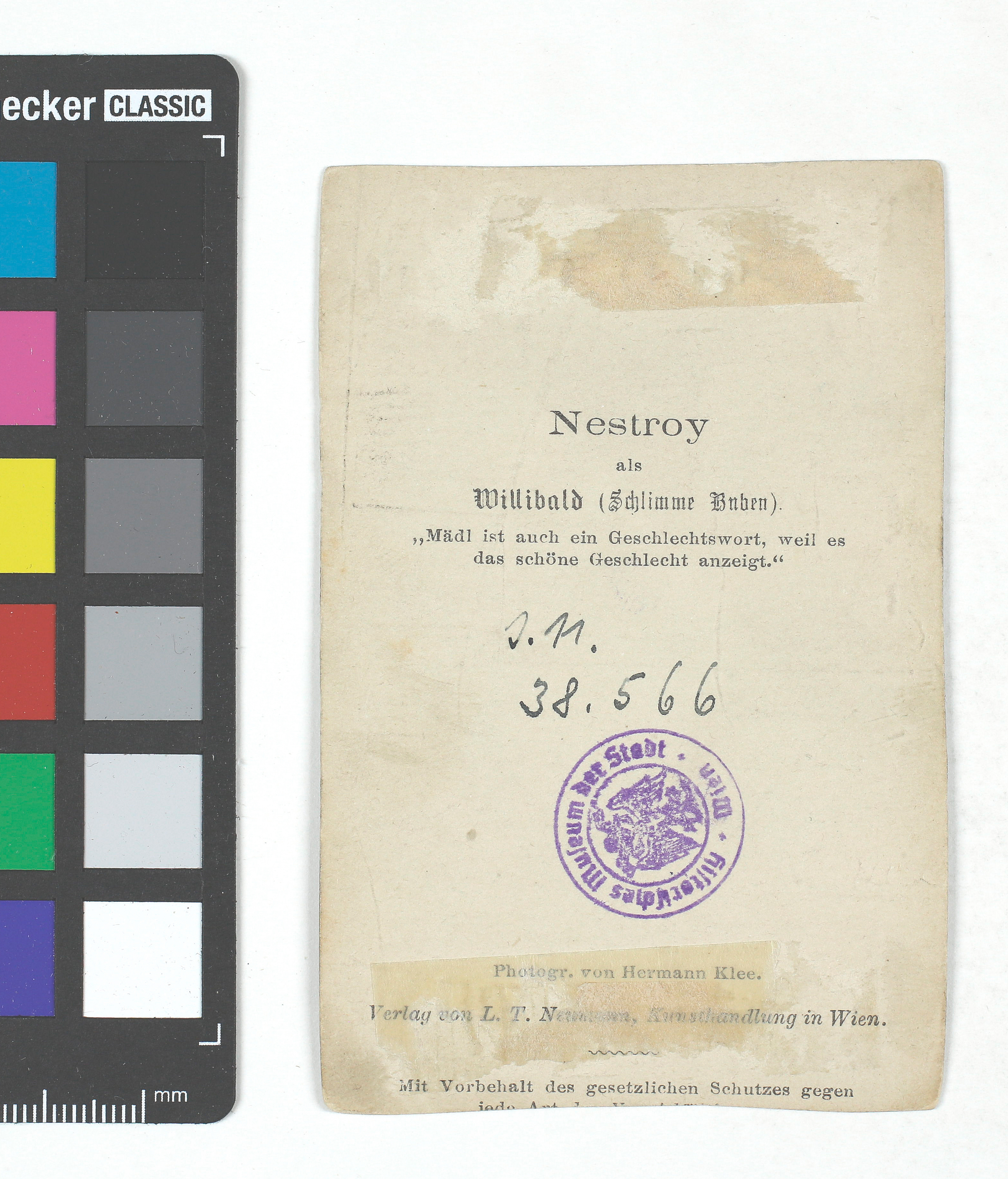 - Johann Nestroy. Ausstellung anlässlich der 100. Wiederkehr seines Todestages, Hauptautor: Erna Felmayer, Gertrude Wernigg, 1962, Abb. S. Abb. 16, Kat.-Nr. 189