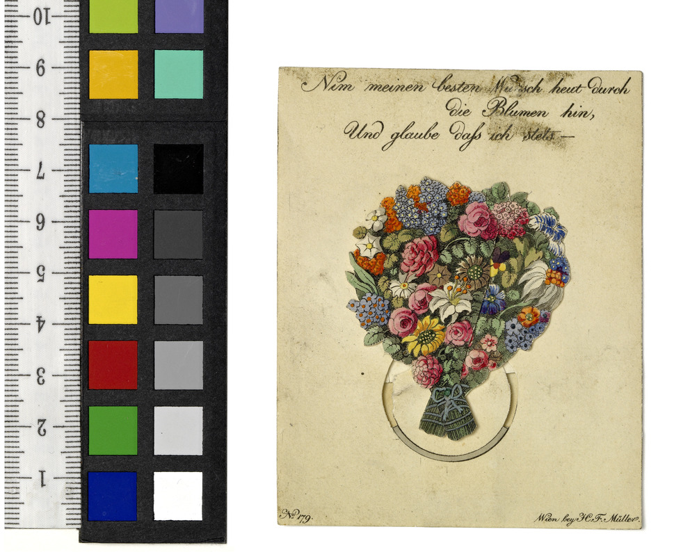 Freundschaftsglückwunschkarte (Drehscheibenkarte) aus dem Wiener Verlag Heinrich Friedrich Müller. Spruch: "Nimm meinen besten Wunsch heut durch / die Blumen hin, / Und glaube , daß ich stets - / die treu'ste Freundinn bin!"